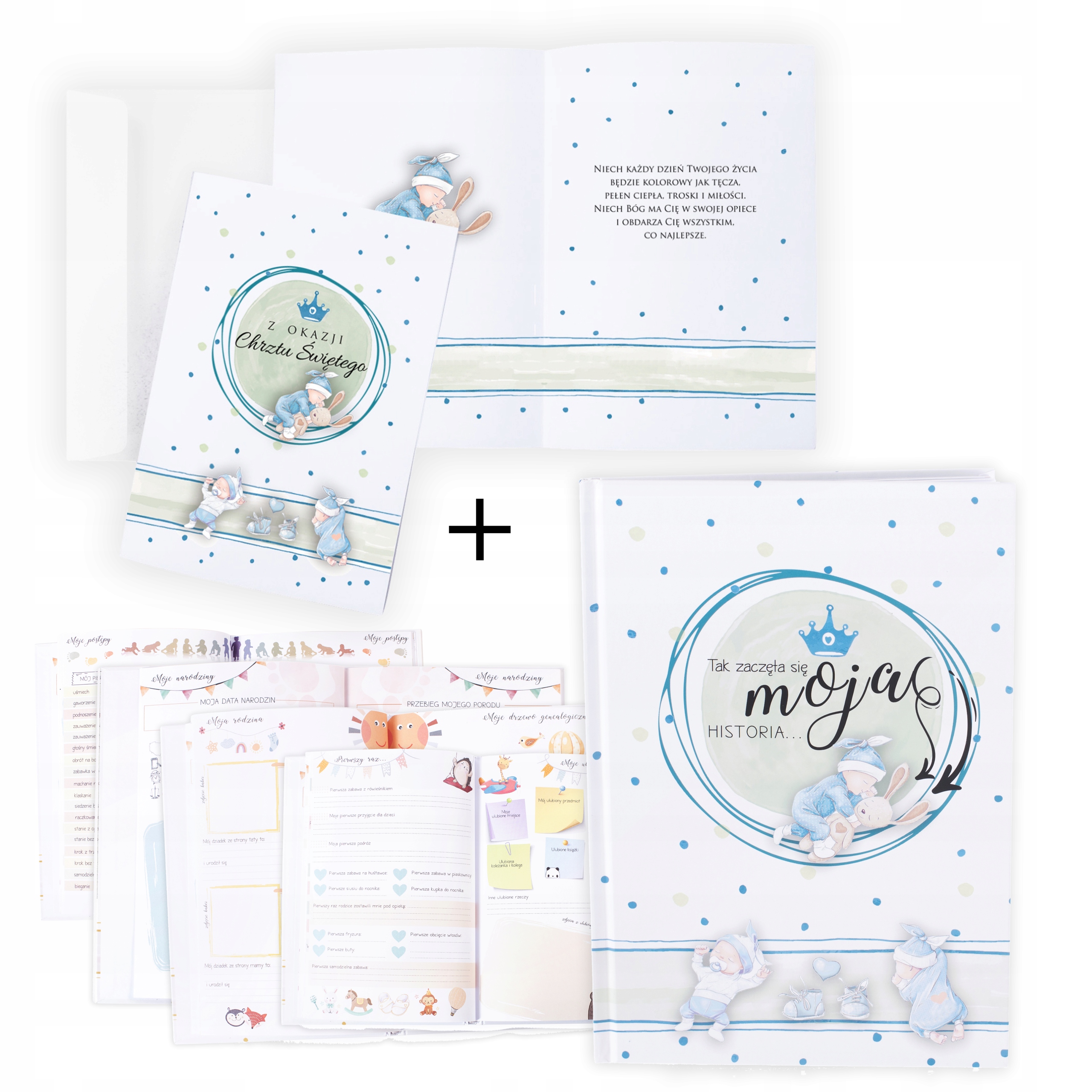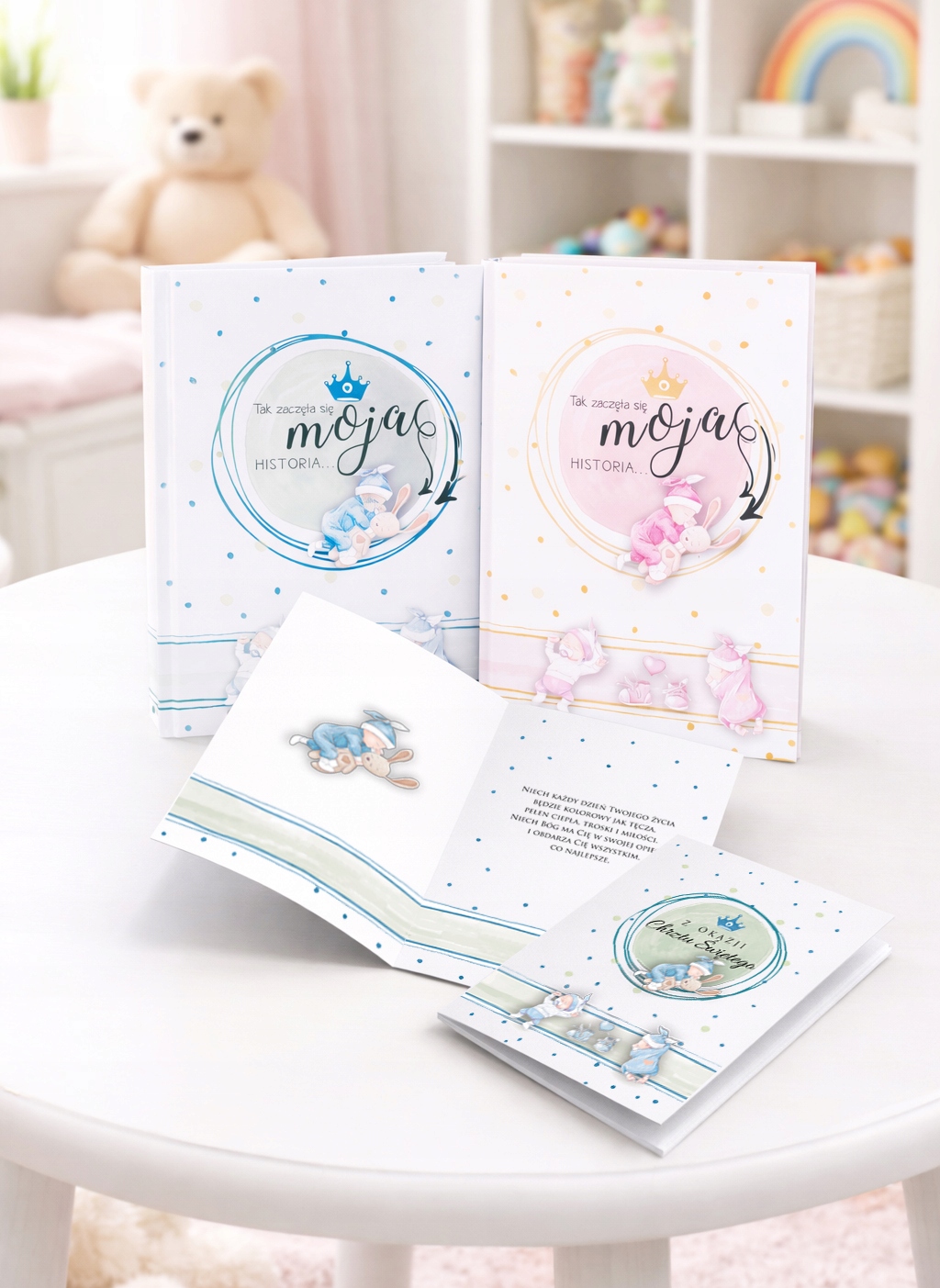 Wyjątkowy zestaw pamiątkowy składający się z eleganckiej książki „Tak zaczęła się moja historia” oraz dopasowanej kartki okolicznościowej. To piękna i ponadczasowa pamiątka najważniejszych chwil z pierwszych lat życia dziecka.