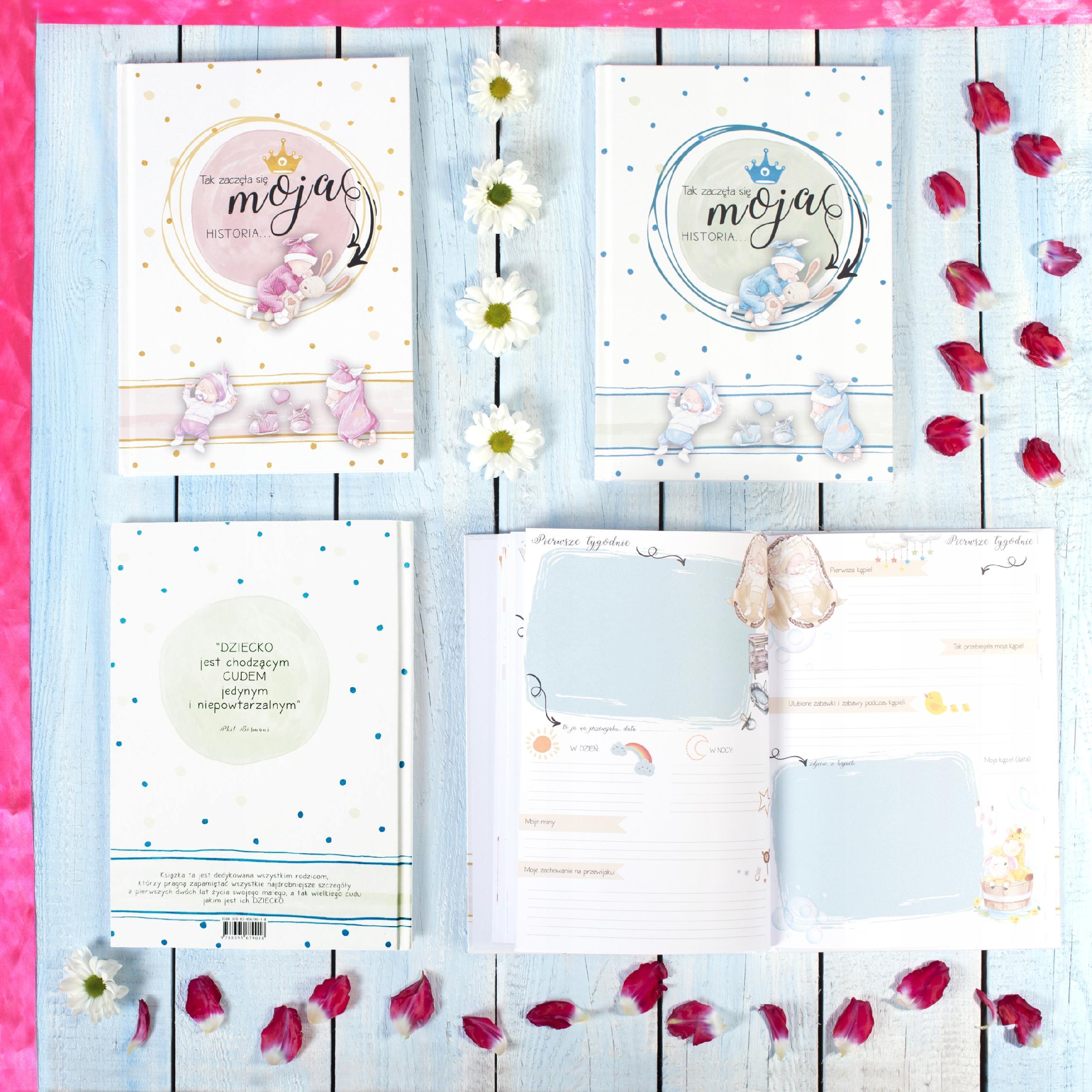 - KSIĄŻKA „Moja historia” – piękny dziennik do wypełnienia przez rodziców, pełen miejsca na wspomnienia, zdjęcia i ważne chwile z pierwszych lat życia. To wyjątkowa księga pamiątkowa, która z czasem stanie się bezcenną rodzinną kroniką.