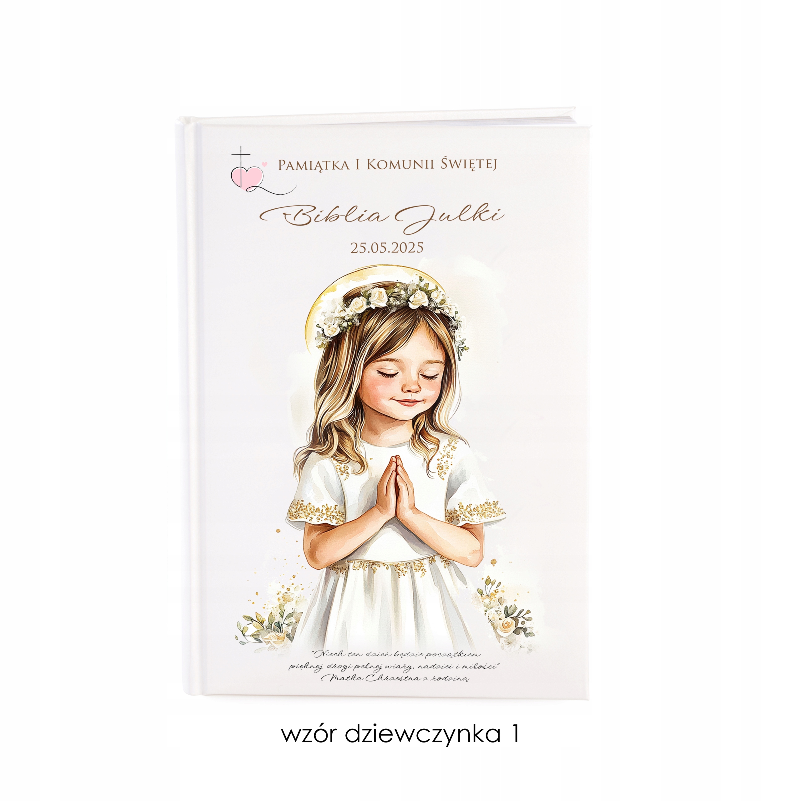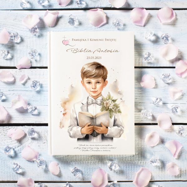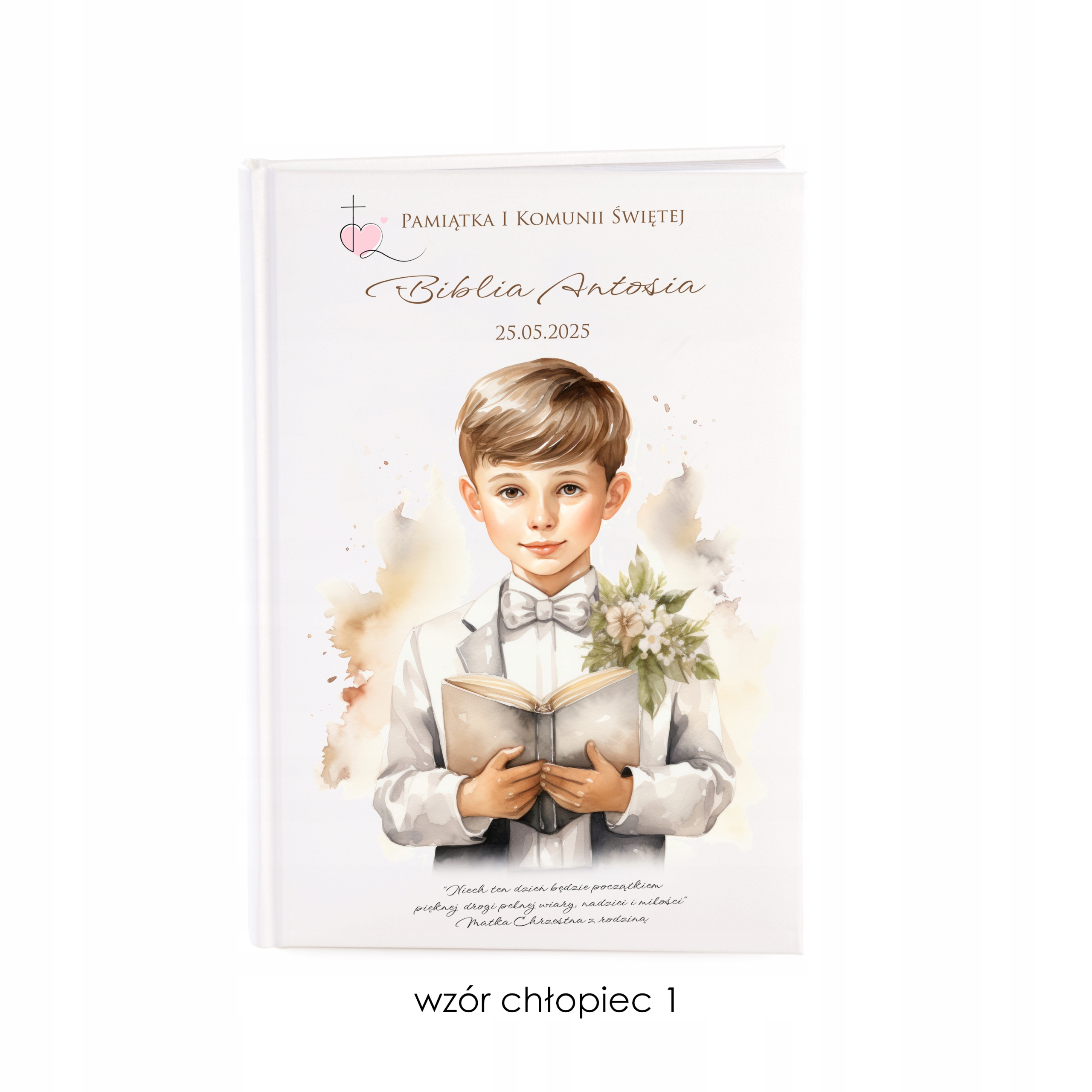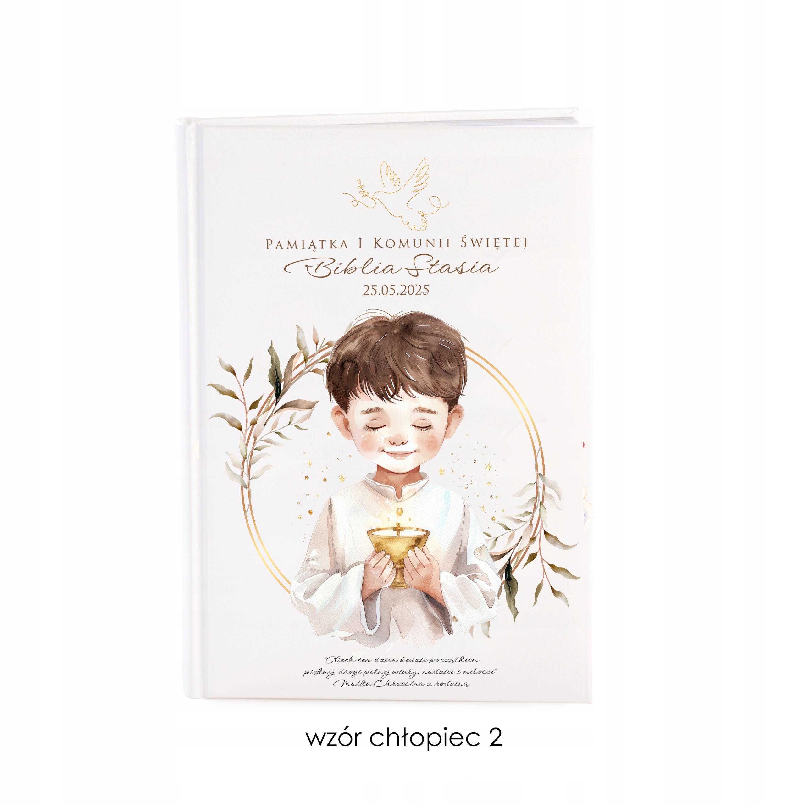 Szukasz wyjątkowego upominku, pamiątki z okazji I Komunii Świętej, który będzie odznaczał się subtelnością i elegancją? Taka jest nasza biblia z wizerunkiem chłopca lub dziewczynki przystępujących do sakramentu Komunii Świętej. Biblia zachwyca wysokiej jakości nadrukiem UV. Jest idealną pamiątką z uroczystości Komunii Świętej.