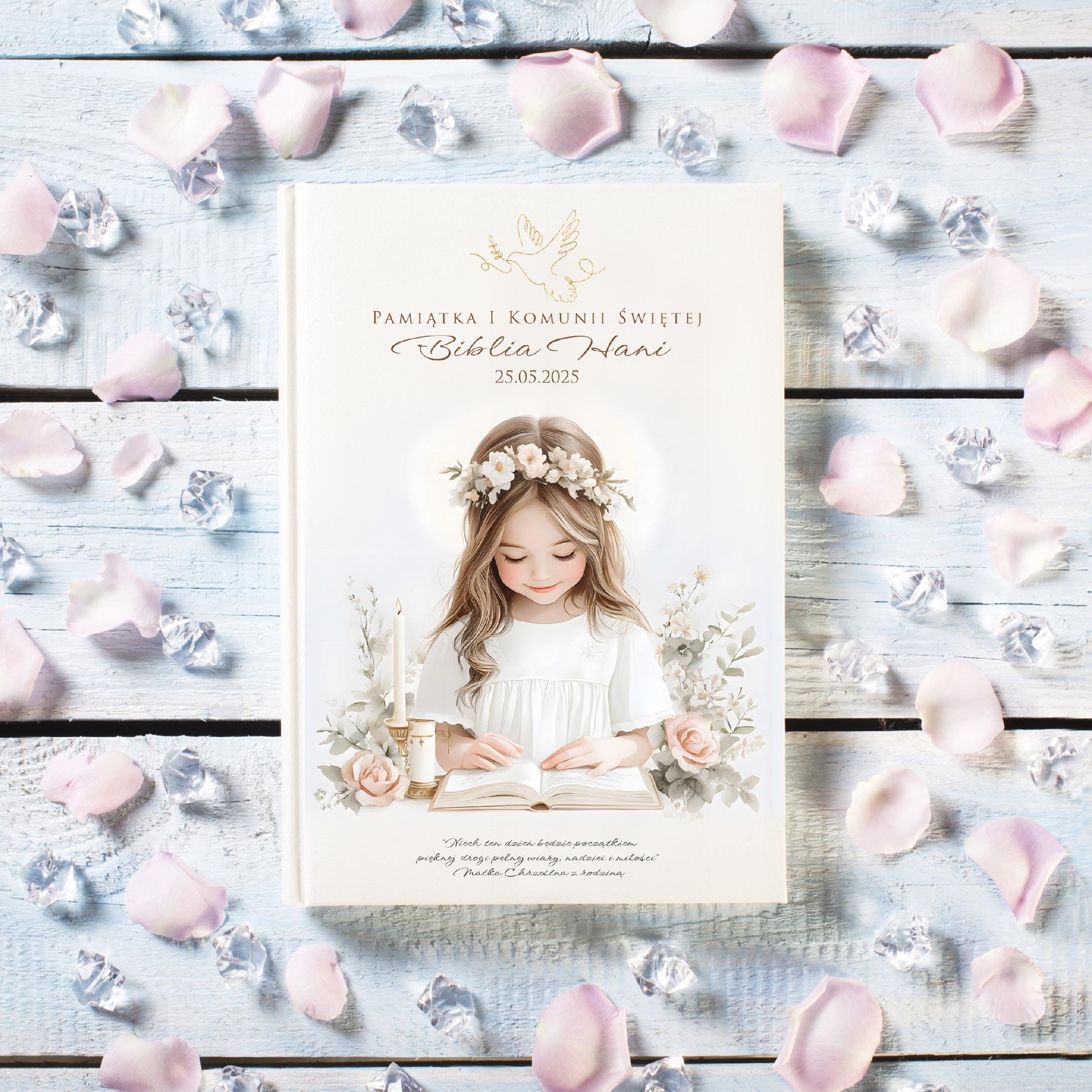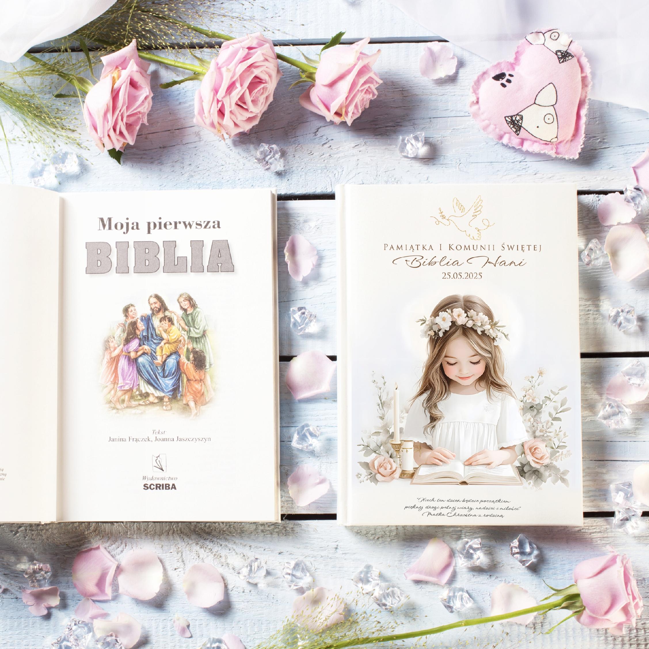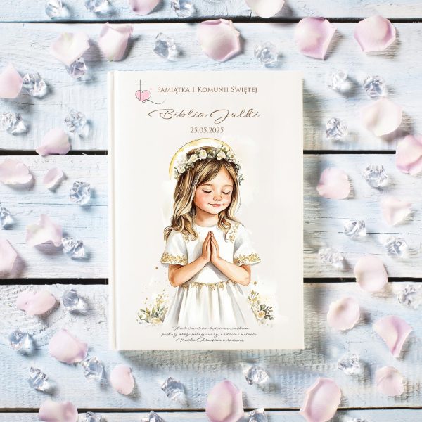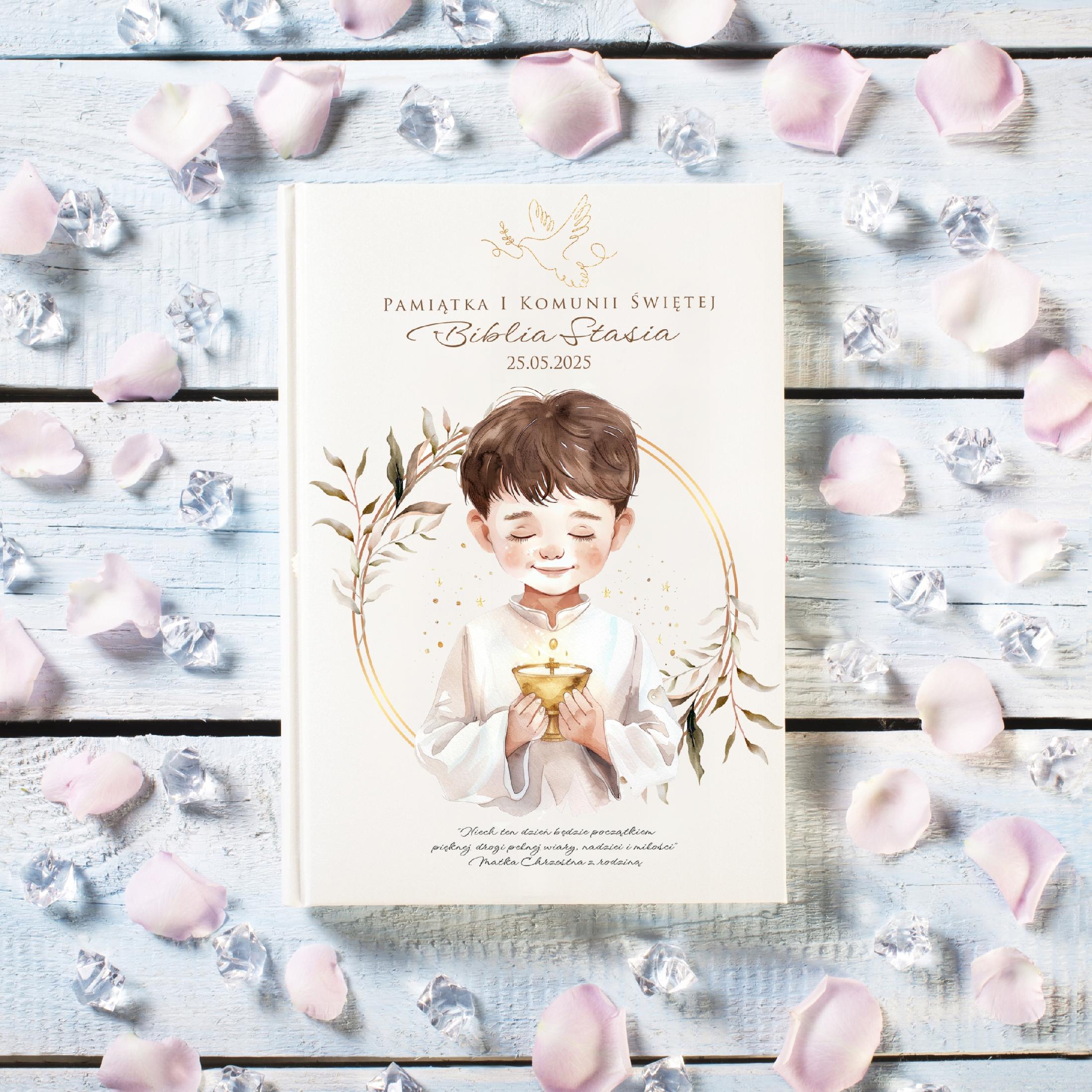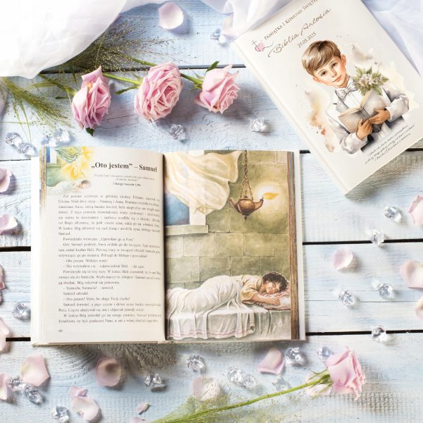 Szukasz wyjątkowego upominku, pamiątki z okazji I Komunii Świętej, który będzie odznaczał się subtelnością i elegancją? Taka jest nasza biblia z wizerunkiem chłopca lub dziewczynki przystępujących do sakramentu Komunii Świętej. Biblia zachwyca wysokiej jakości nadrukiem UV. Jest idealną pamiątką z uroczystości Komunii Świętej.