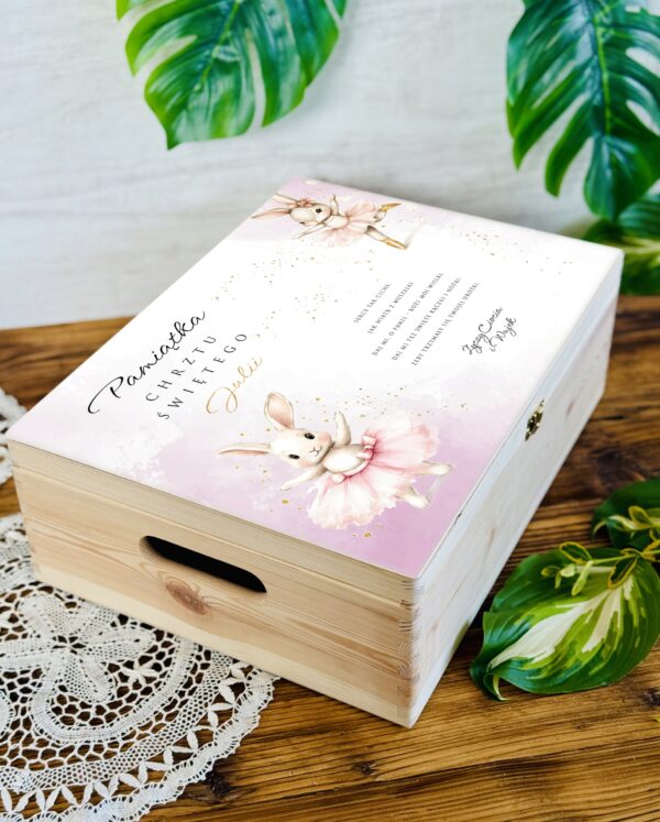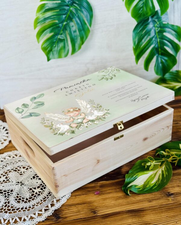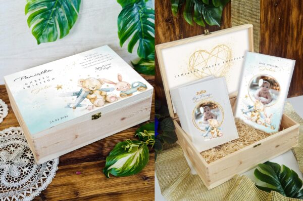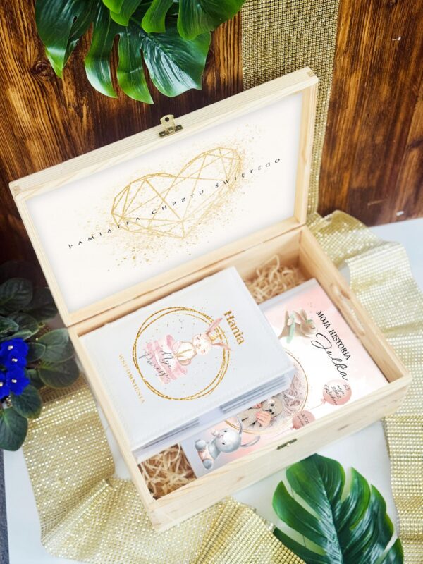 ♥️Szukasz wyjątkowego, ponadczasowego prezentu na Chrzest Święty? Nasza drewniana skrzynia z nadrukiem to niezwykła pamiątka, która pozostanie z dzieckiem na długie lata. Wykonana z naturalnego drewna, ozdobiona delikatnym, trwałym nadrukiem – tworzy elegancki i wzruszający upominek, idealny dla chłopca lub dziewczynki.