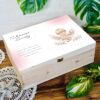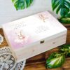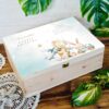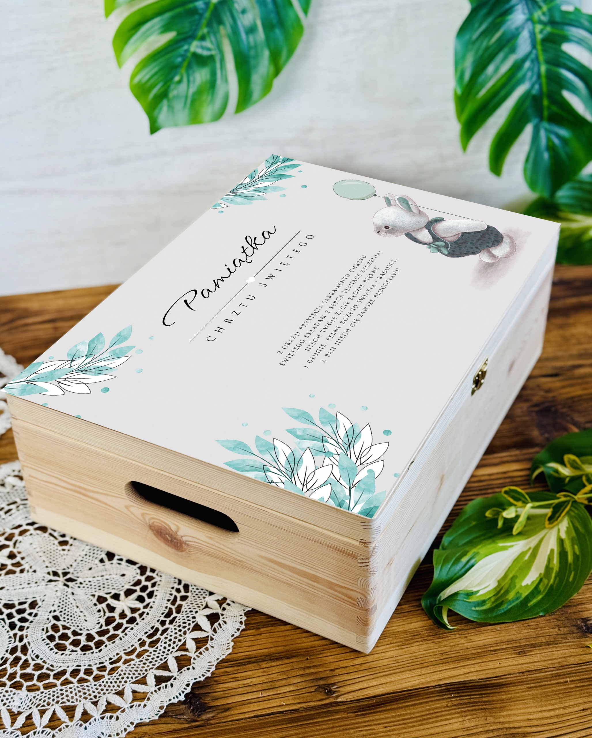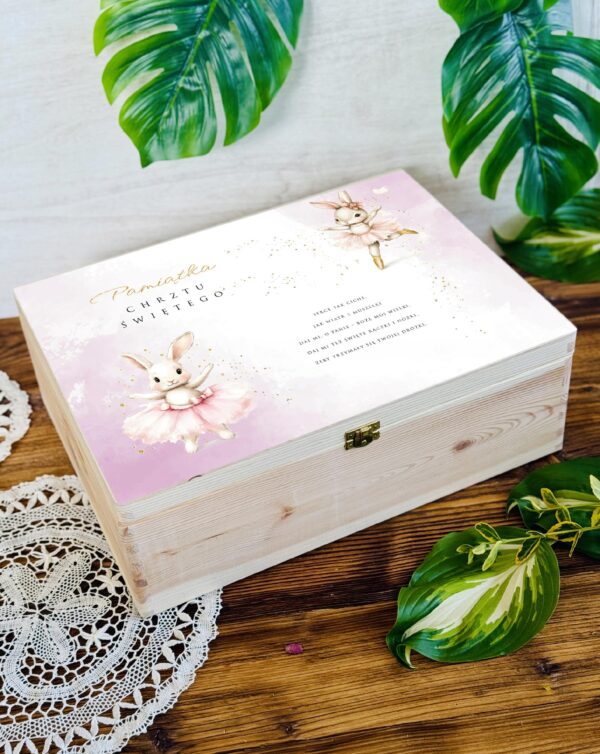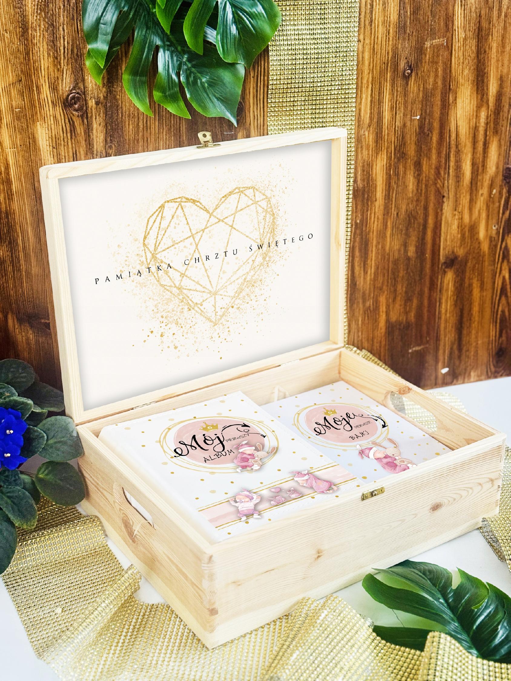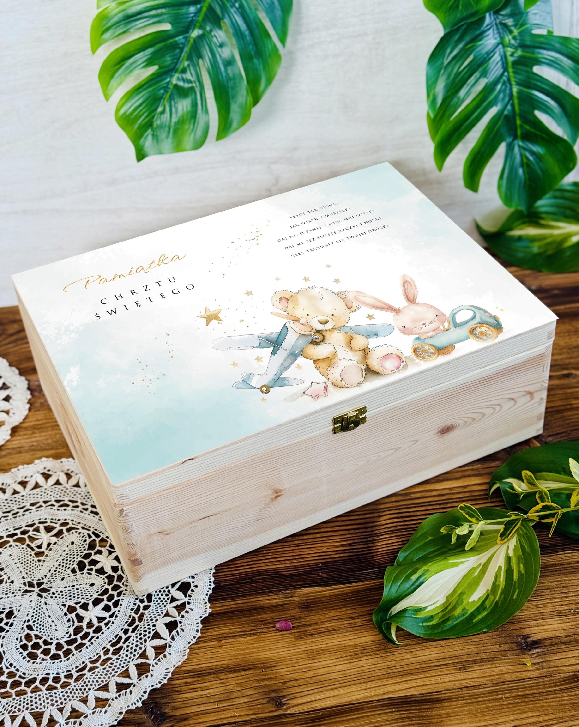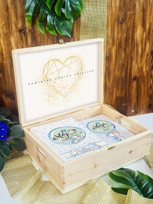 Nasza drewniana skrzynia z nadrukiem to niezwykła pamiątka, która pozostanie z dzieckiem na długie lata. Wykonana z naturalnego drewna, ozdobiona delikatnym, trwałym nadrukiem – tworzy elegancki i wzruszający upominek, idealny dla chłopca lub dziewczynki.