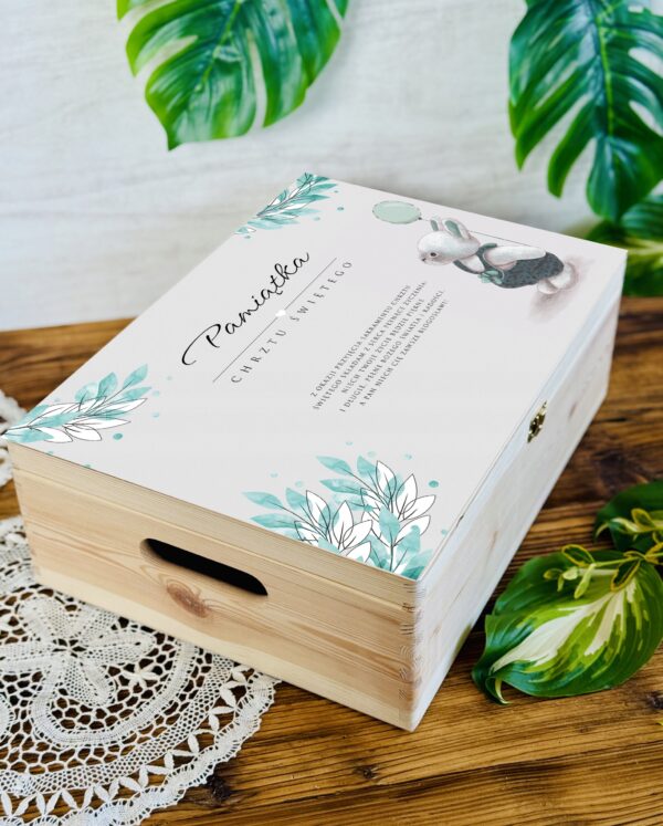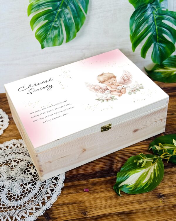 - Wewnątrz skrzyni, na wieku wklejona grafika z napisem “Pamiątka Chrztu Świętego”