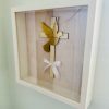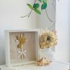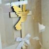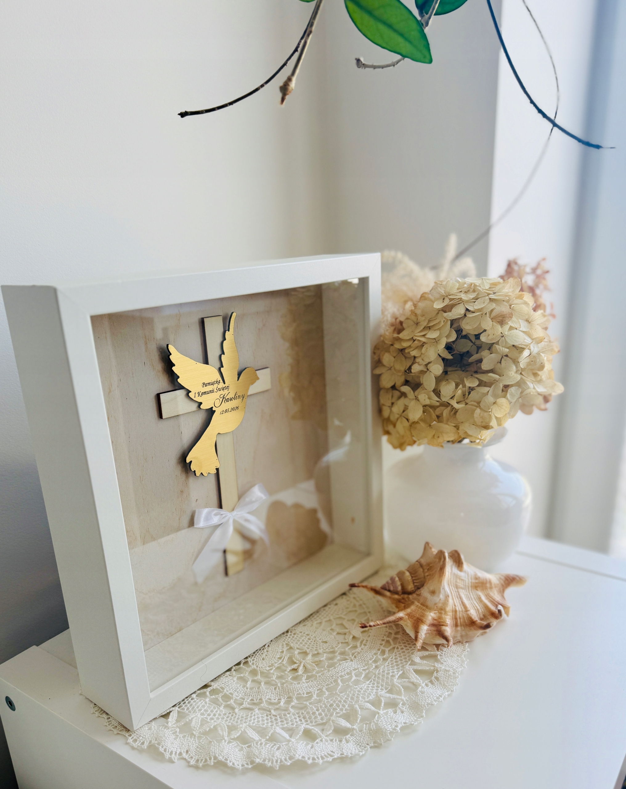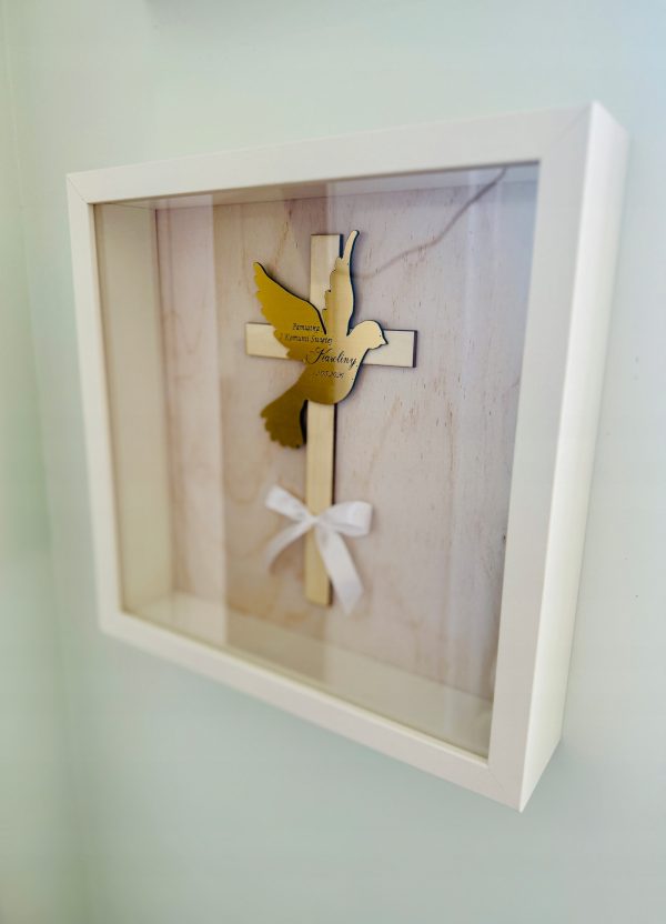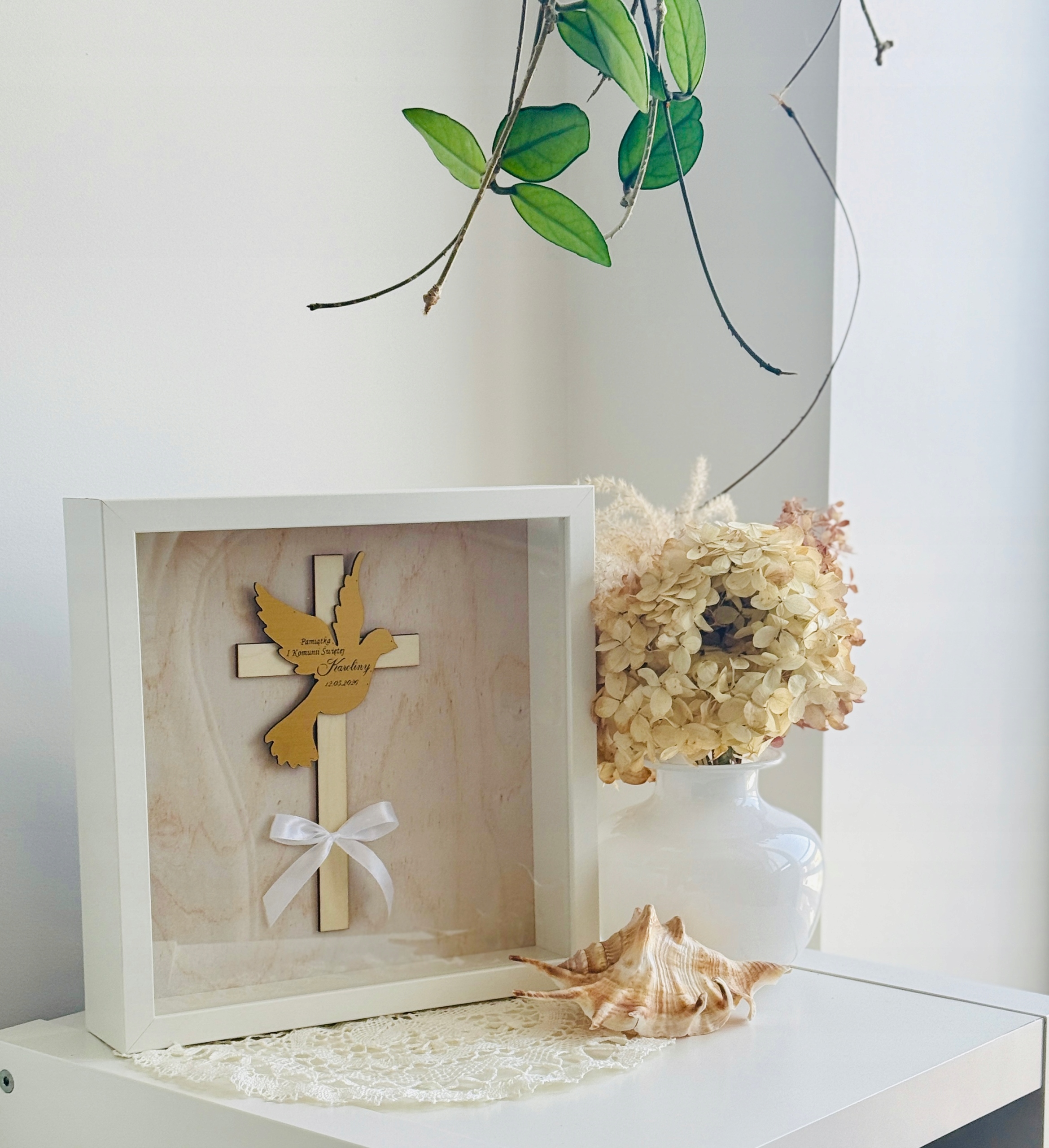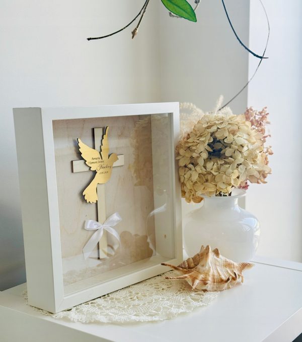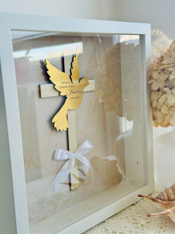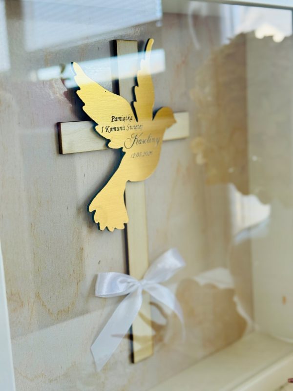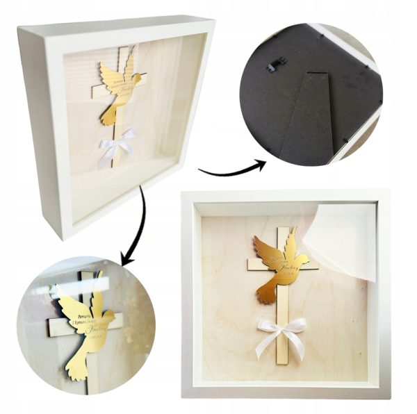 ✅ kolor ramki biały, krzyż wycinany laserowo z drewnianej sklejki, gołębica wycinana laserowo ze złotej plexi