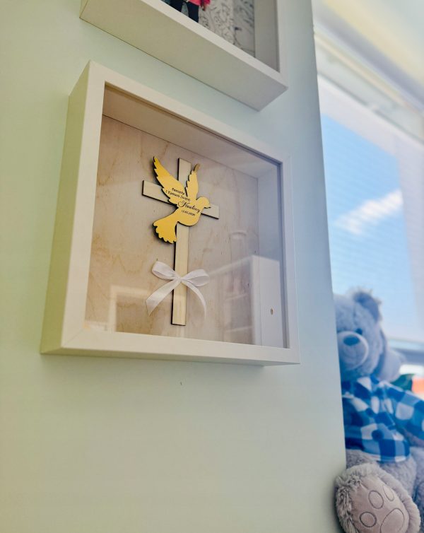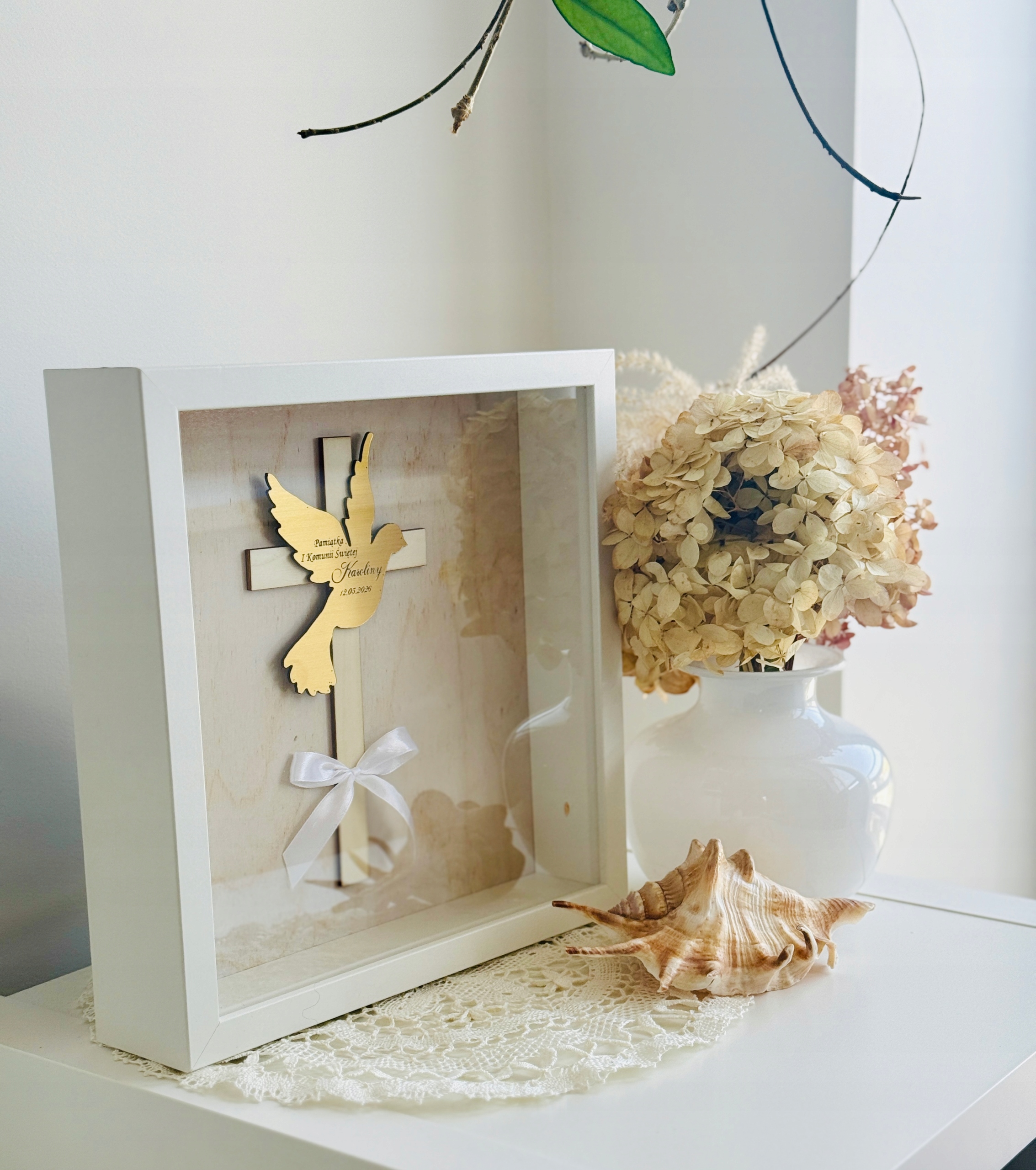 Szukasz wyjątkowego prezentu z okazji I Komunii Świętej, który będzie odznaczał się subtelnością i elegancją? Taka jest nasza ramka 3D z krzyżem i gołębicą. Zachwyca swoim blaskiem poprzez nadruk na złotej plexi, a efekt 3D nadaje jej jeszcze większego uroku. Grafika idealna jako prezent na Pierwszą Komunię Świętą. Ramka może być postawiona lub powieszona na ścianie co daje wiele możliwości jej zastosowania. Personalizacja w postaci imienia dziecka i daty uroczystości nadaje jej jeszcze większej oryginalności i indywidualności.