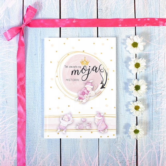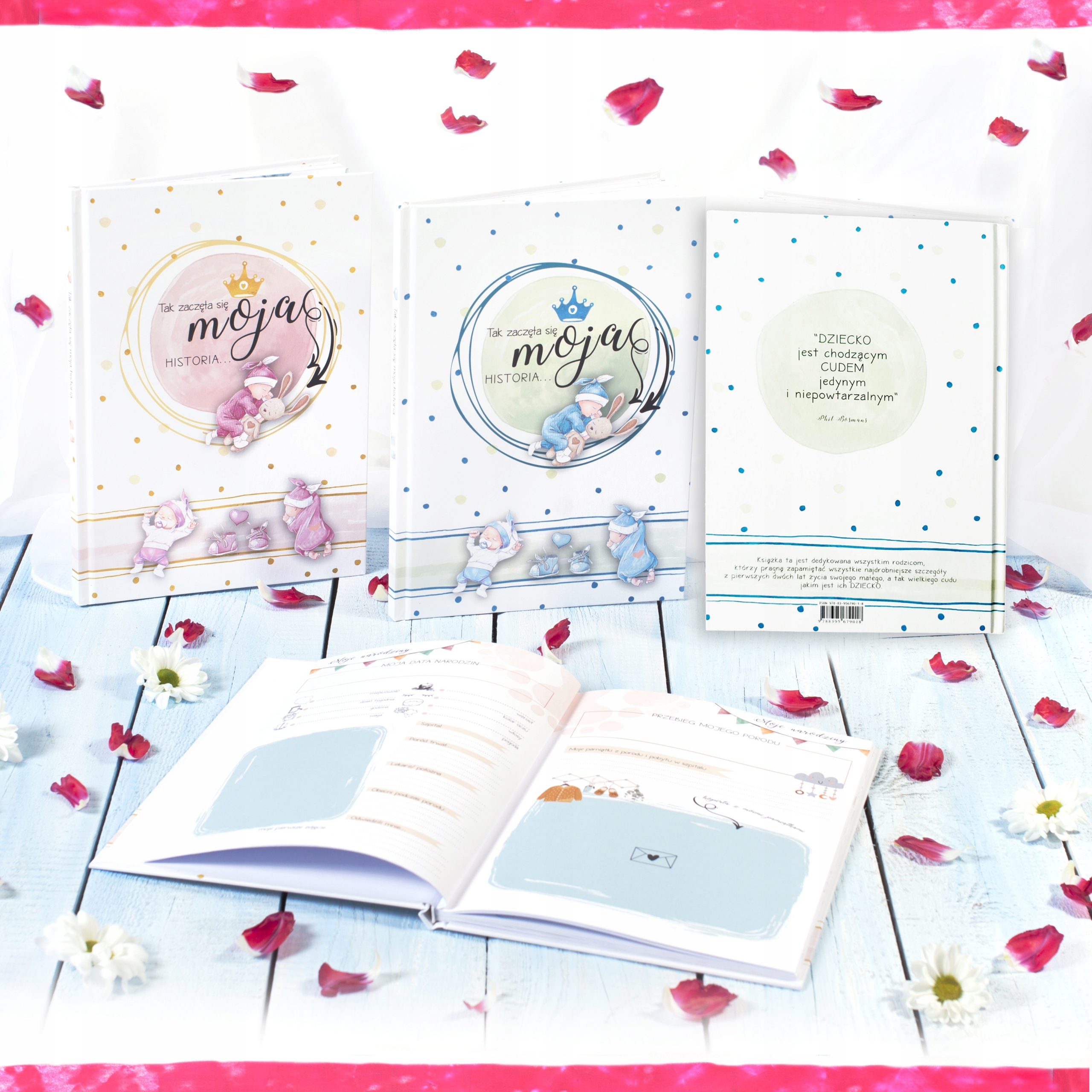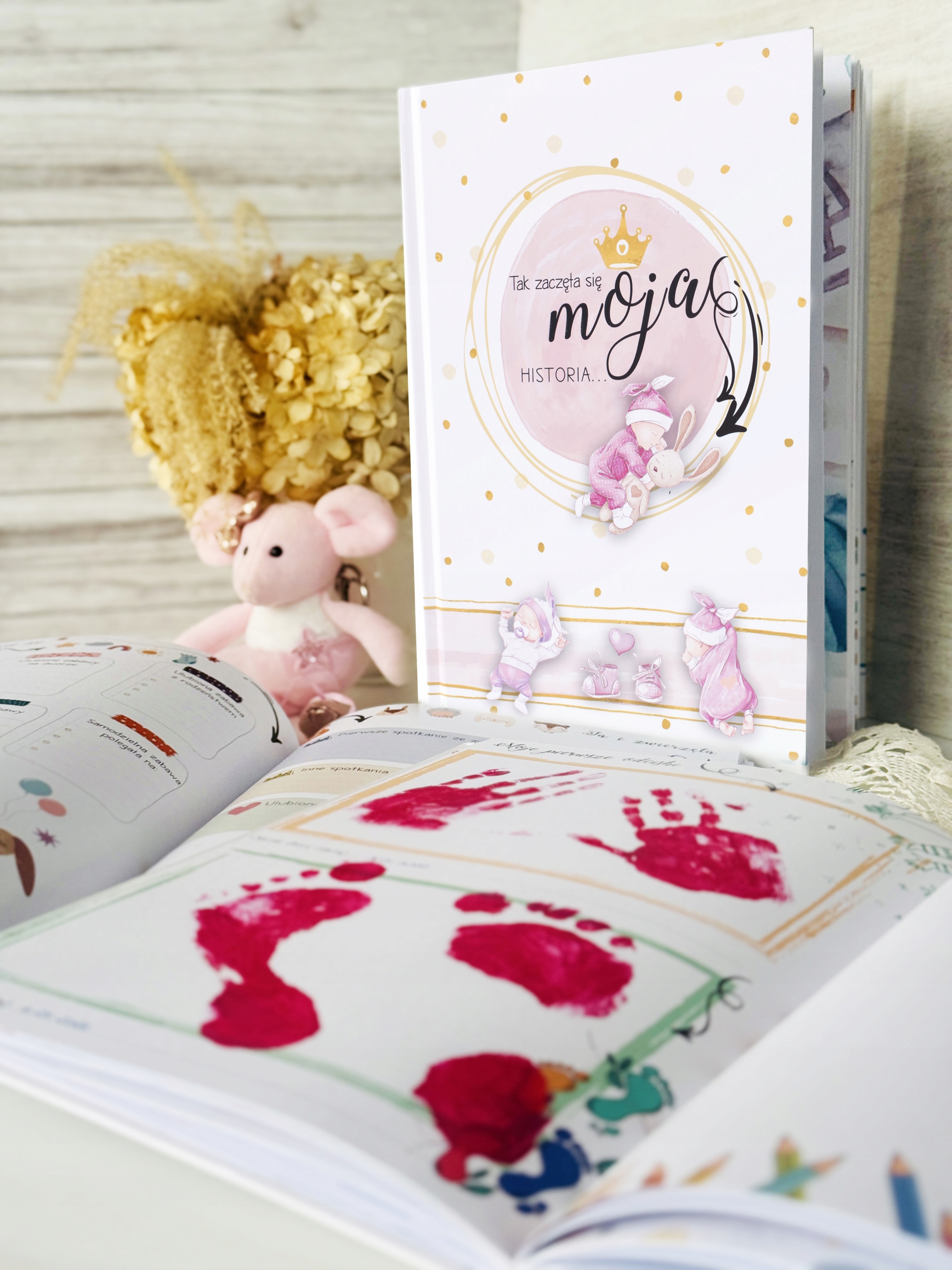 • KSIĄŻKA „Moja historia” – piękny dziennik do wypełnienia przez rodziców, pełen miejsca na wspomnienia, zdjęcia i ważne chwile z pierwszych lat życia. To wyjątkowa księga pamiątkowa, która z czasem stanie się bezcenną rodzinną kroniką.