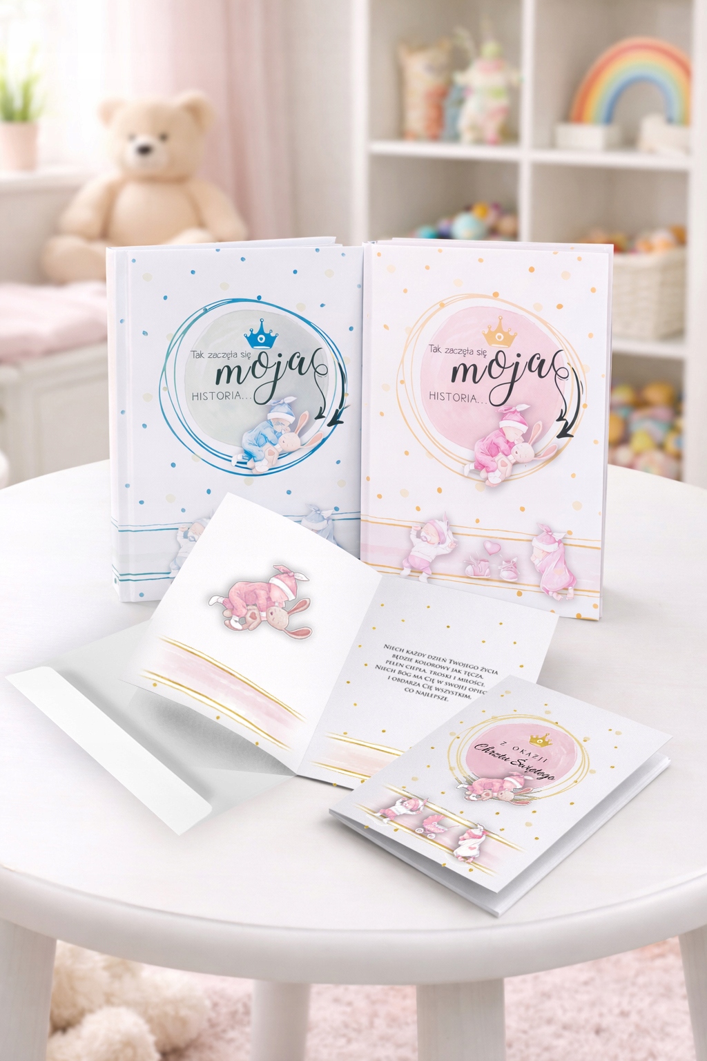 Wyjątkowy zestaw pamiątkowy składający się z eleganckiej książki „Tak zaczęła się moja historia” oraz dopasowanej kartki okolicznościowej. To piękna i ponadczasowa pamiątka najważniejszych chwil z pierwszych lat życia dziecka.