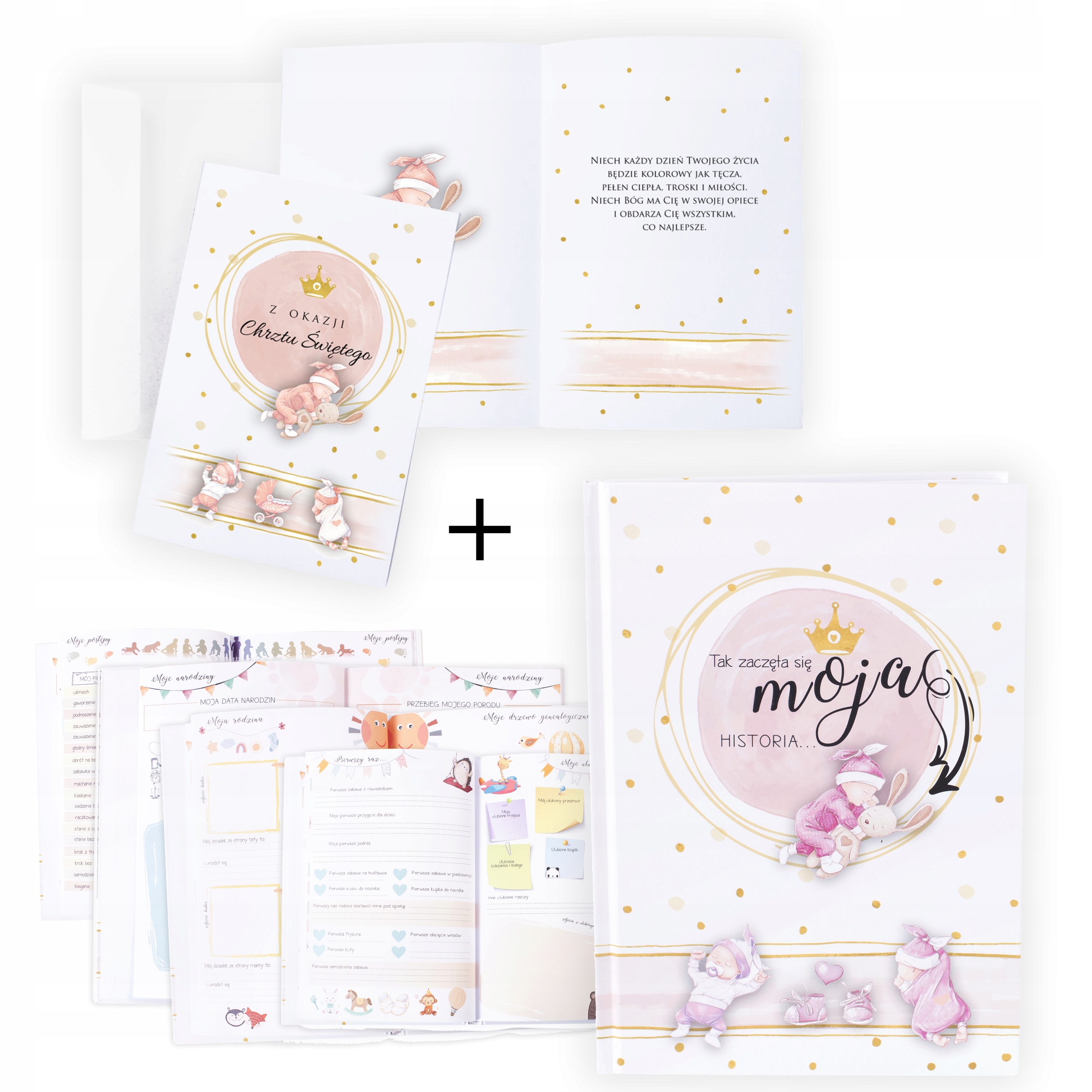 PIERWSZA KSIĄŻKA o mnie ALBUM + KARTKA zestaw PREZENT chrzest urodziny ROK