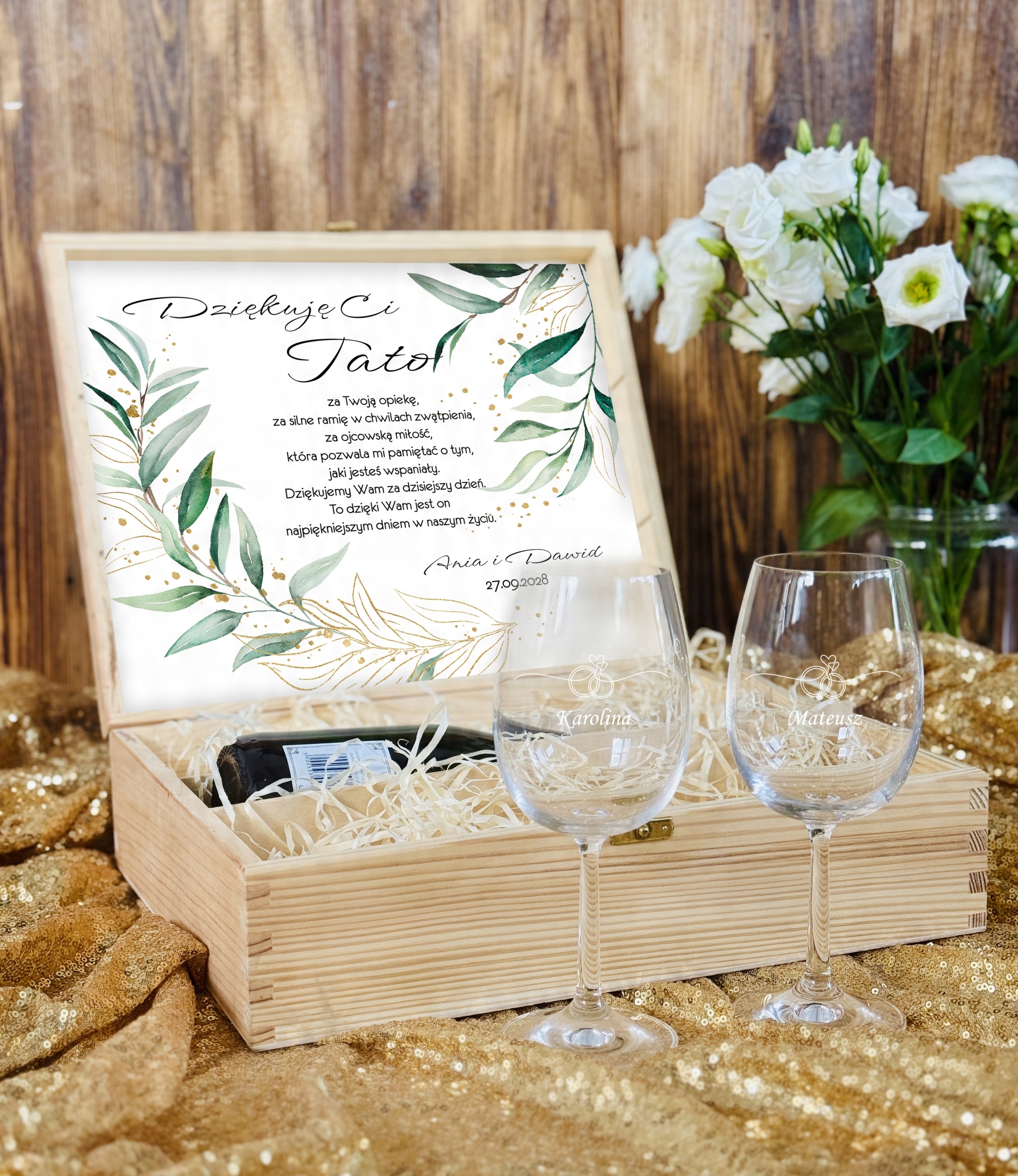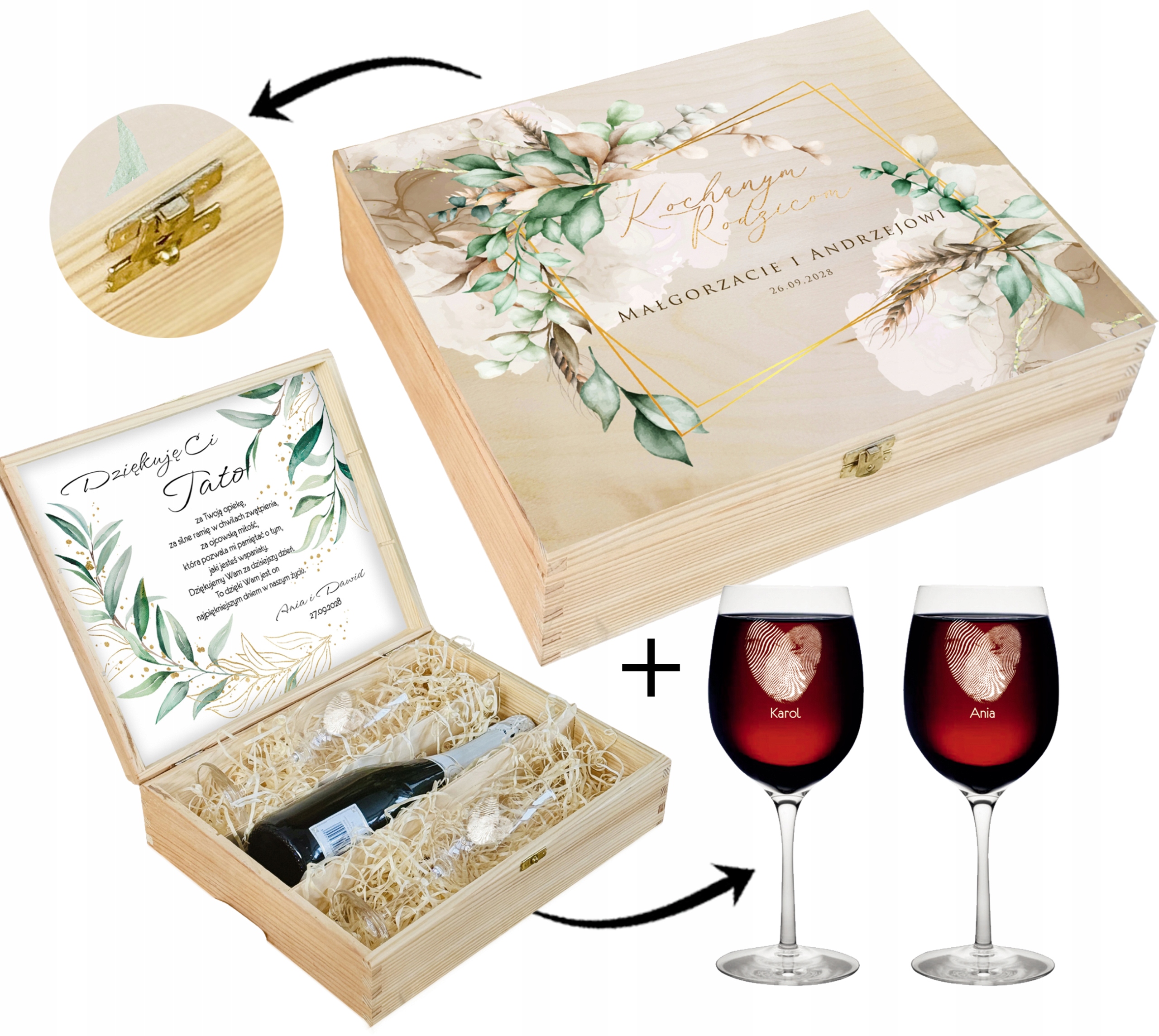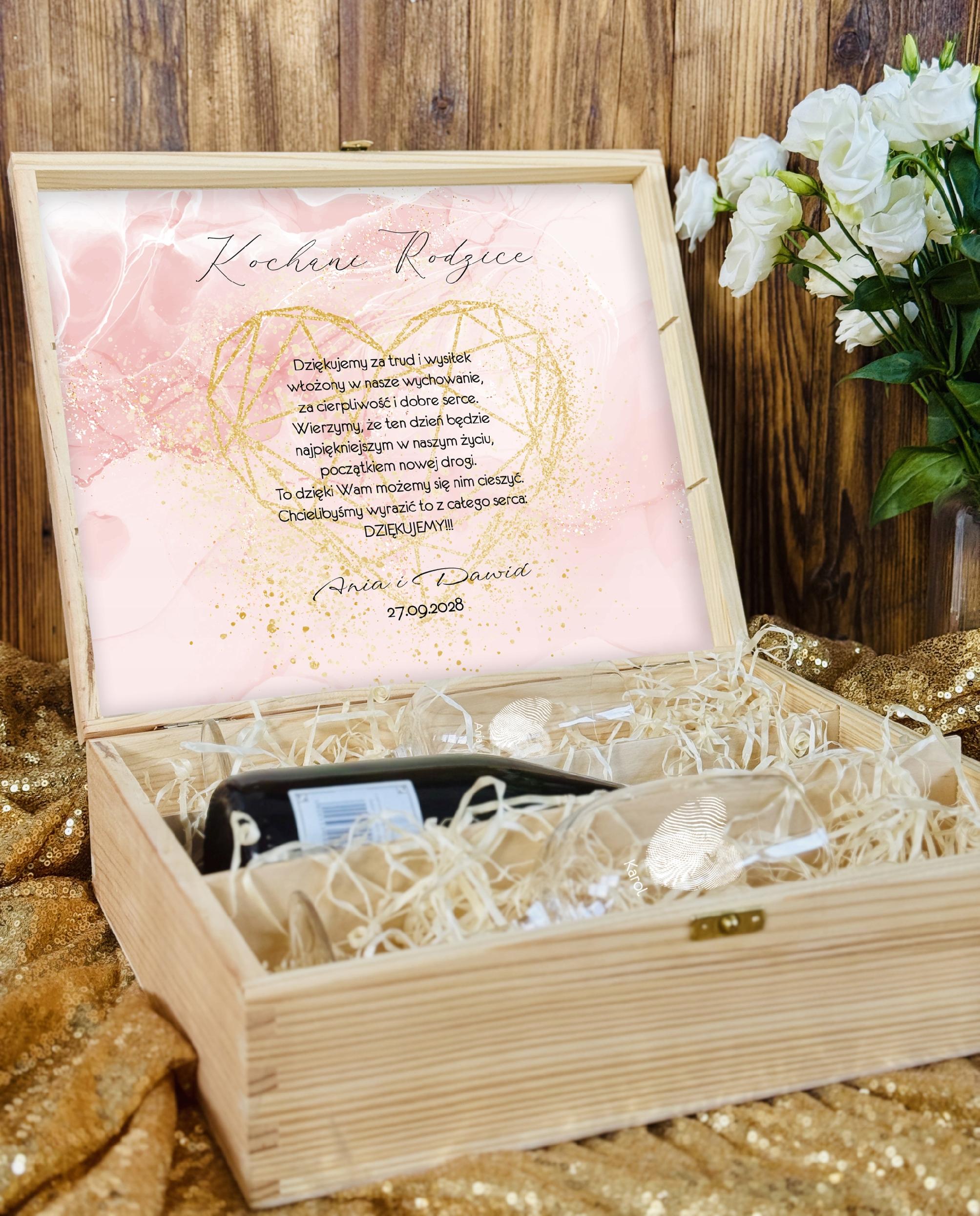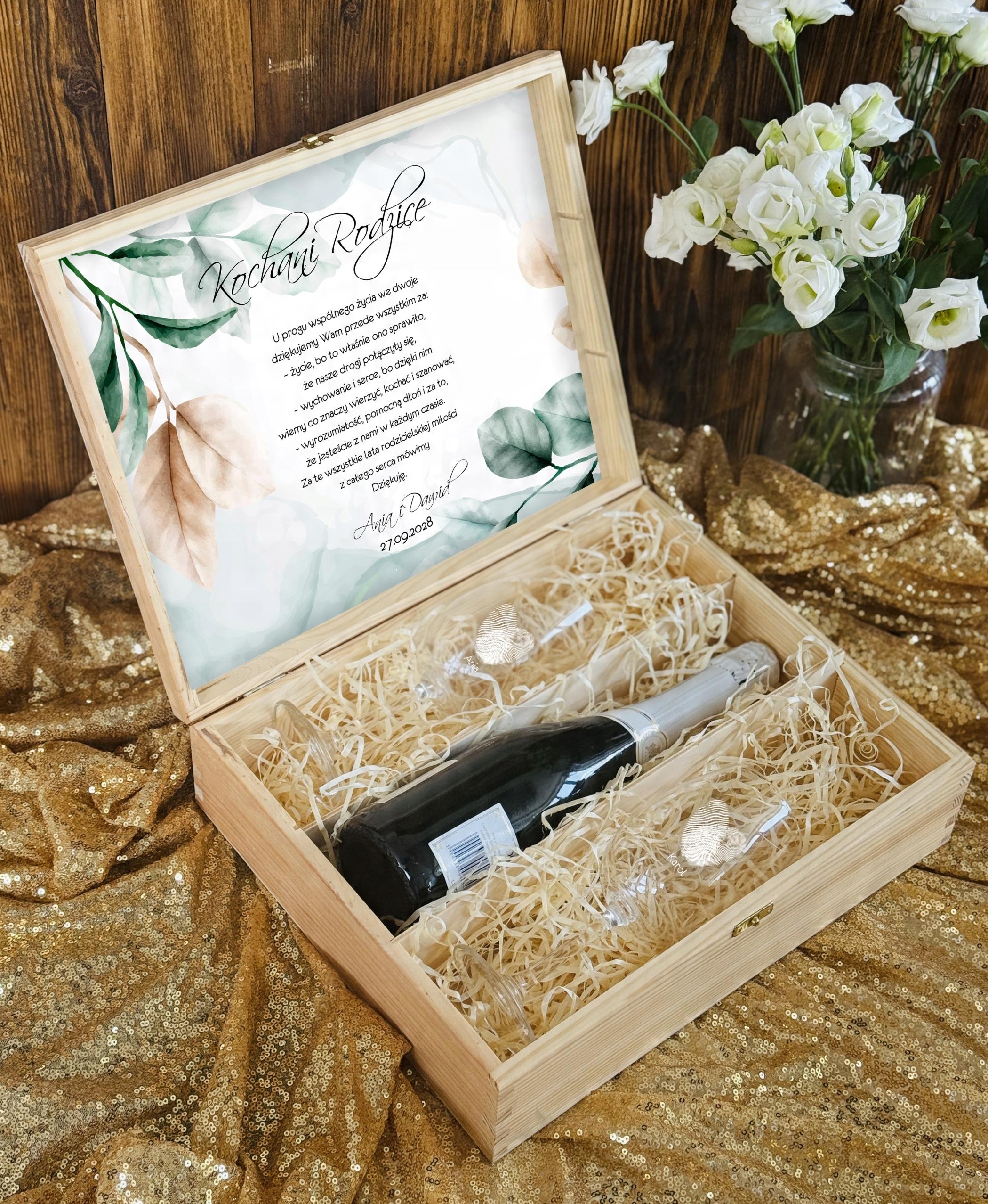 Szukasz niebanalnego sposobu, by podziękować rodzicom w dniu ślubu? Ta drewniana skrzynia w zestawie z kieliszkami to wyjątkowy sposób, by wyrazić wdzięczność i miłość. Wykonana z naturalnego drewna, zachwyca swoją prostotą i elegancją. Wypełniona wełną drzewną z grawerowanymi kieliszkami do wina to oryginalny pomysł  na praktyczny upominek.