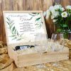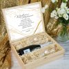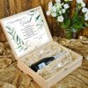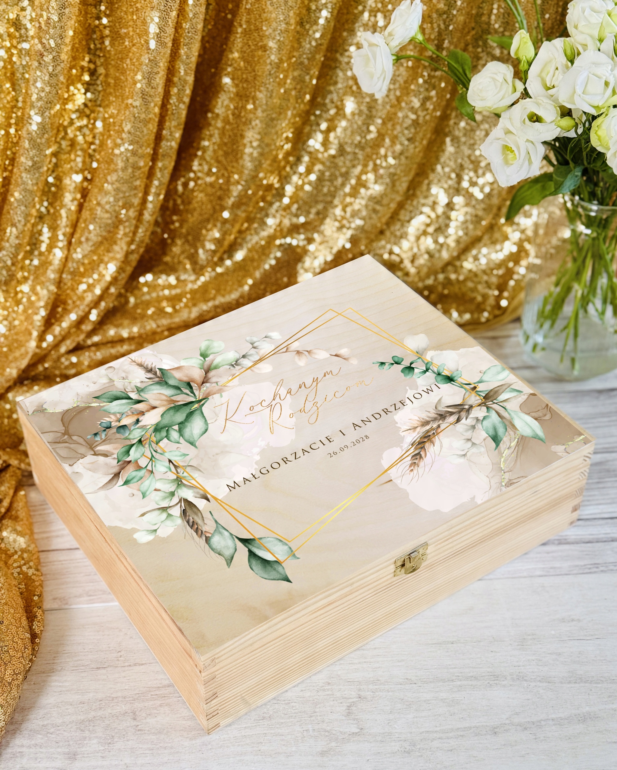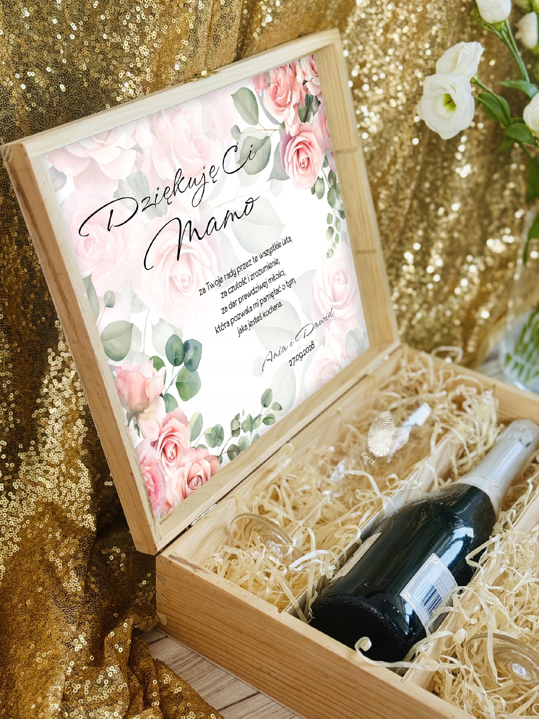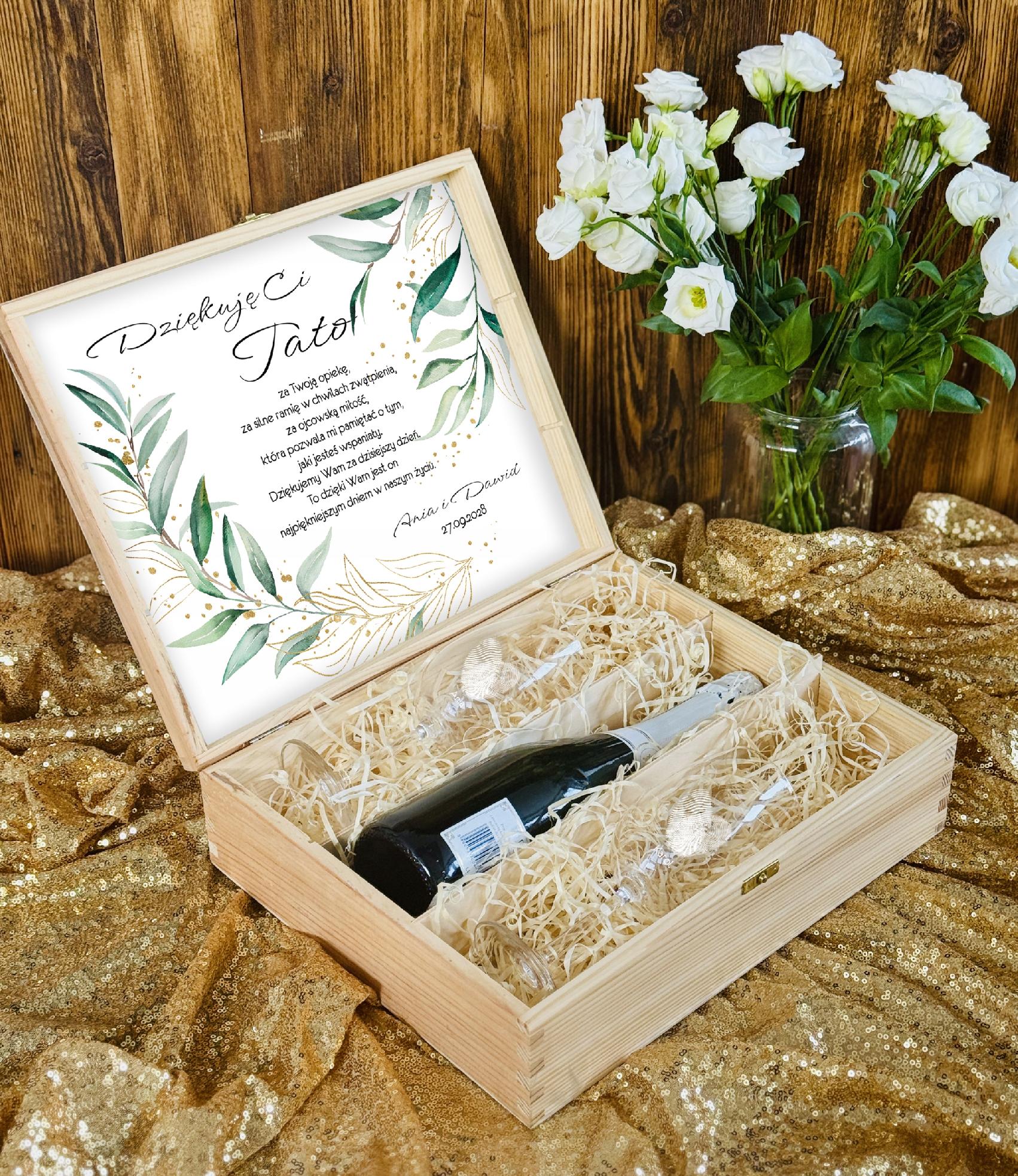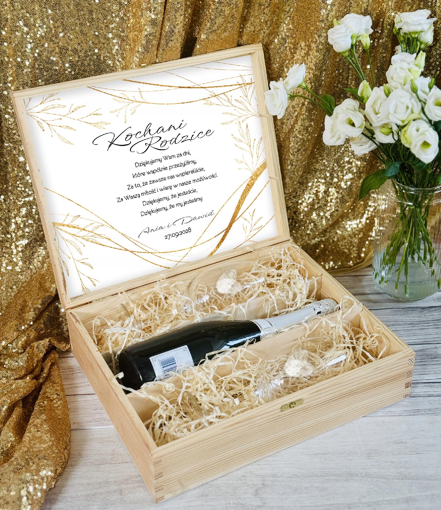 Szukasz niebanalnego sposobu, by podziękować rodzicom w dniu ślubu? Ta drewniana skrzynia w zestawie z kieliszkami to wyjątkowy sposób, by wyrazić wdzięczność i miłość. Wykonana z naturalnego drewna, zachwyca swoją prostotą i elegancją. Wypełniona wełną drzewną z grawerowanymi kieliszkami do wina to oryginalny pomysł  na praktyczny upominek.