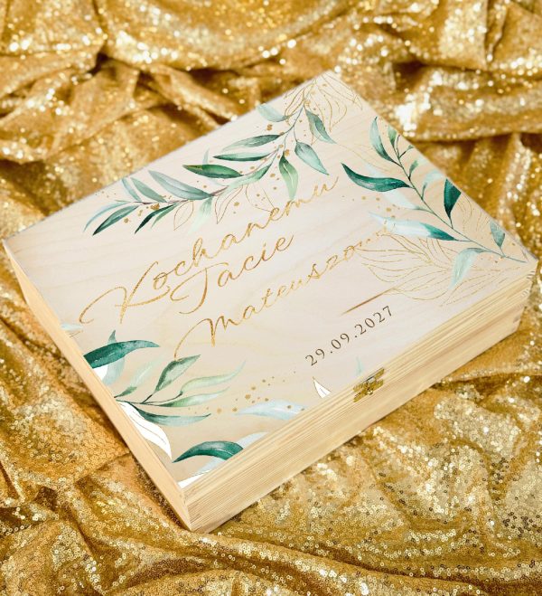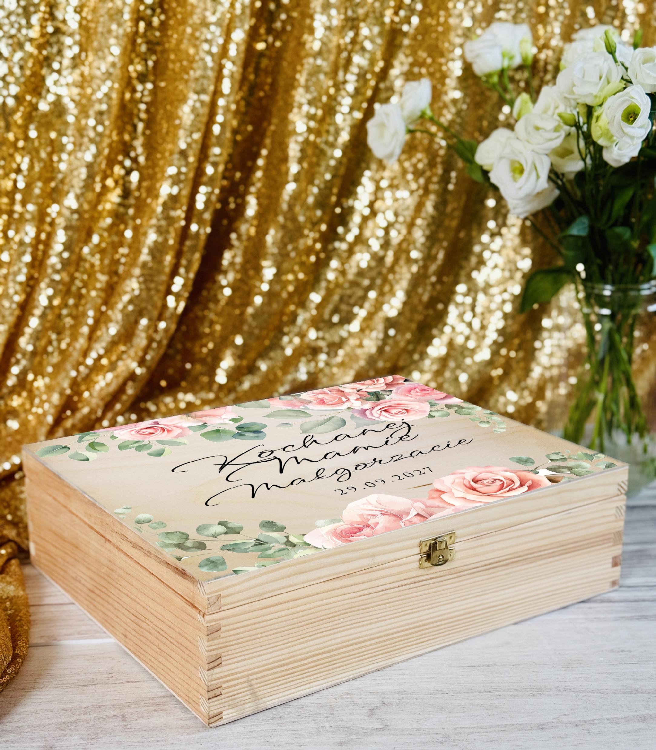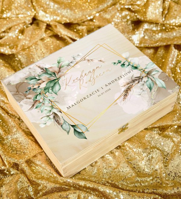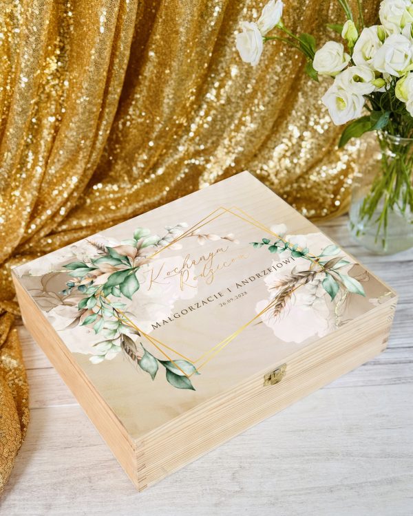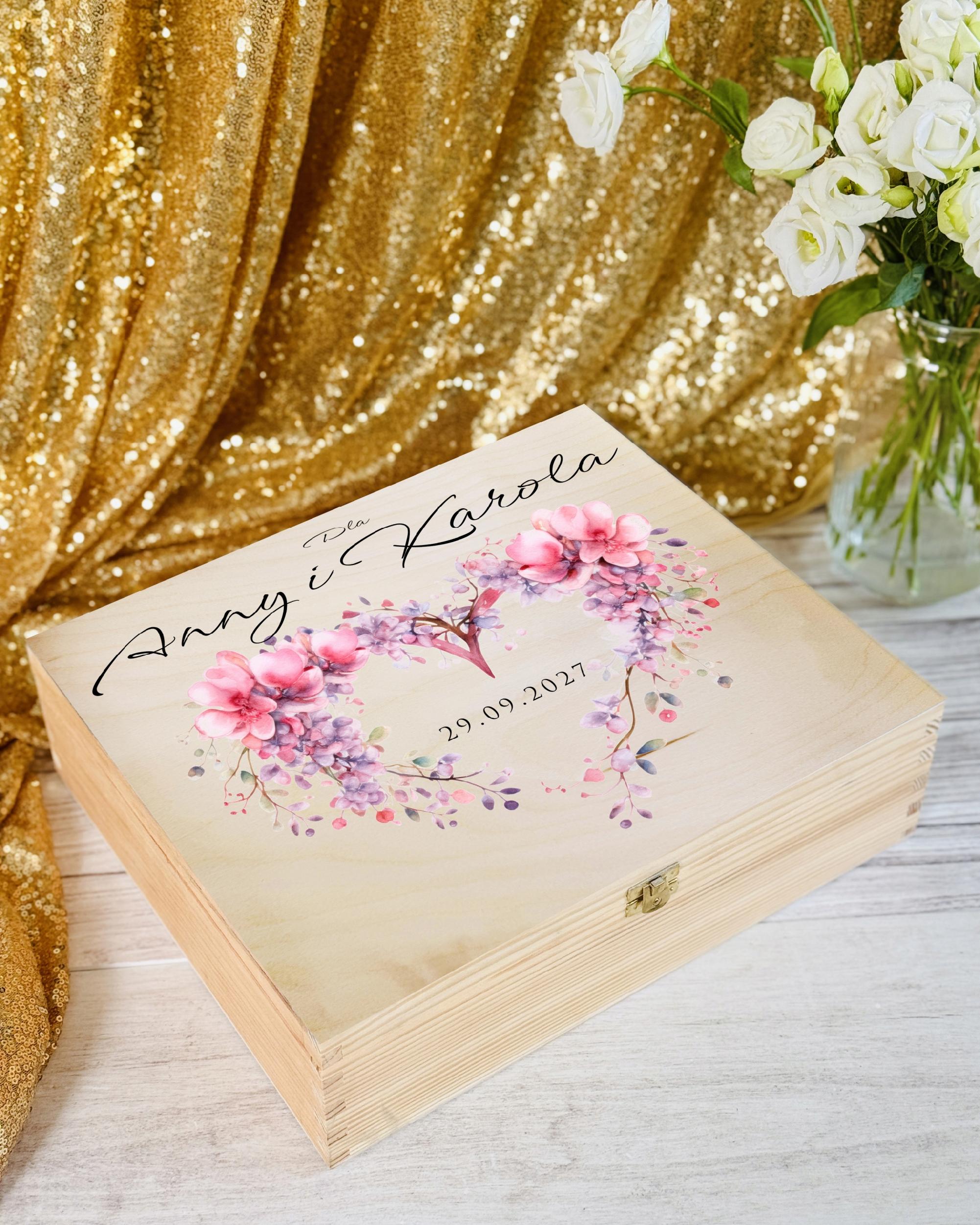 ✅ Personalizacja – możliwość dodania imion, daty ślubu na skrzyni, wewnątrz życzenia