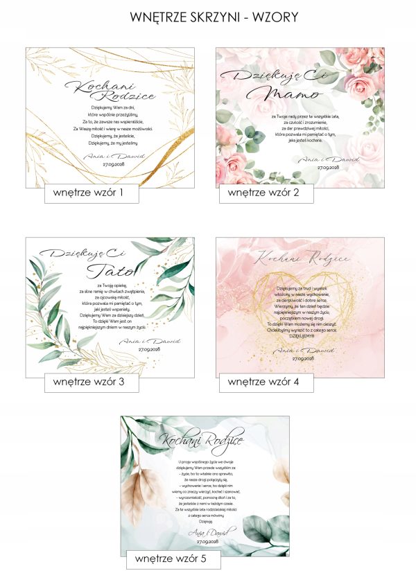 • W cenie jeden z pięciu wzorów z życzeniami drukowanymi i wklejonymi wewnątrz skrzyni