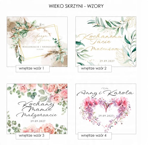 np: skrzynia wieko Wzór 2 “Kochanym Rodzicom Kasia i Artur 29.09.2028r” skrzynia wnętrze wzór nr 2 “Kochani Rodzice, życzenia nr 2 Kasia i Artur 29.09.2028r.” kieliszki wzór nr 1 Kasia, Artur