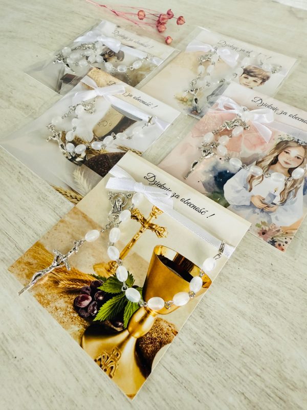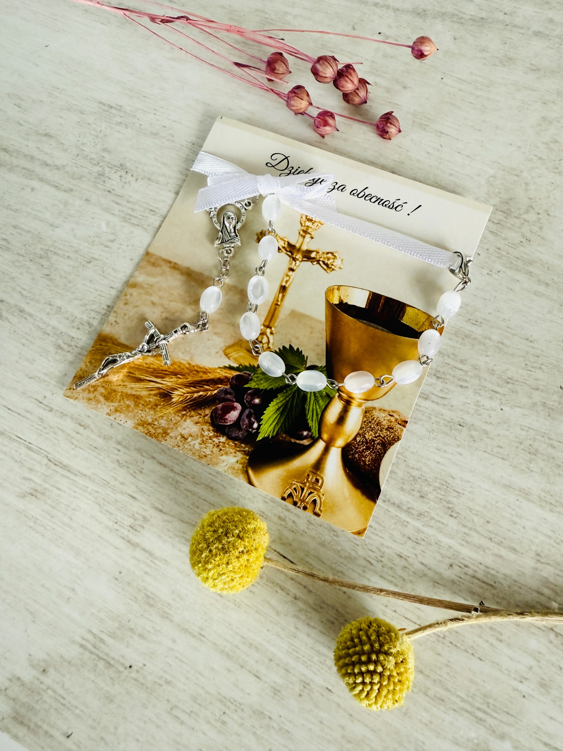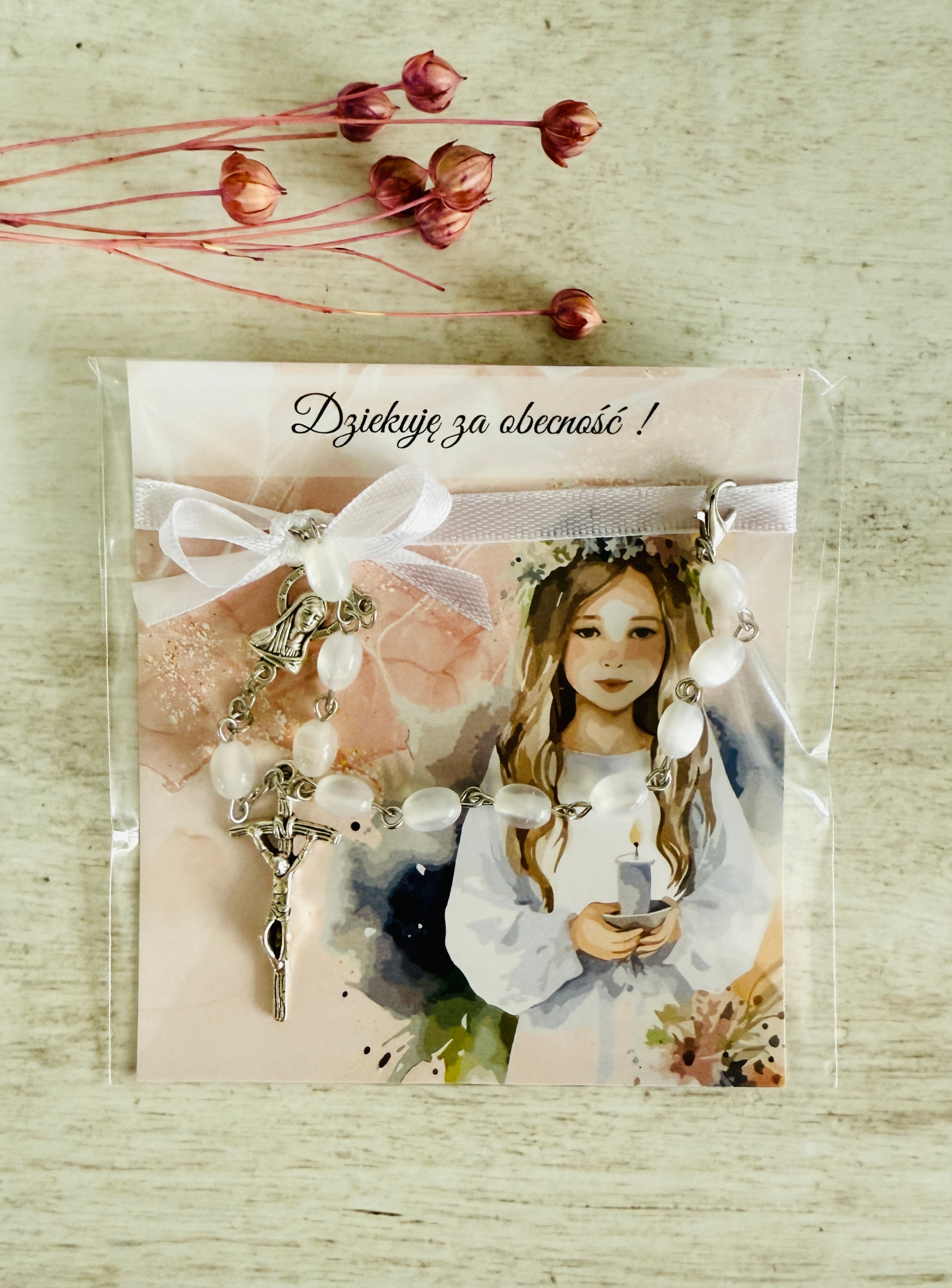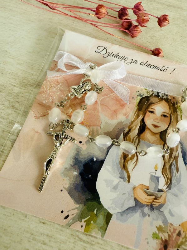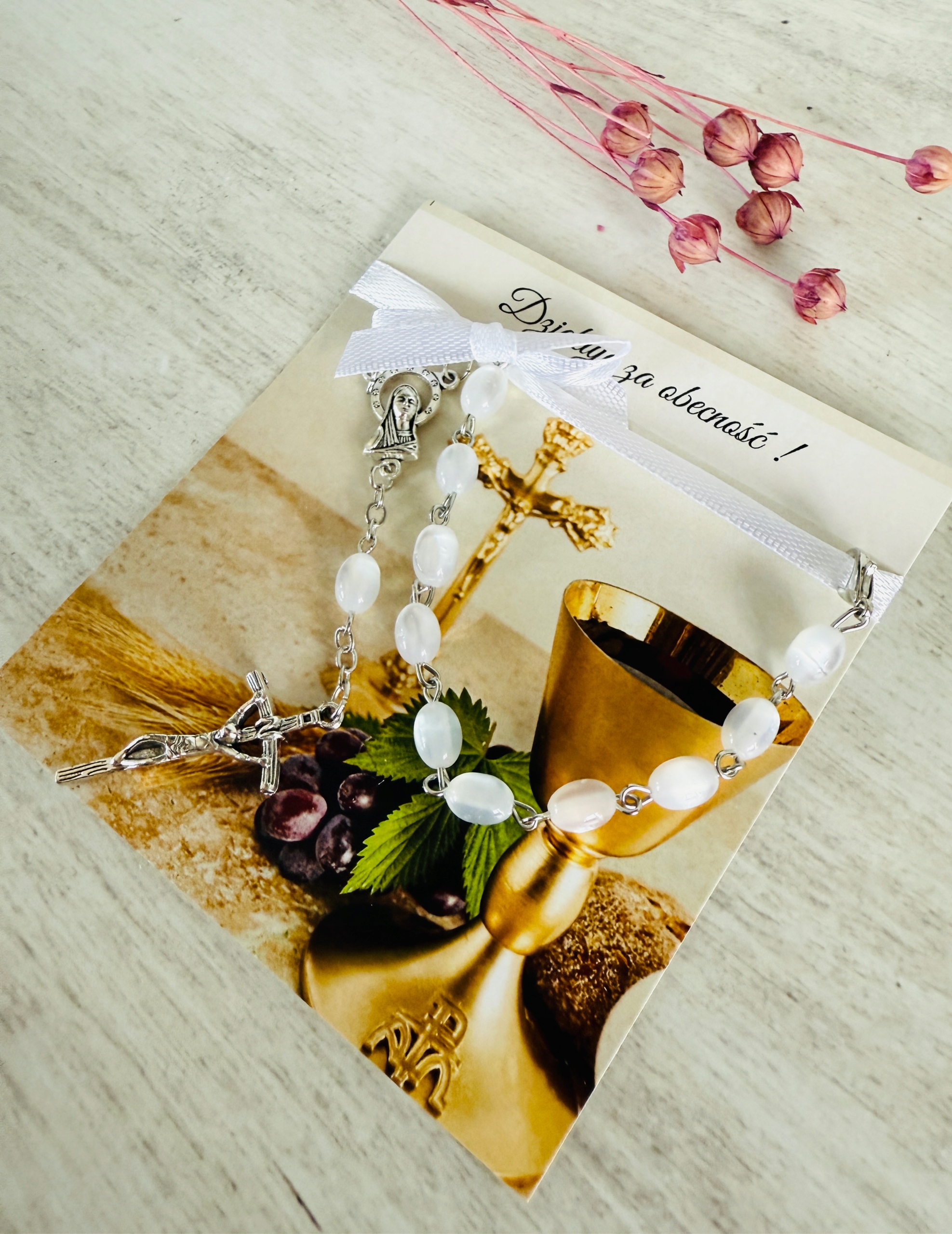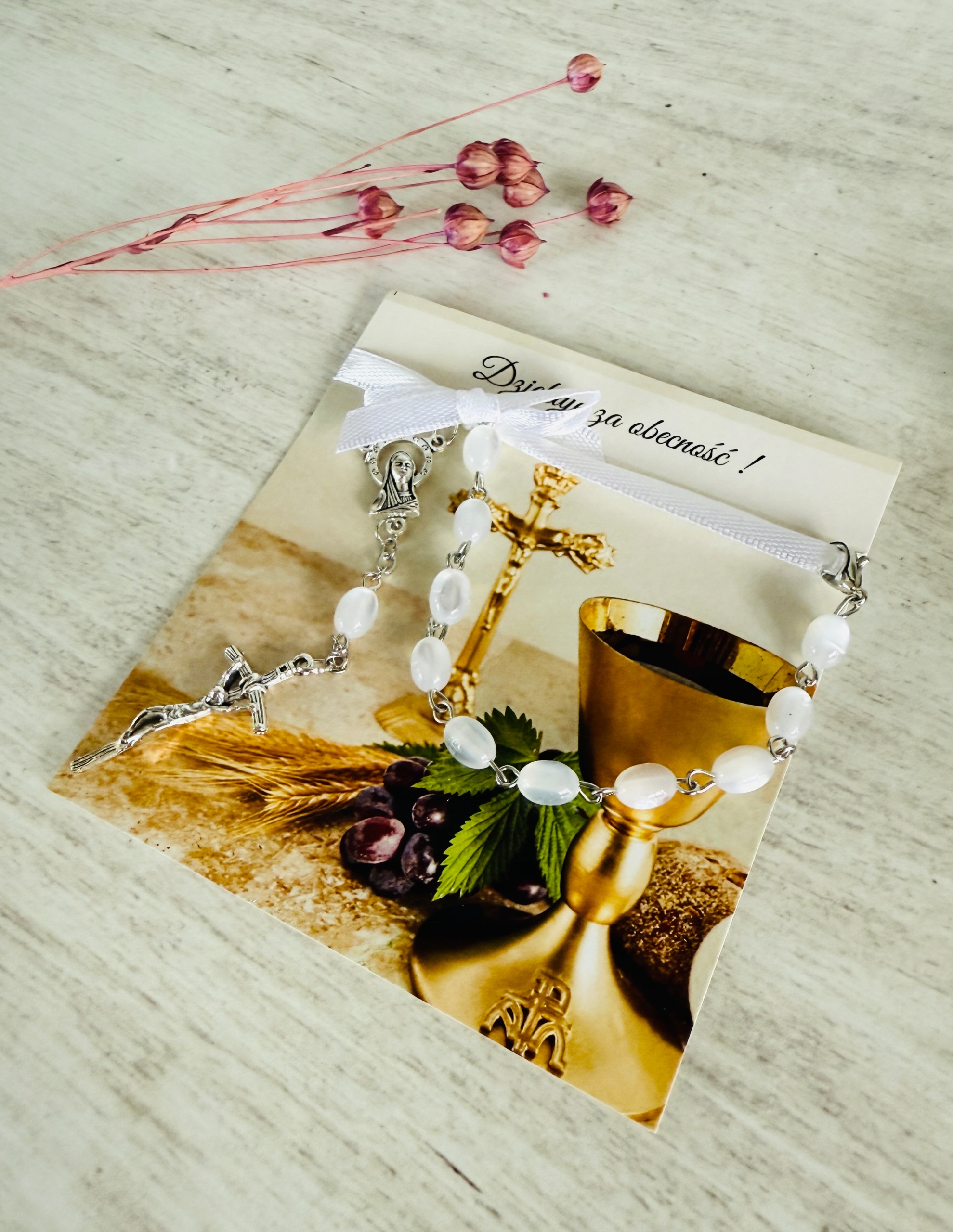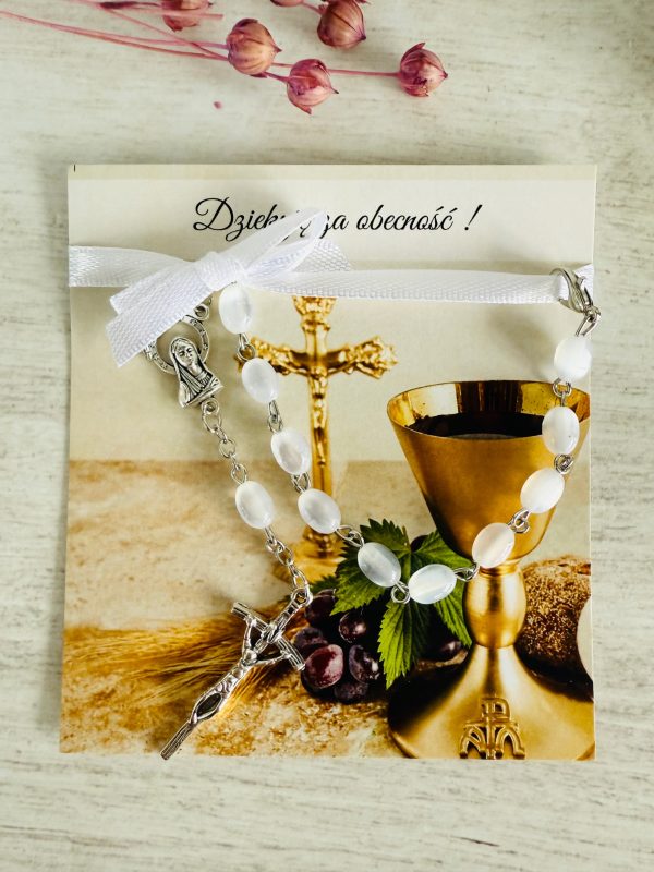 ✅ dziesiątek różańca (białe kamienie, metalowy) przymocowany do karteczki za pomocą satynowej wstążki