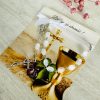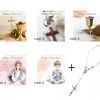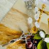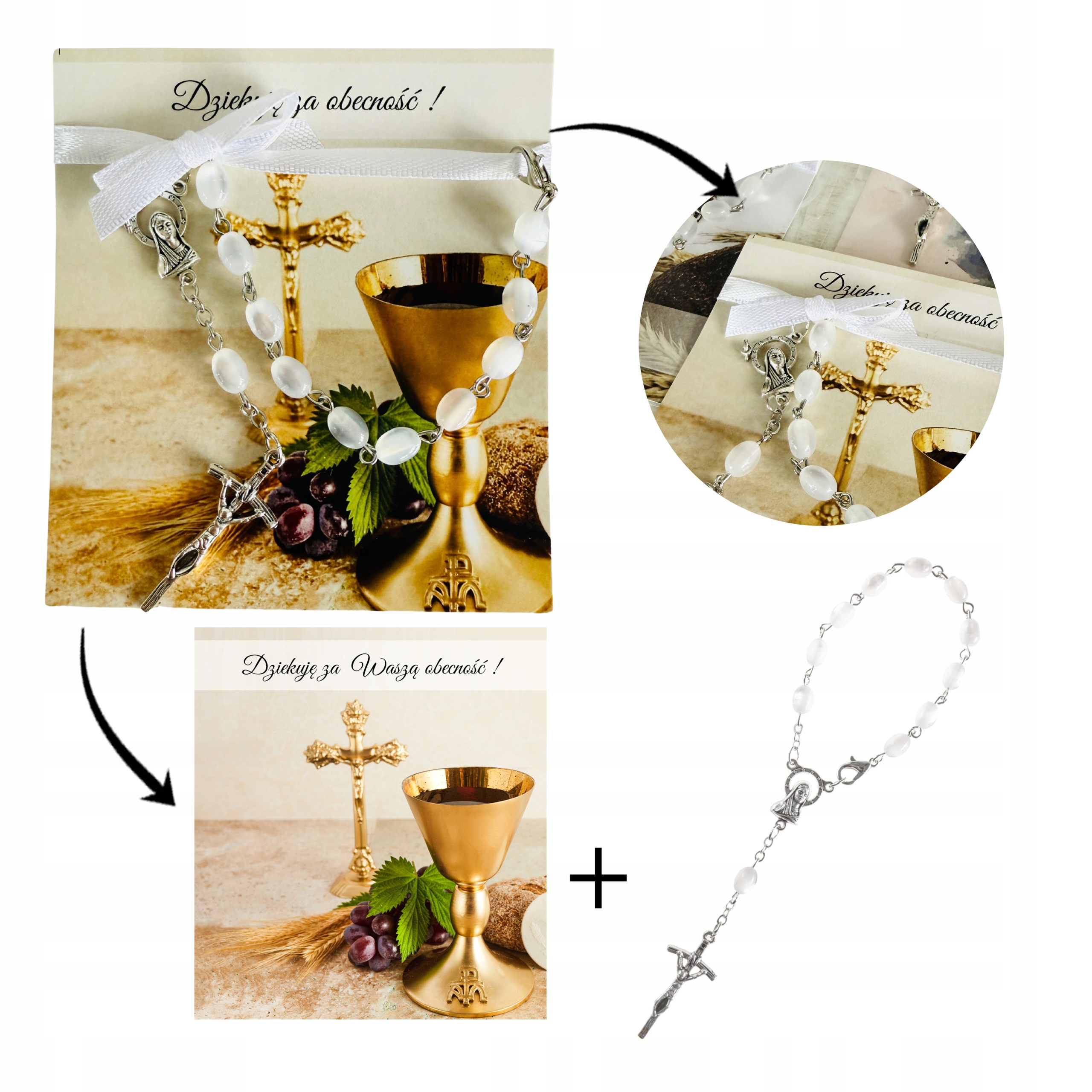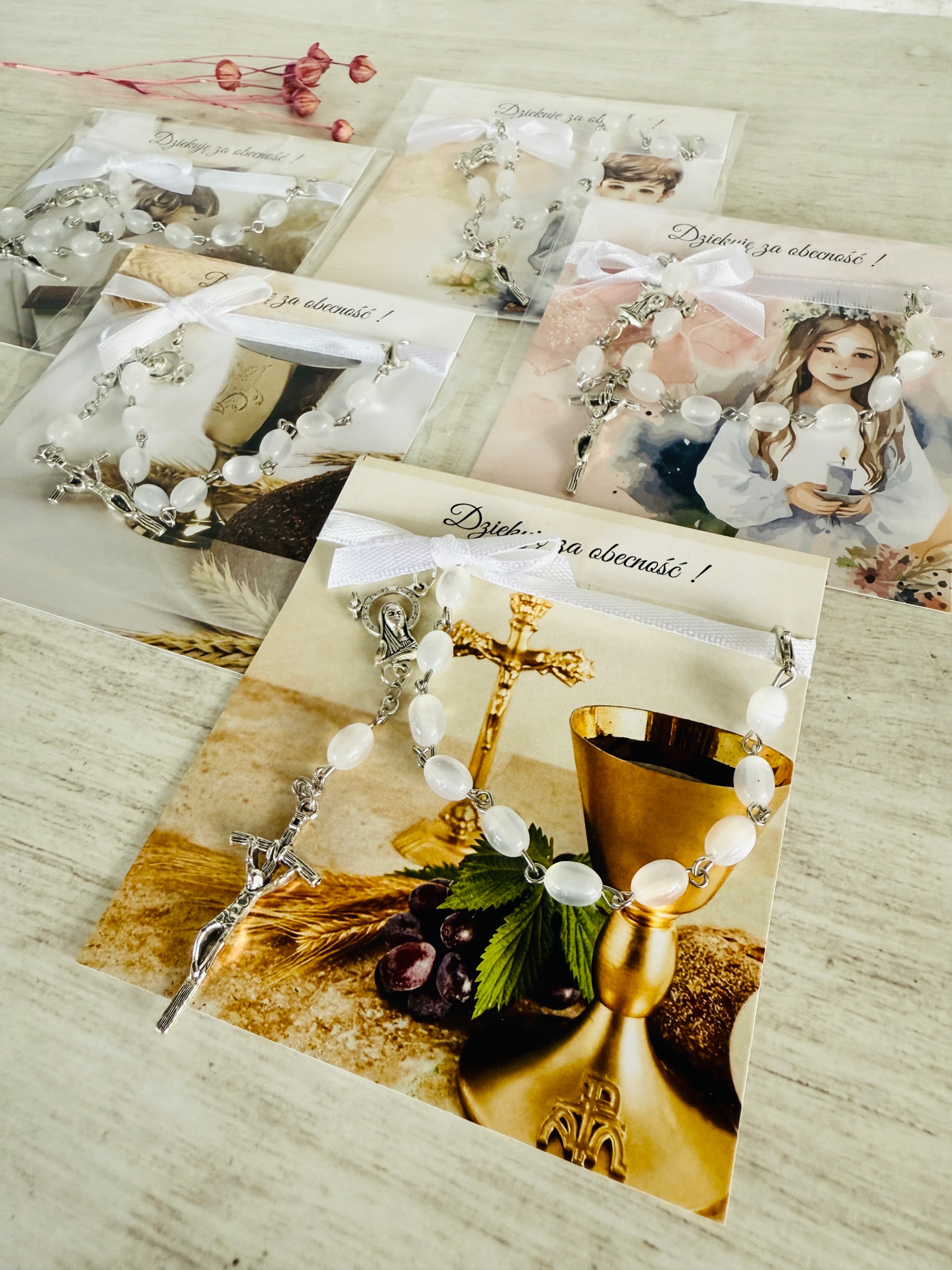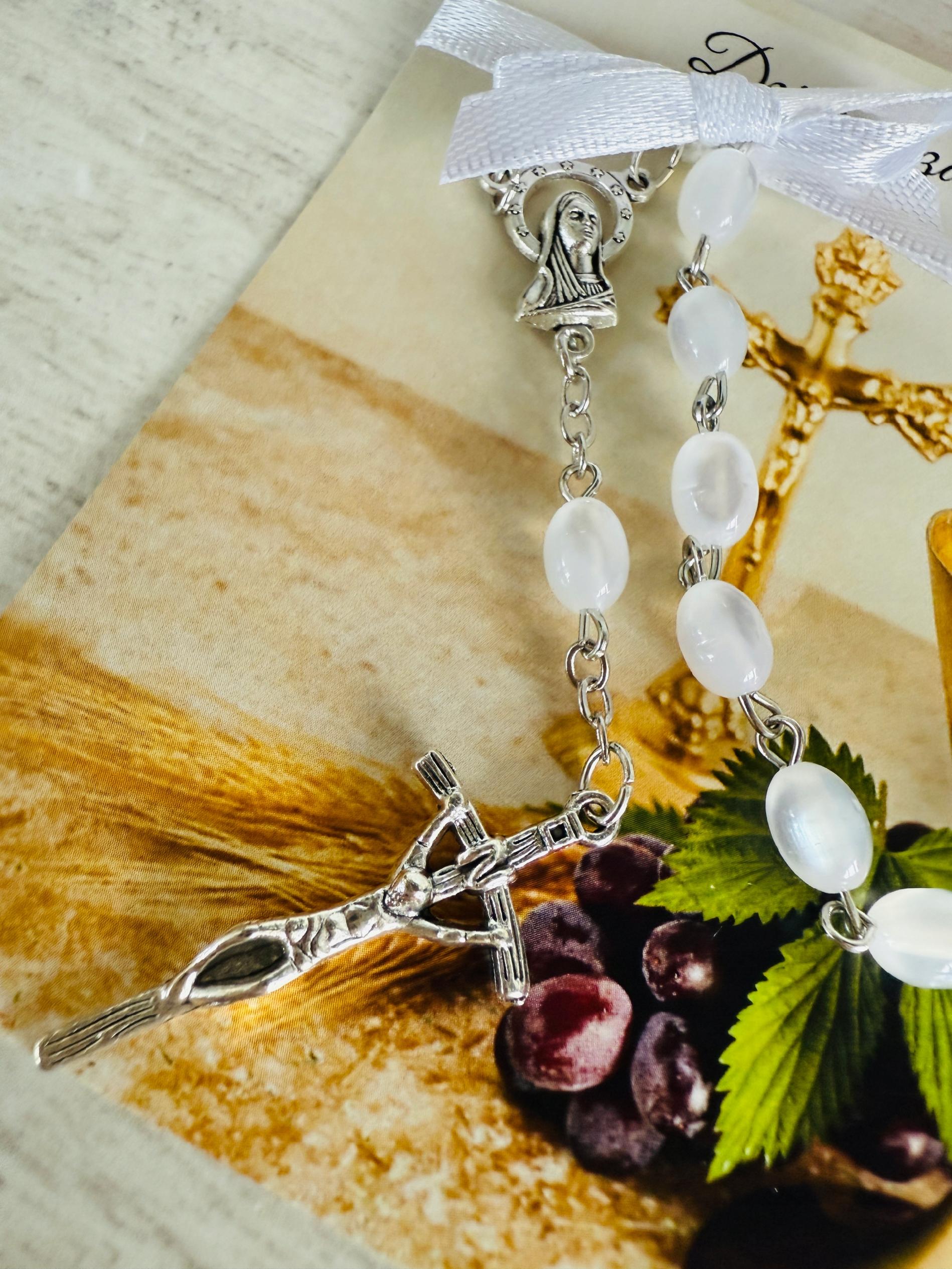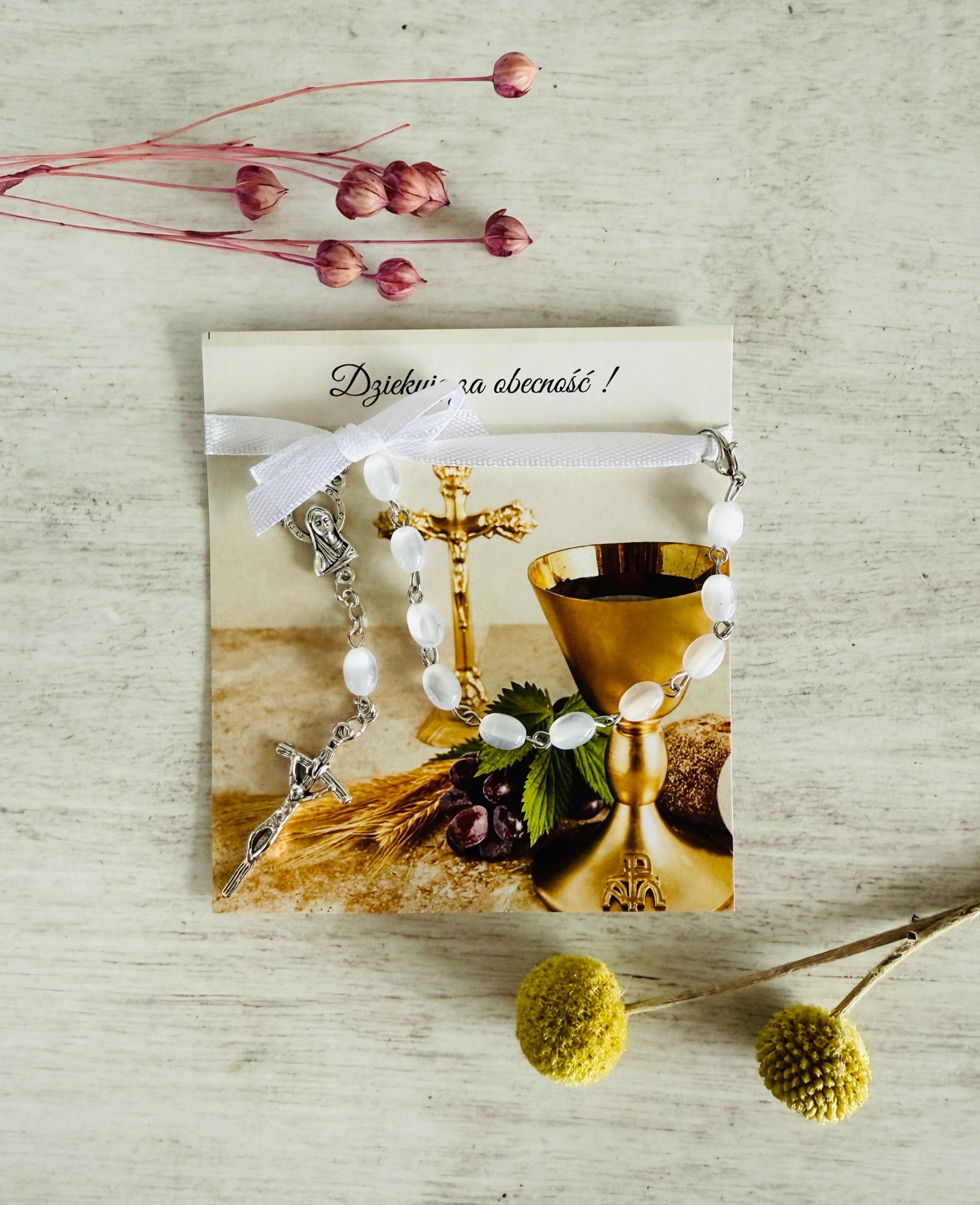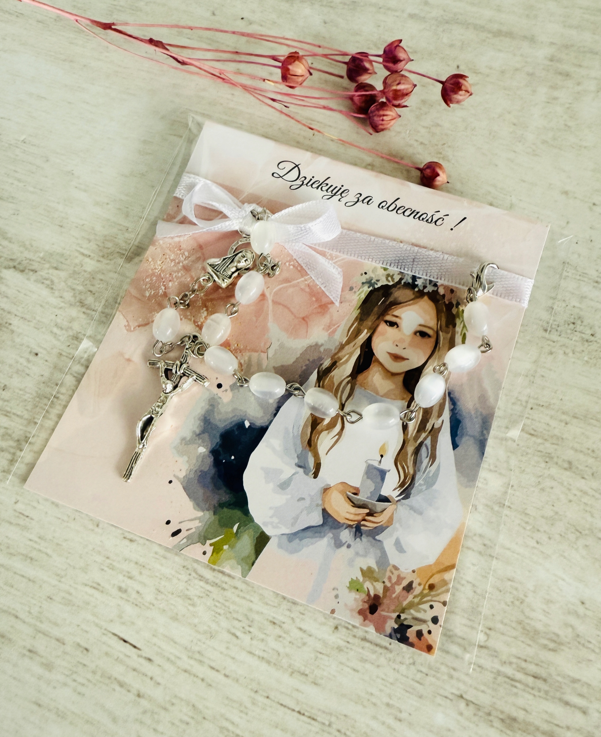 ✅ dziesiątek różańca (białe kamienie, metalowy) przymocowany do karteczki za pomocą satynowej wstążki