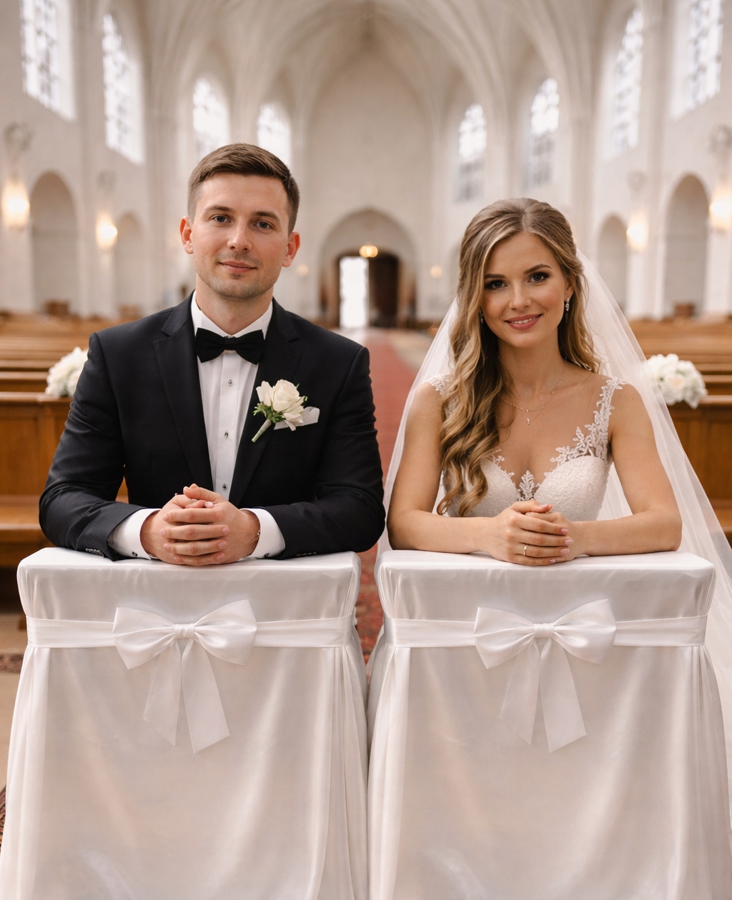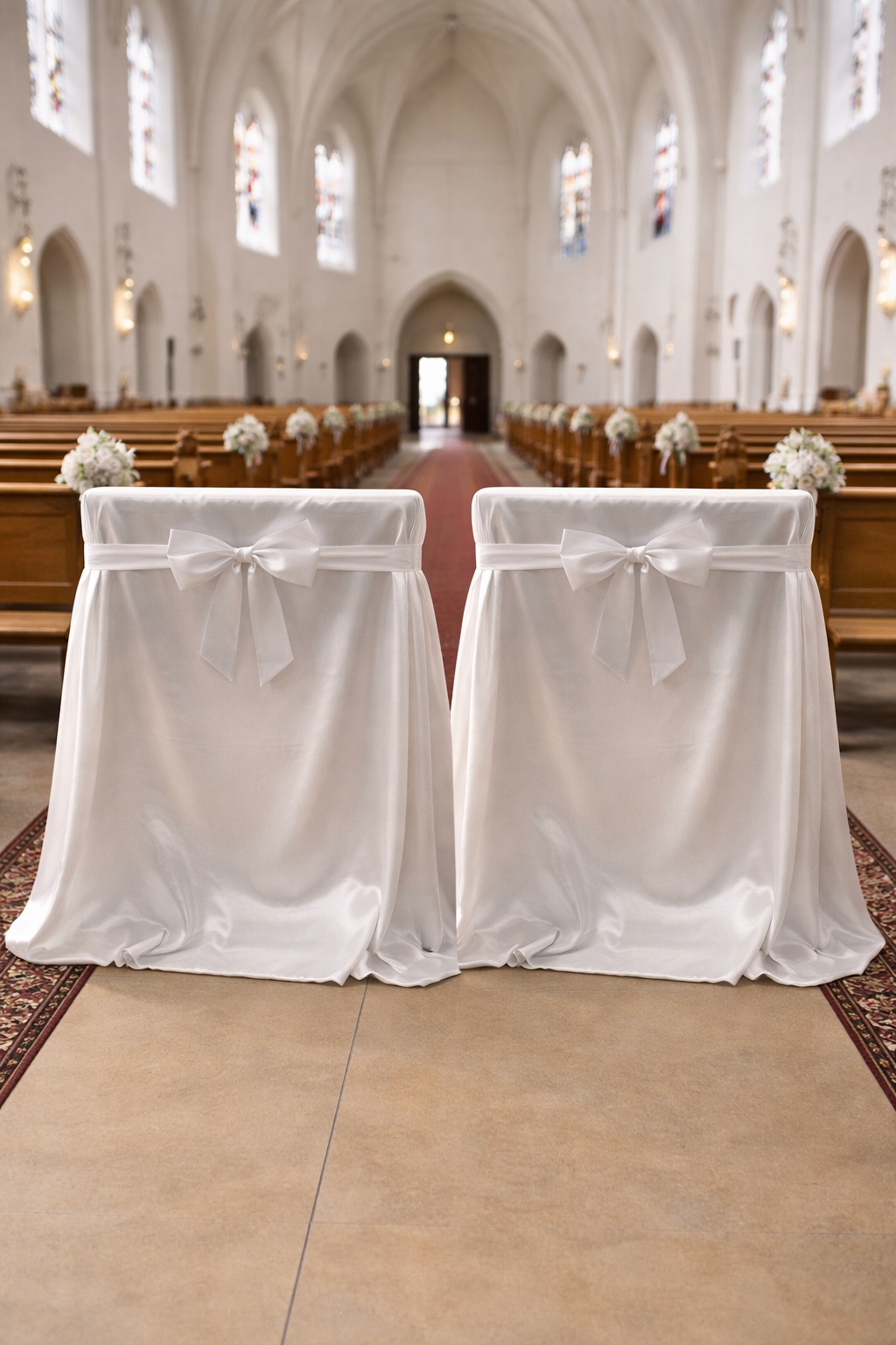 Wystarczy rozłożyć materiał na klęczniku, dopasować jego ułożenie, a następnie przewiązać wstążkę wokół konstrukcji, tworząc elegancką kokardę z przodu. Całość stabilnie utrzymuje się na miejscu, a jednocześnie można ją w każdej chwili łatwo poprawić lub zdjąć.