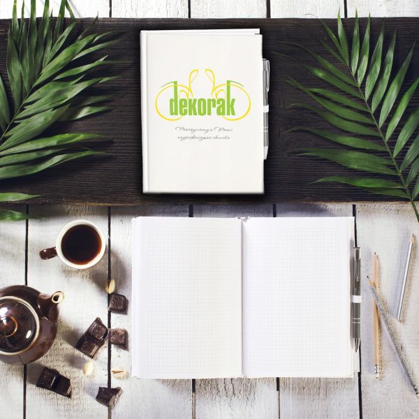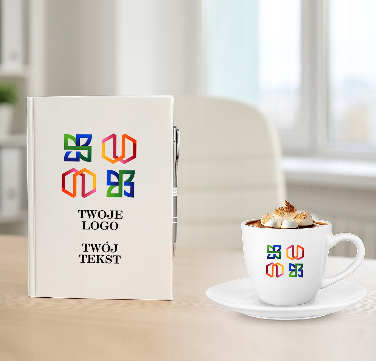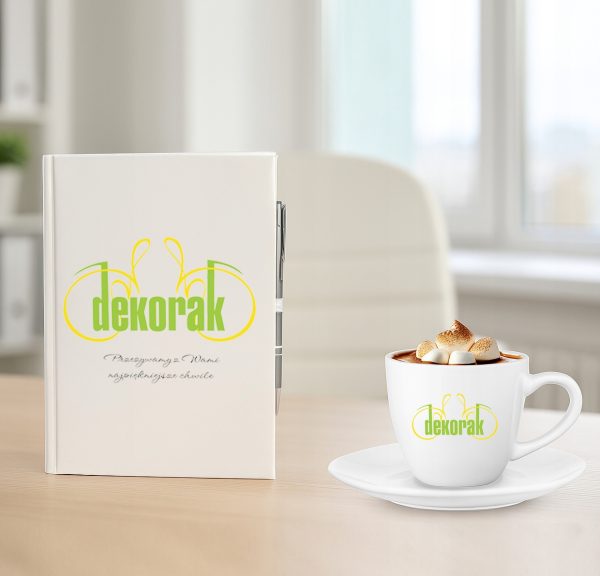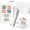 Prześlij w wiadomości do sprzedającego logo i tekst jaki chcesz aby pojawił się na okładce notesu i filiżance.