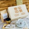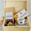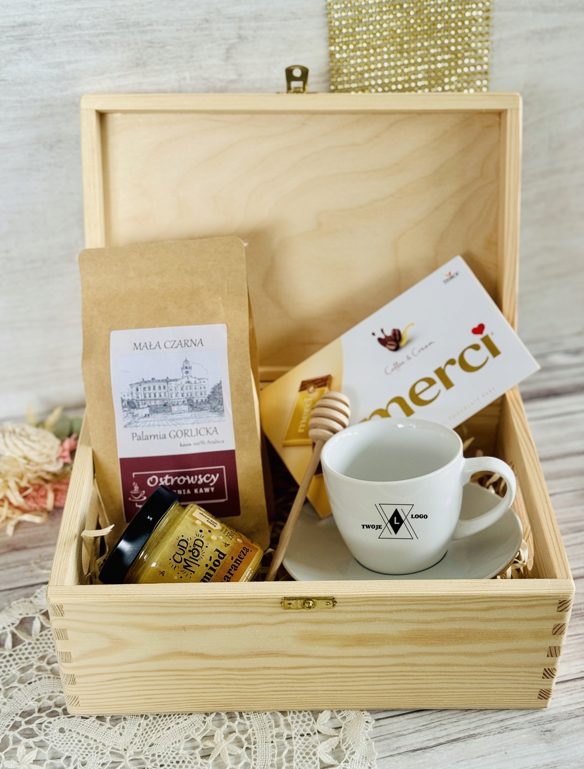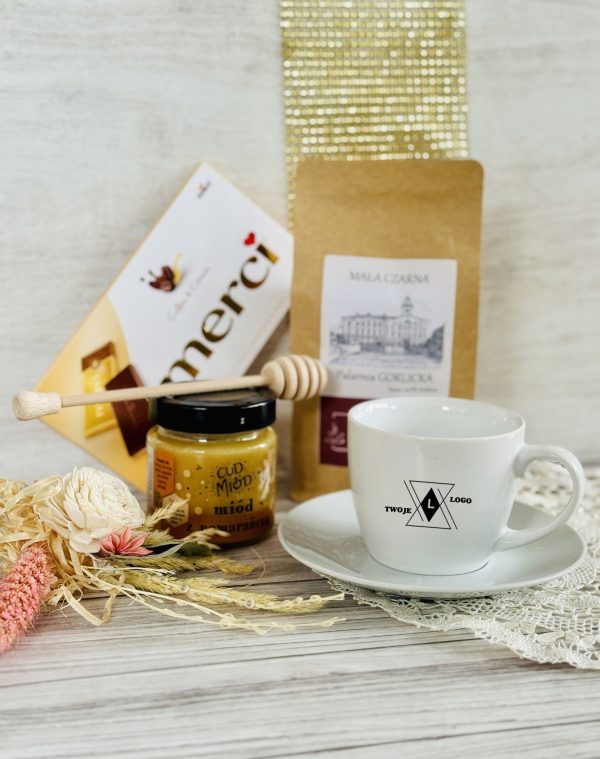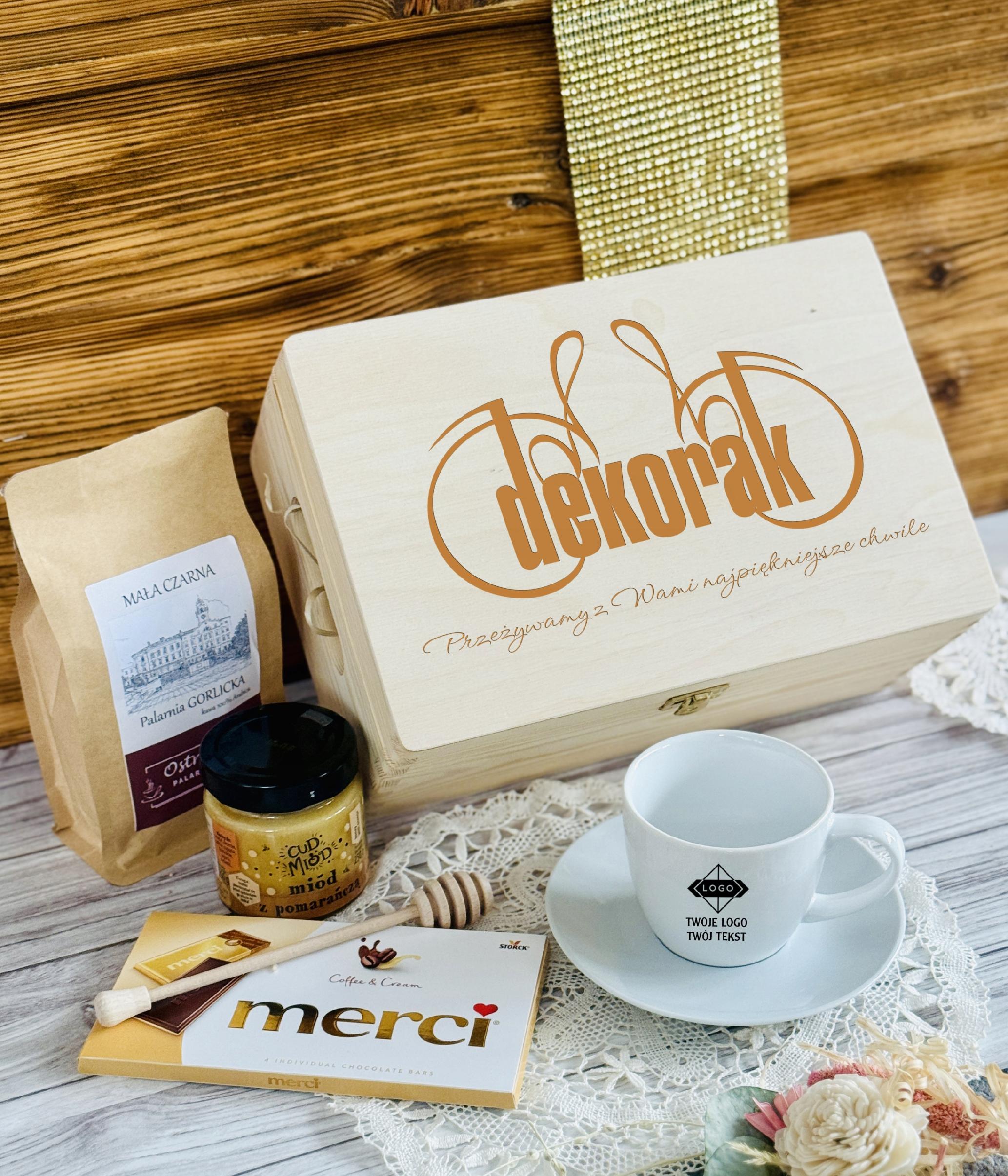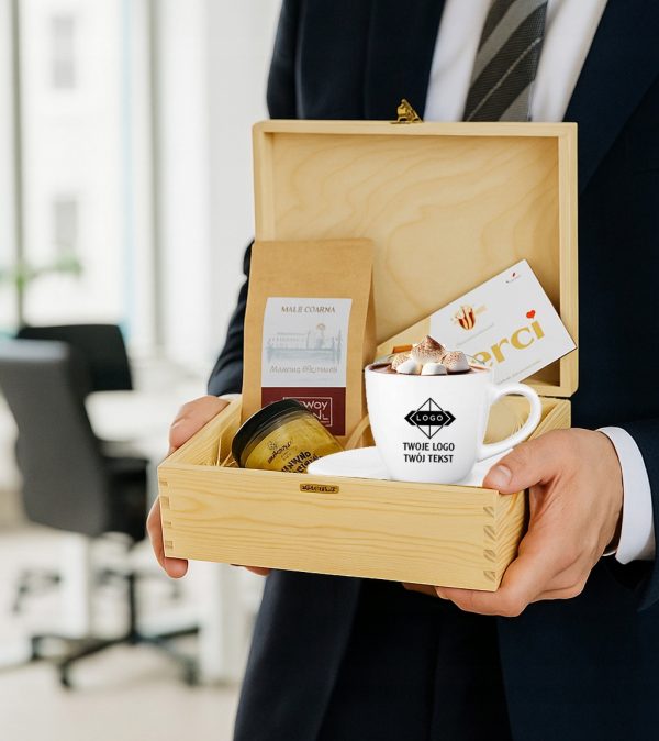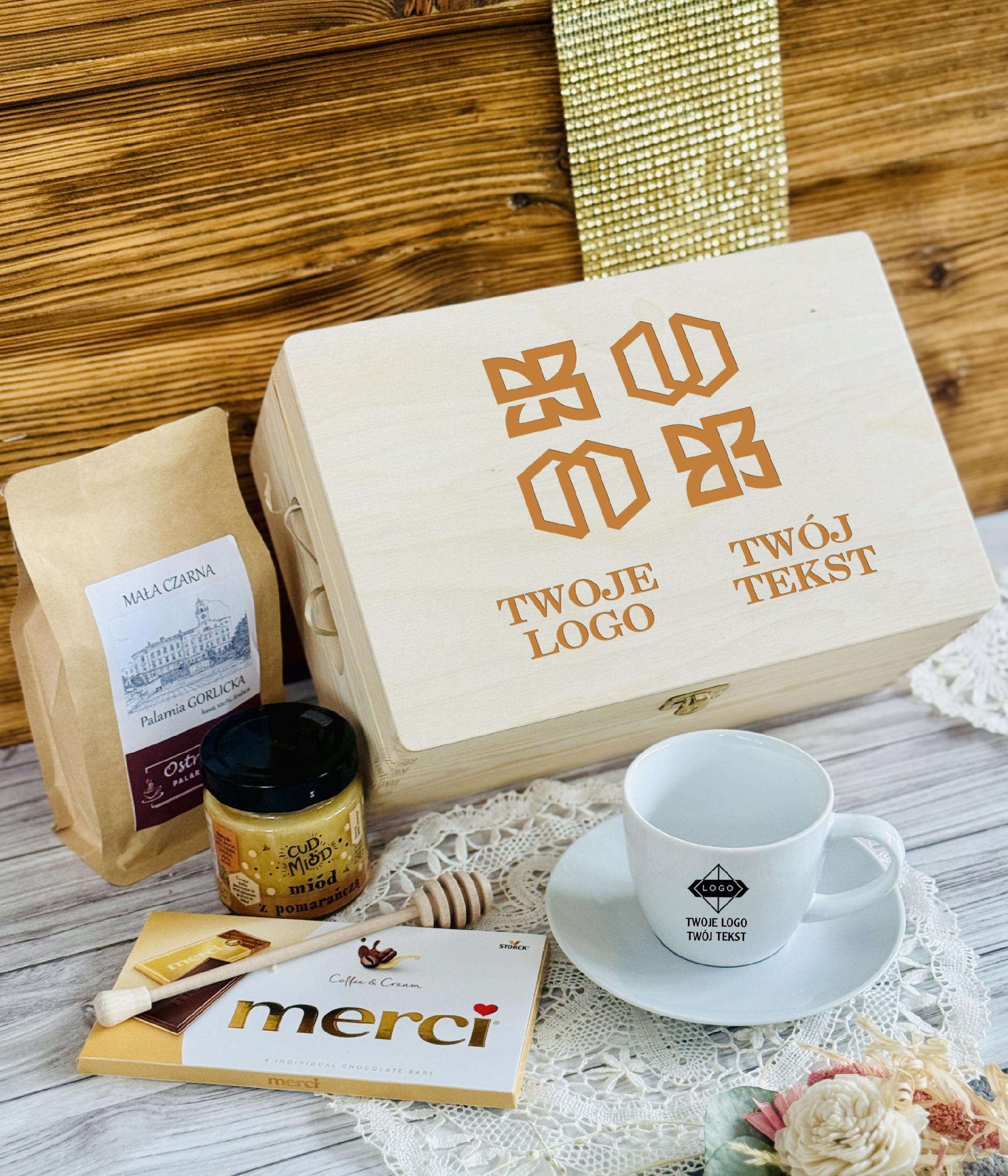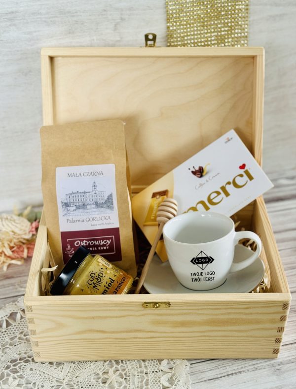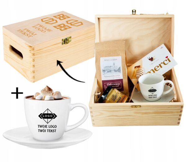 Ten elegancki zestaw w grawerowanej skrzyni to połączenie smaku, relaksu i codziennej przyjemności. Filiżanka z logo firmy staje się praktycznym gadżetem używanym każdego dnia, dzięki czemu marka pozostaje w zasięgu wzroku. Aromatyczna kawa, słodka czekolada i naturalny miód tworzą zestaw, który kojarzy się z chwilą odpoczynku, komfortem i dbałością o detale.