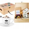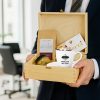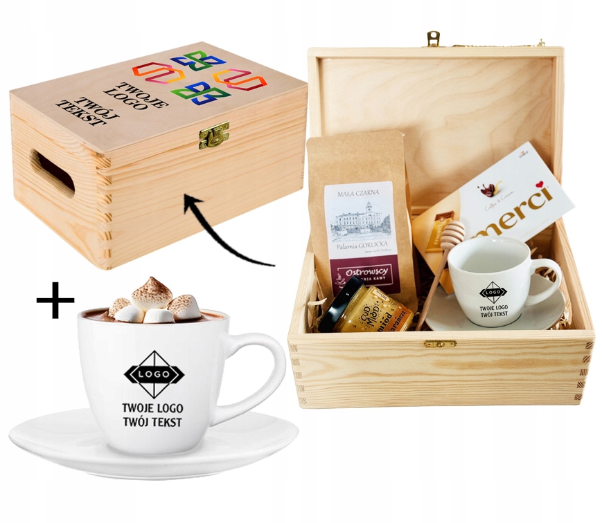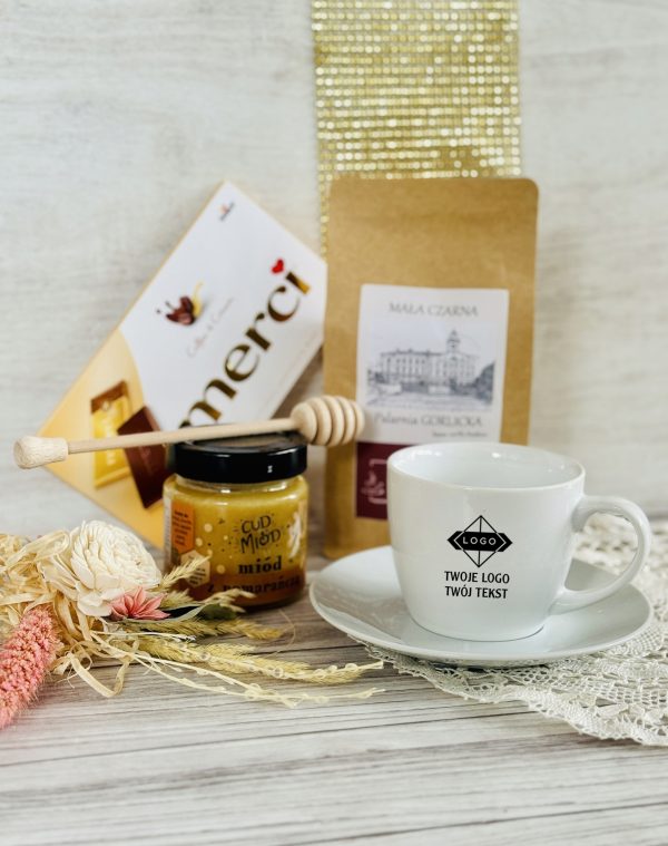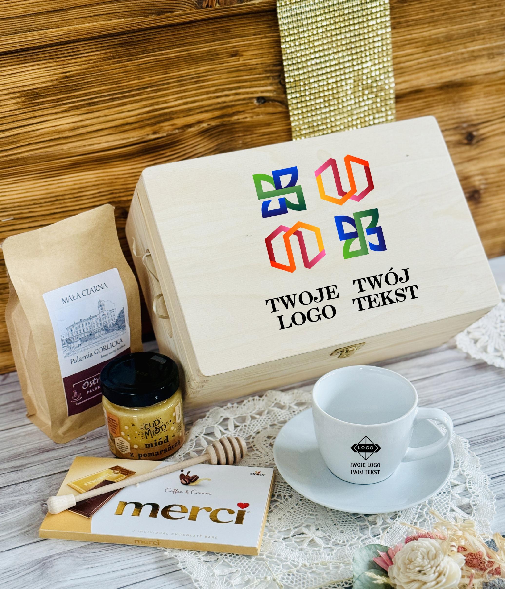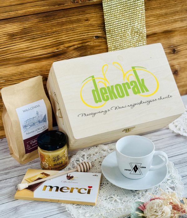 Ten elegancki zestaw w skrzyni z nadrukiem UV to połączenie smaku, relaksu i codziennej przyjemności. Filiżanka z logo firmy staje się praktycznym gadżetem używanym każdego dnia, dzięki czemu marka pozostaje w zasięgu wzroku. Aromatyczna kawa, słodka czekolada i naturalny miód tworzą zestaw, który kojarzy się z chwilą odpoczynku, komfortem i dbałością o detale.