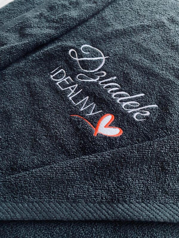 - czarny ręcznik 100 x 50cm (+/-10% tolerancji rozmiaru) z haftem “Dziadek idealny” z grafiką w postaci serca – nie ma możliwości ingerencji w napis na ręczniku, haft wykonujemy na środku ręcznika