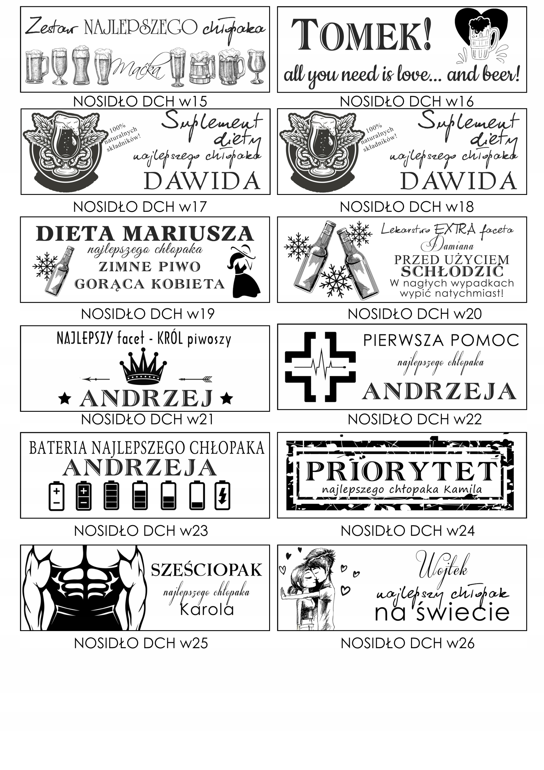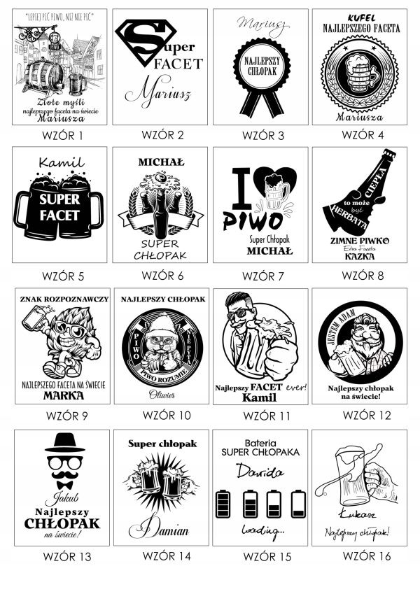 - W wiadomości do sprzedającego podaj wybrane wzory (dla nosidła i dla kufla) oraz dane do graweru – IMIĘ PODAJ W WERSJI ODMIENIONEJ np: