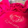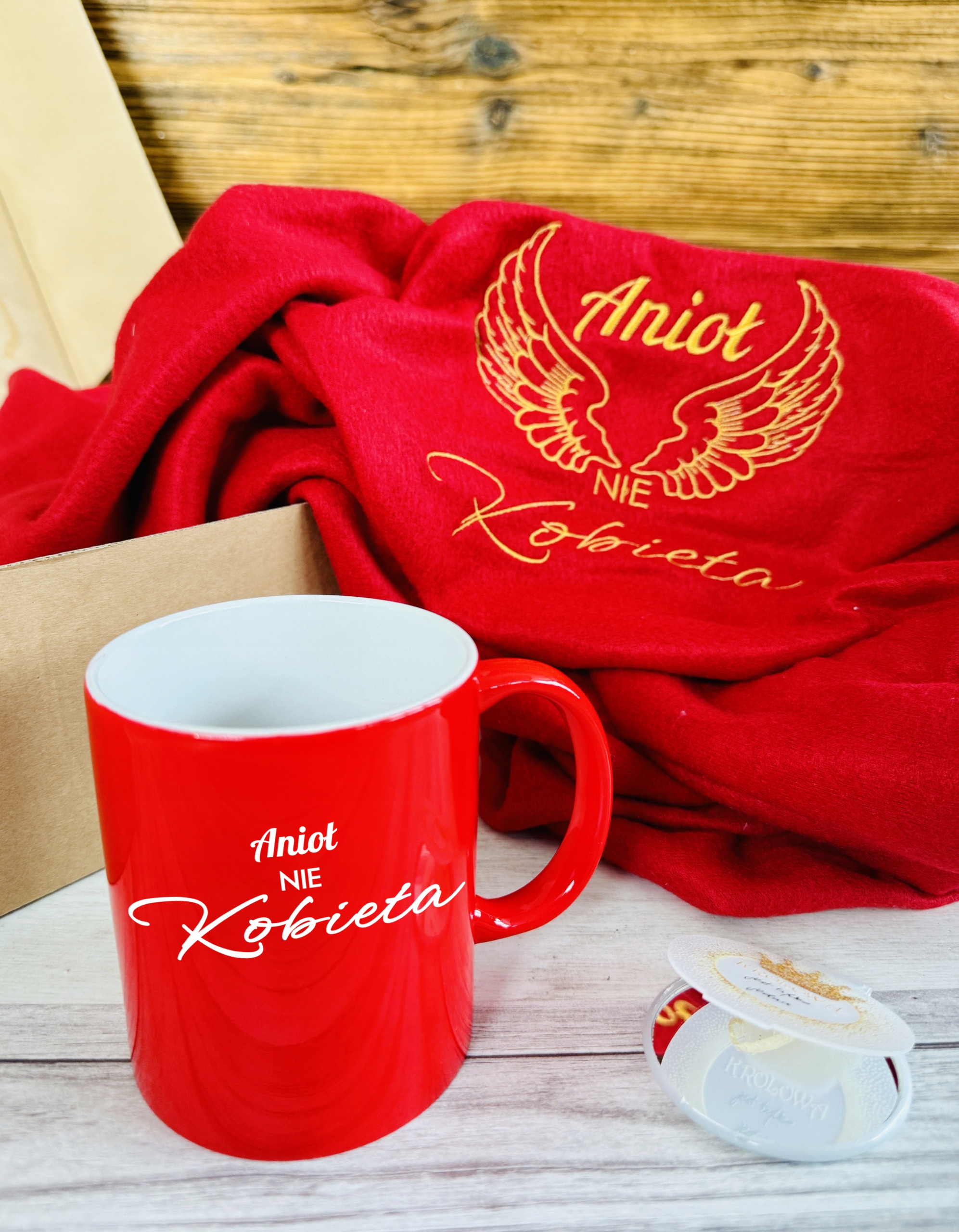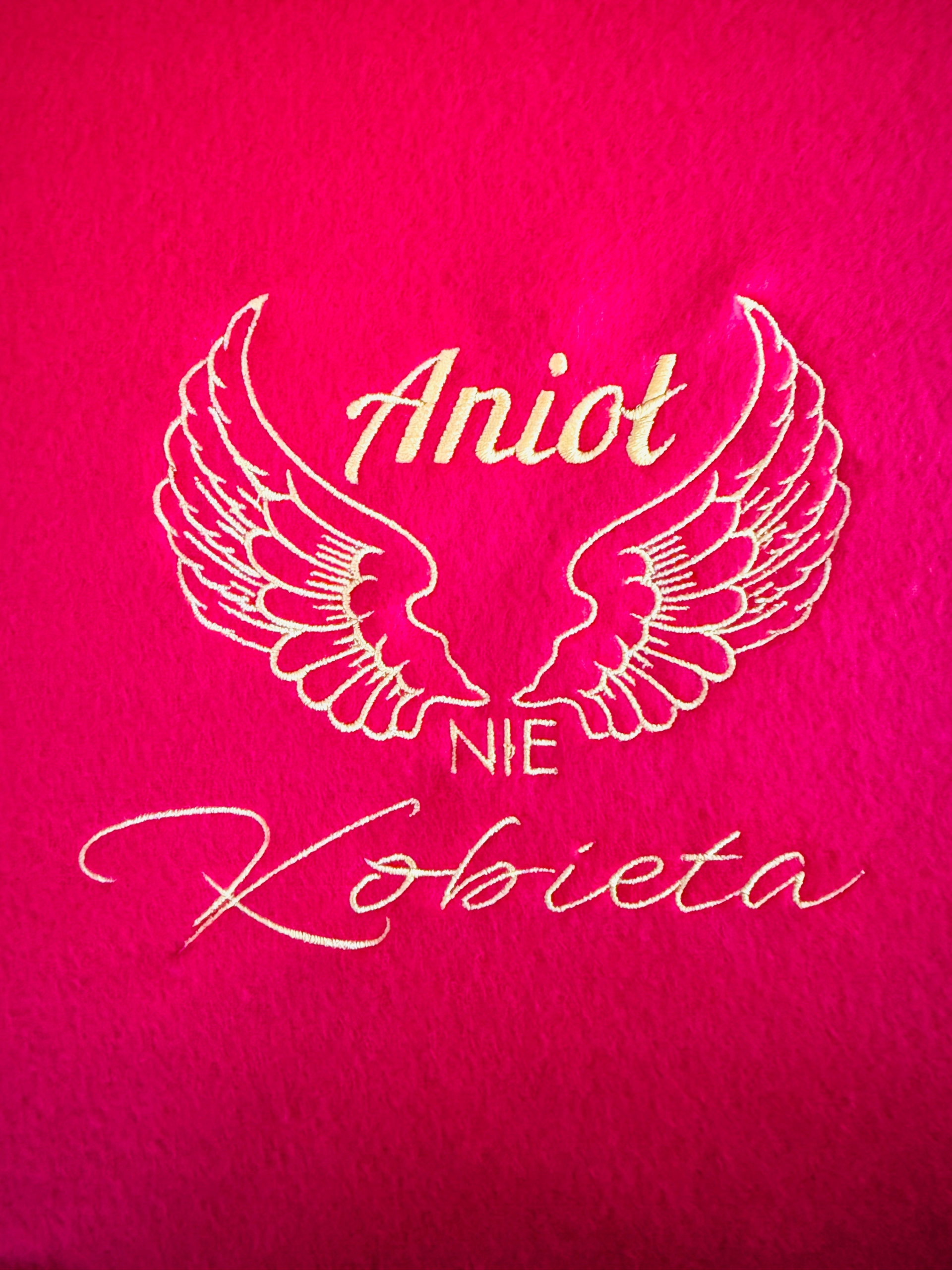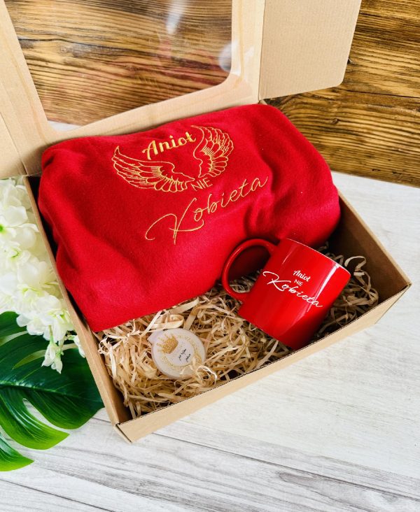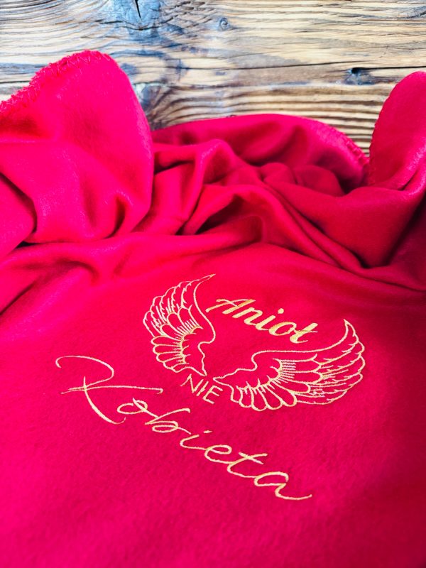 - czerwony koc rozmiar 130 x 1600cm (+/-10% tolerancji rozmiaru) z haftem w złotym kolorze “Anioł nie kobieta” i grafiki w postaci skrzydeł – nie ma możliwości ingerencji w napis na kocu, haft wykonujemy na środku koca