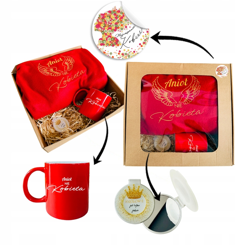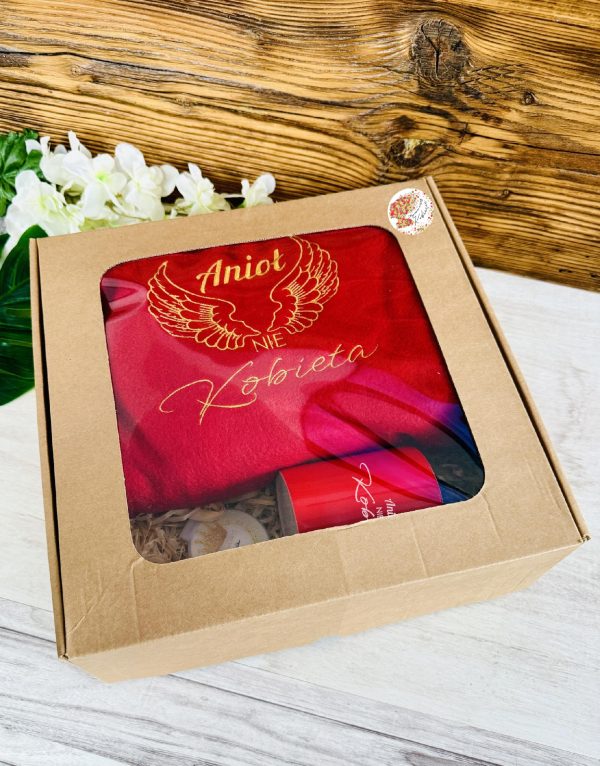 Mięciutki koc dedykowany dla kobiet ze specjalną haftowaną dedykacją “Anioł nie kobieta” i delikatną grafiką to oryginalny pomysł nie tylko na praktyczny upominek, ale także na osobisty przekaz zawarty w prostym hafcie. ZESTAW poszerzony o kubek do kompletu i lusterko, w całości zapakowany w pudełko z naklejką tworzy prezent gotowy do wręczenia.