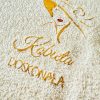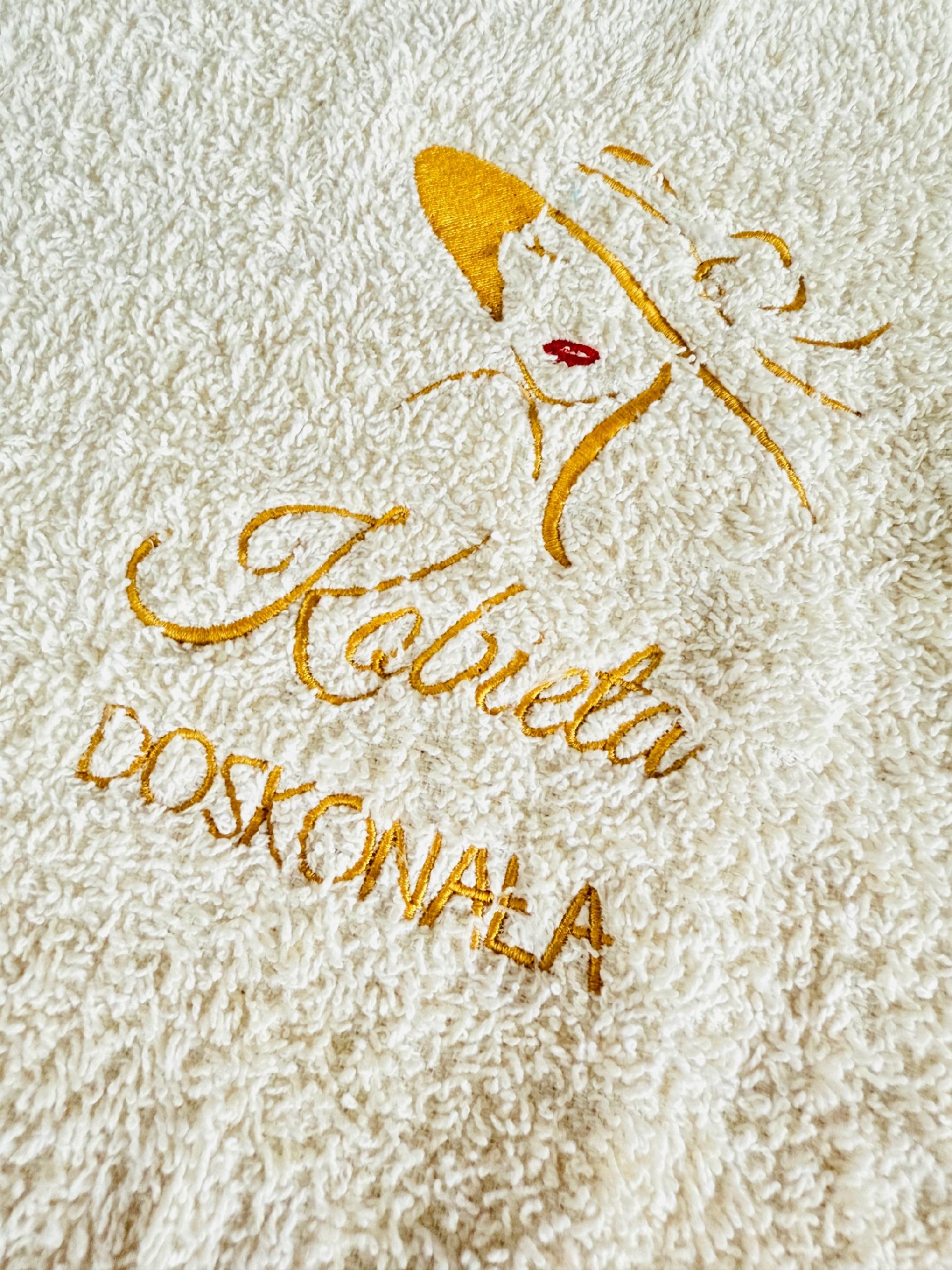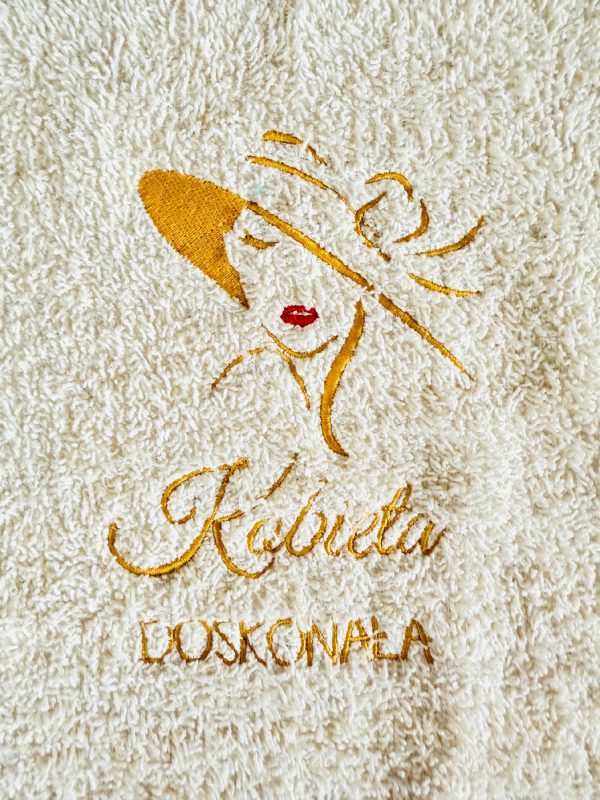 • kremowy ręcznik 100 x 50cm (+/-10% tolerancji rozmiaru) z haftem “Kobieta doskonała” i delikatną grafiką z postacią – nie ma możliwości ingerencji w napis na ręczniku, haft wykonujemy na środku ręcznika