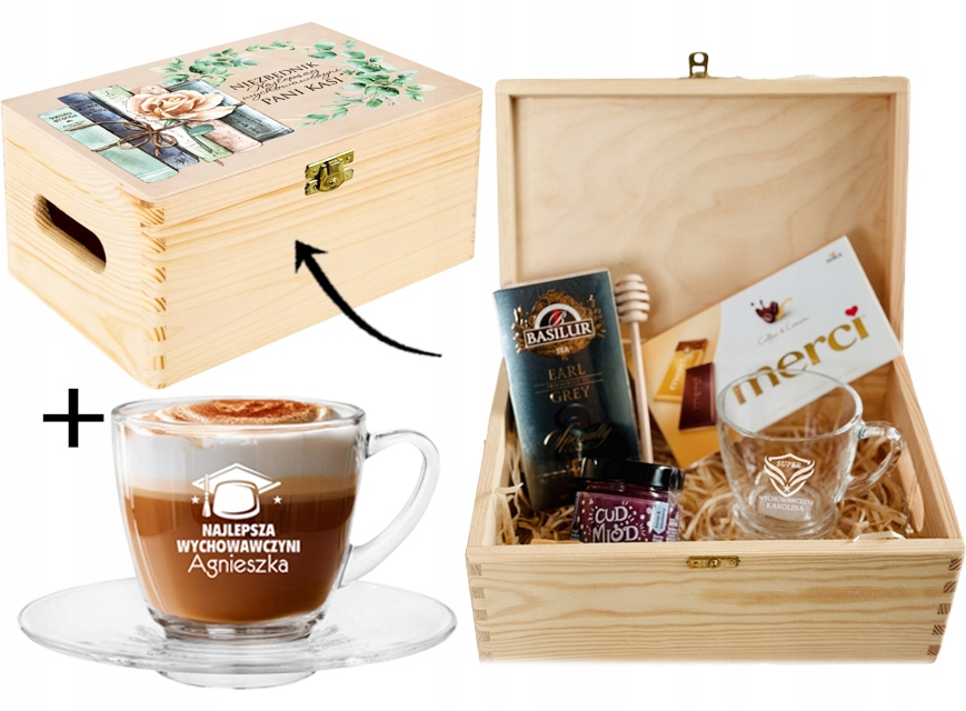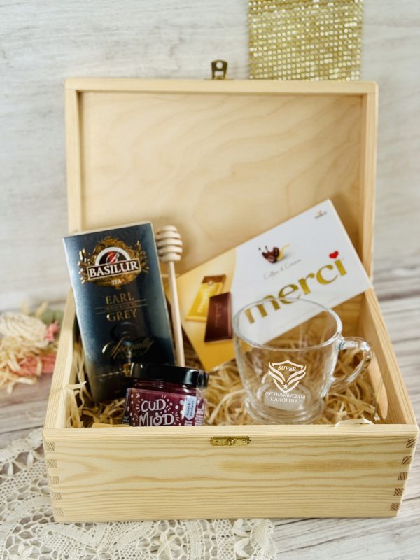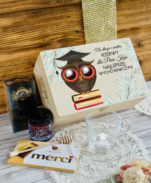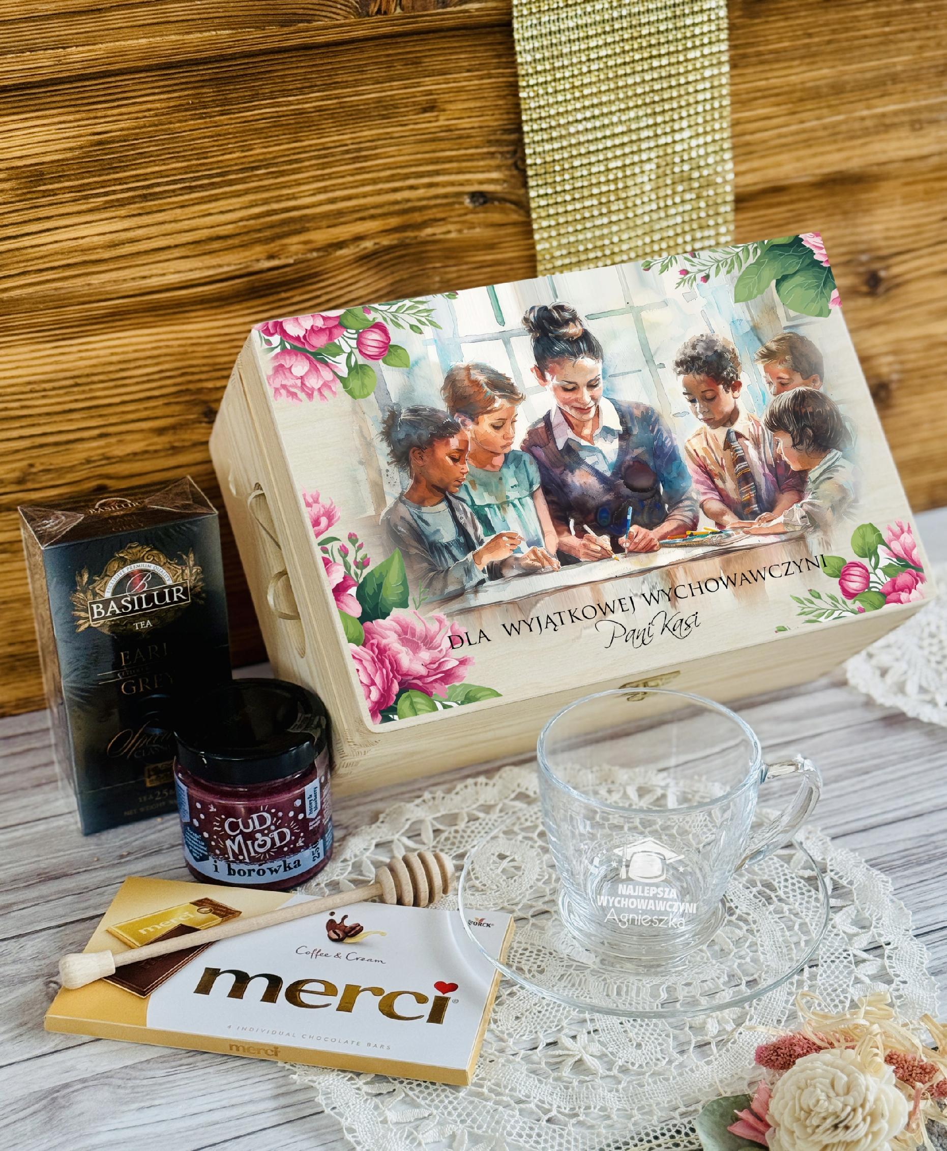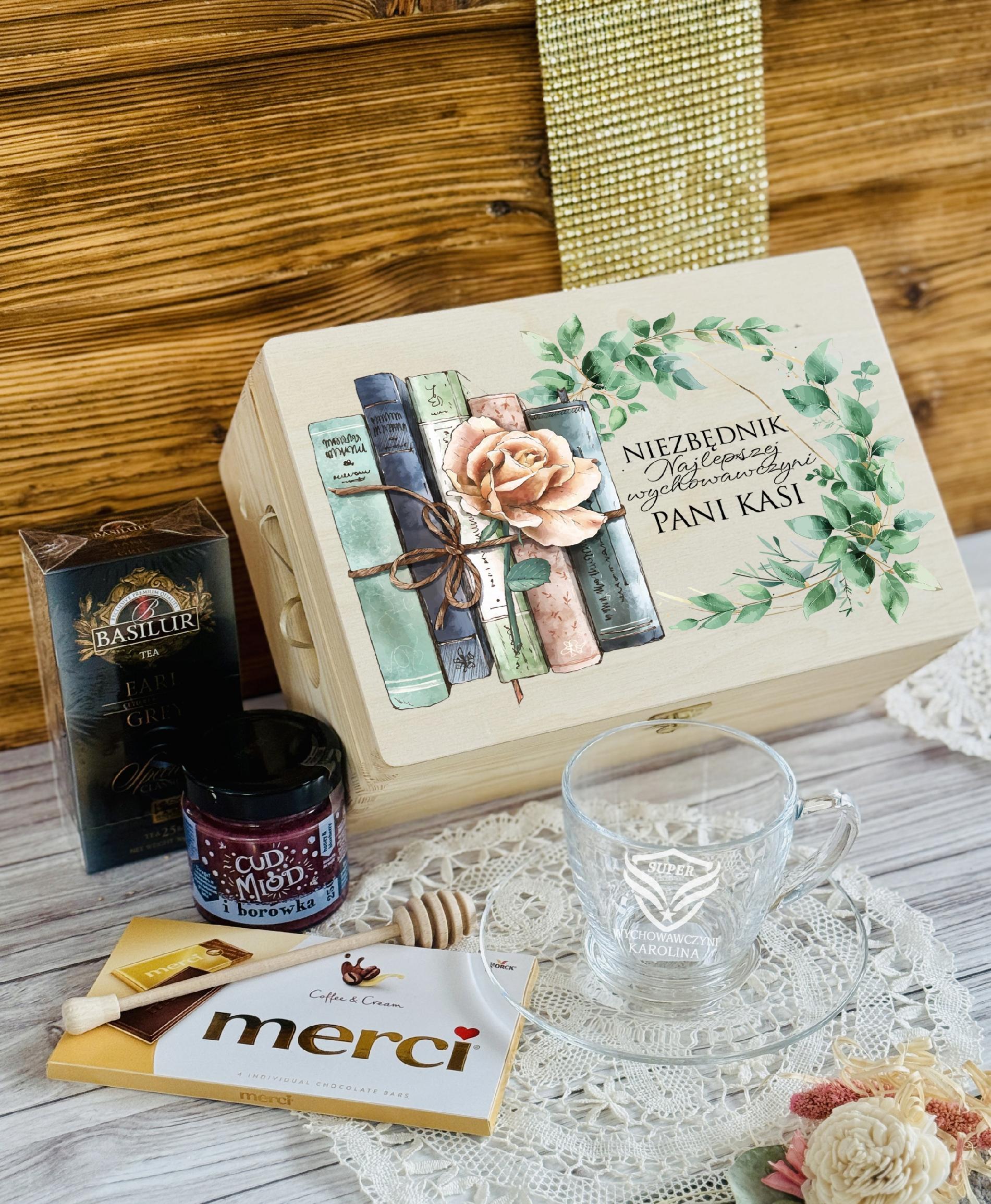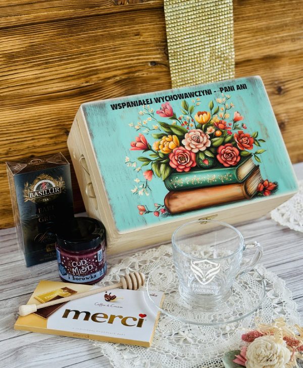 PREZENT upominek na DZIEŃ NAUCZYCIELA ZESTAW w SKRZYNCE z FILIŻANKĄ WZORY
