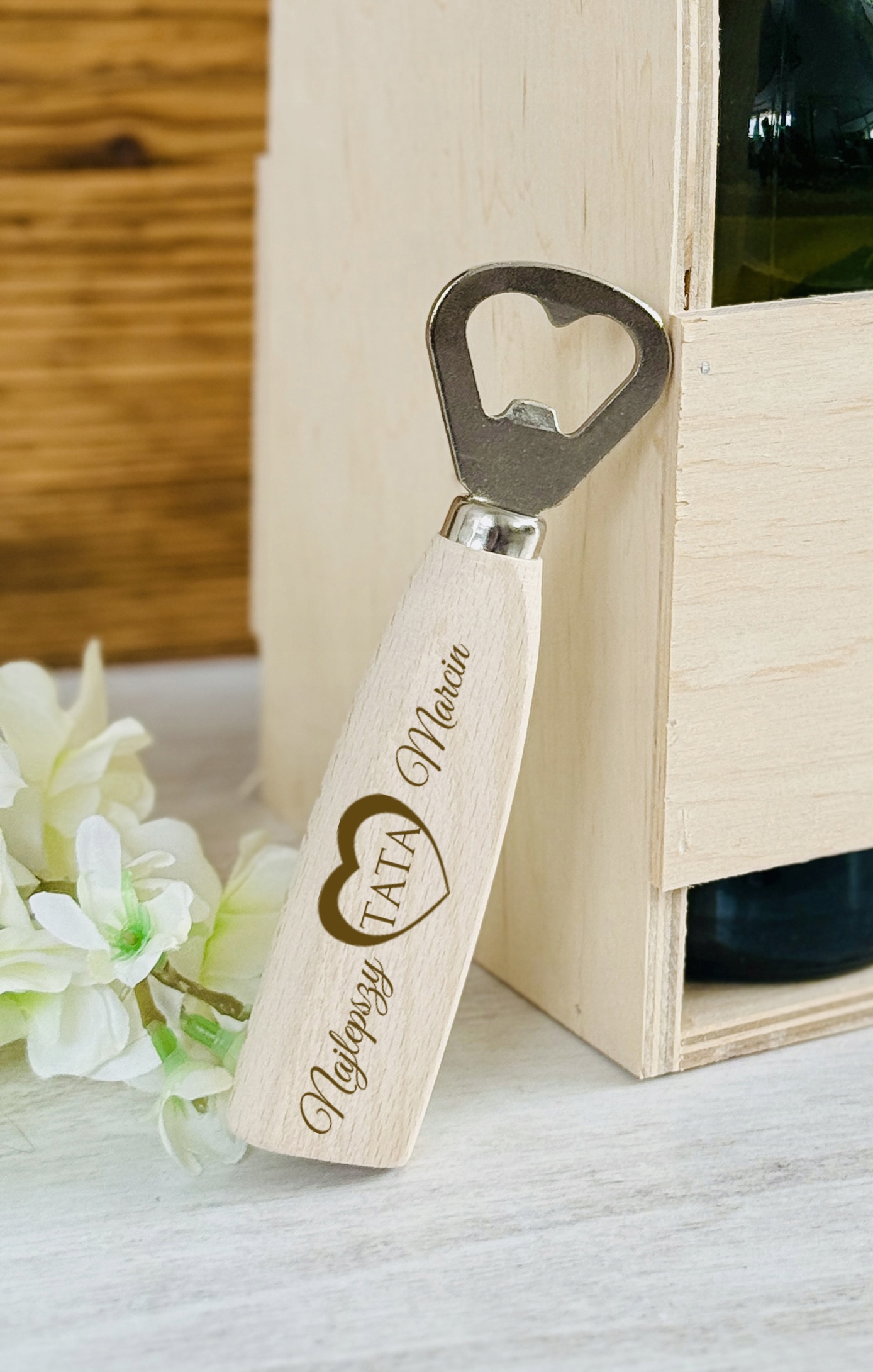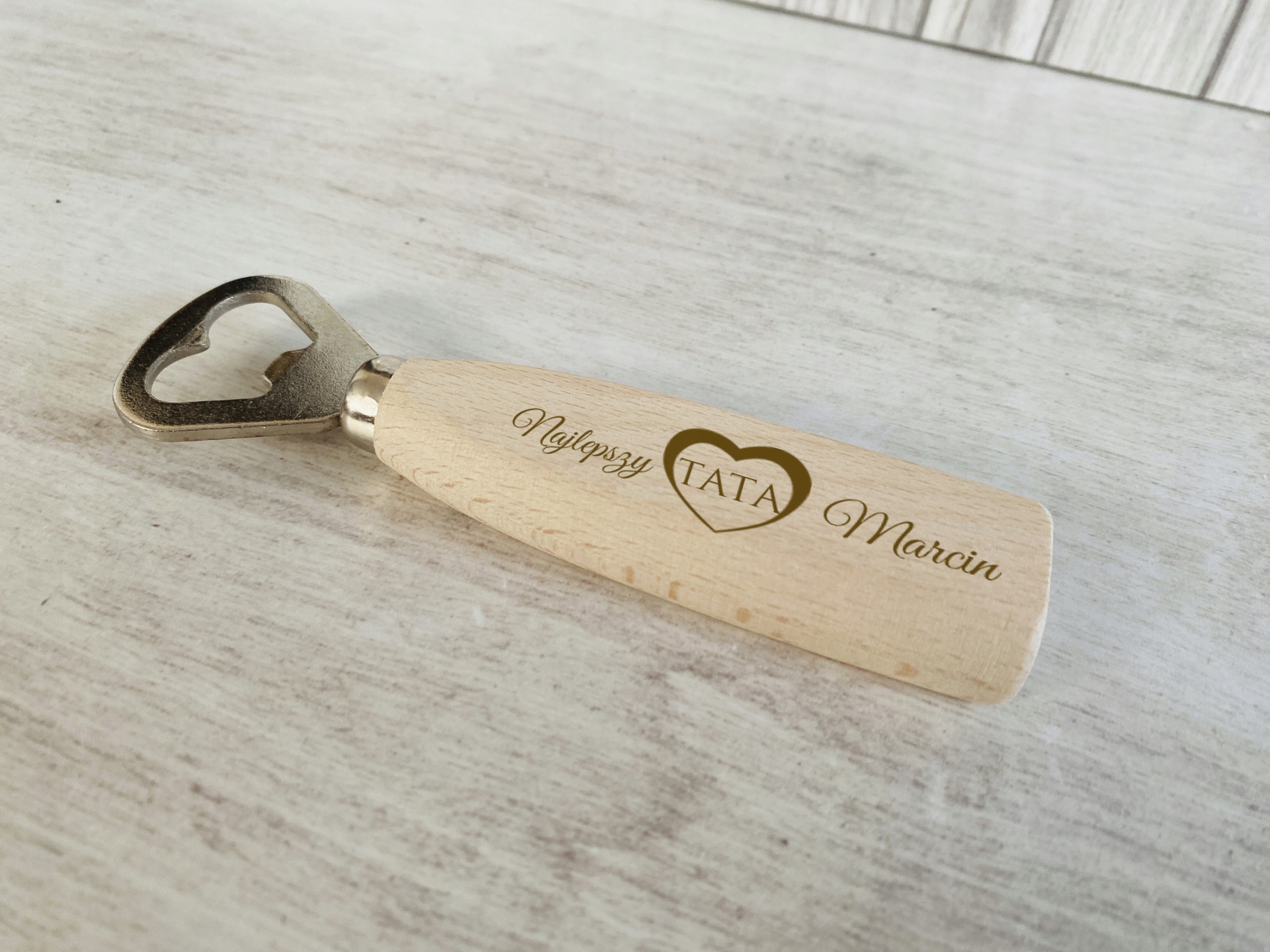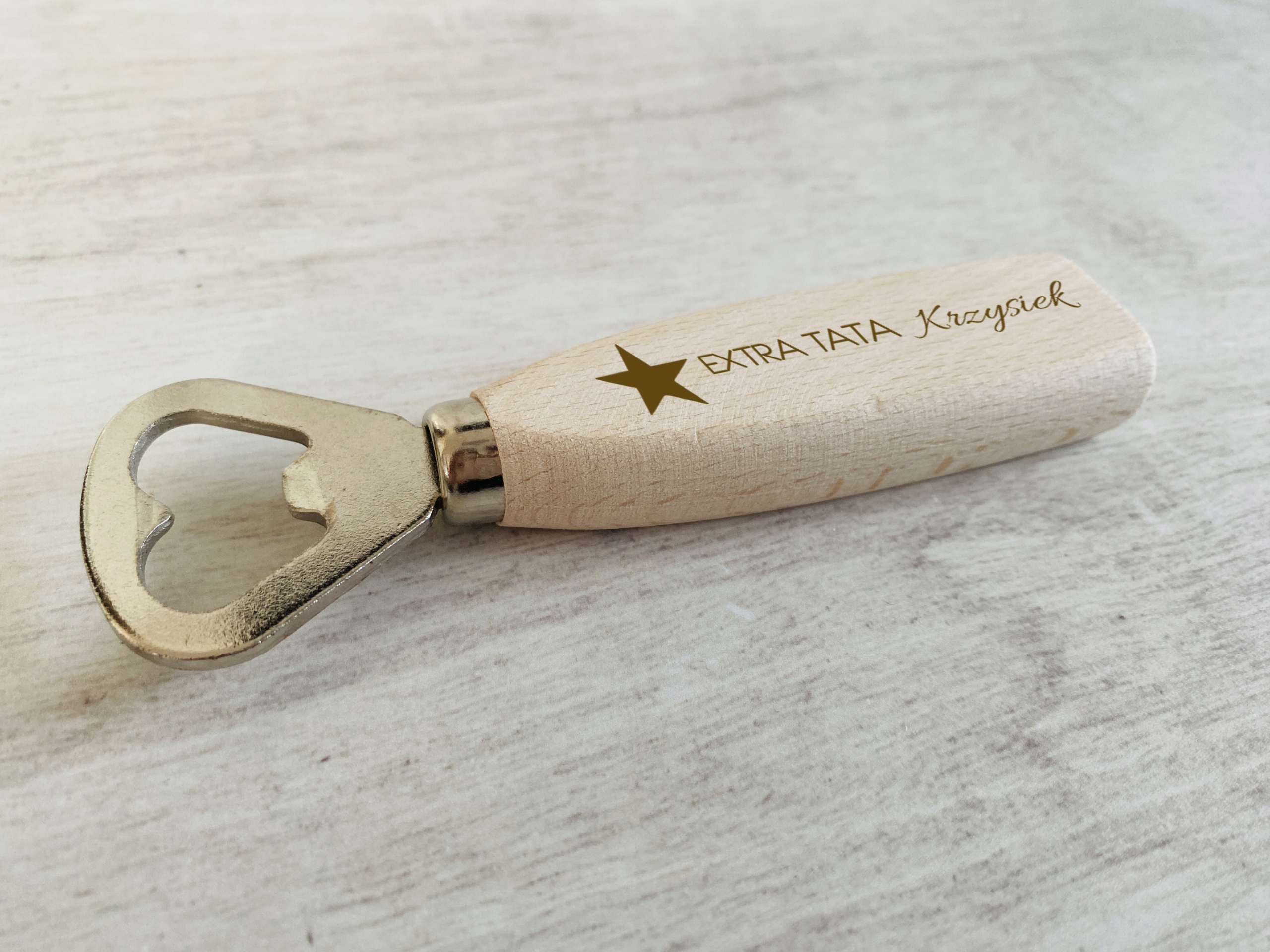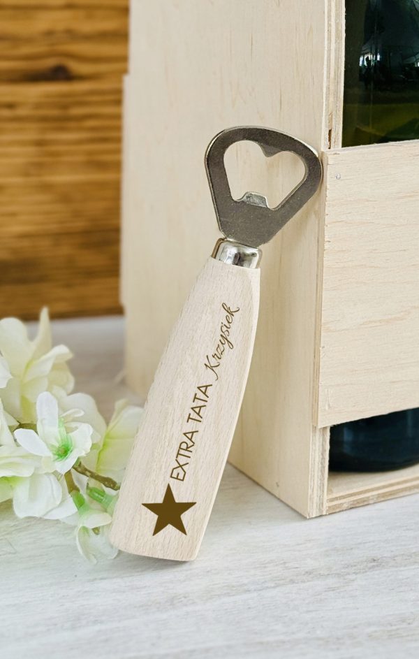 - Wysokiej jakości drewniany otwieracz z laserowym grawerem.