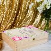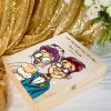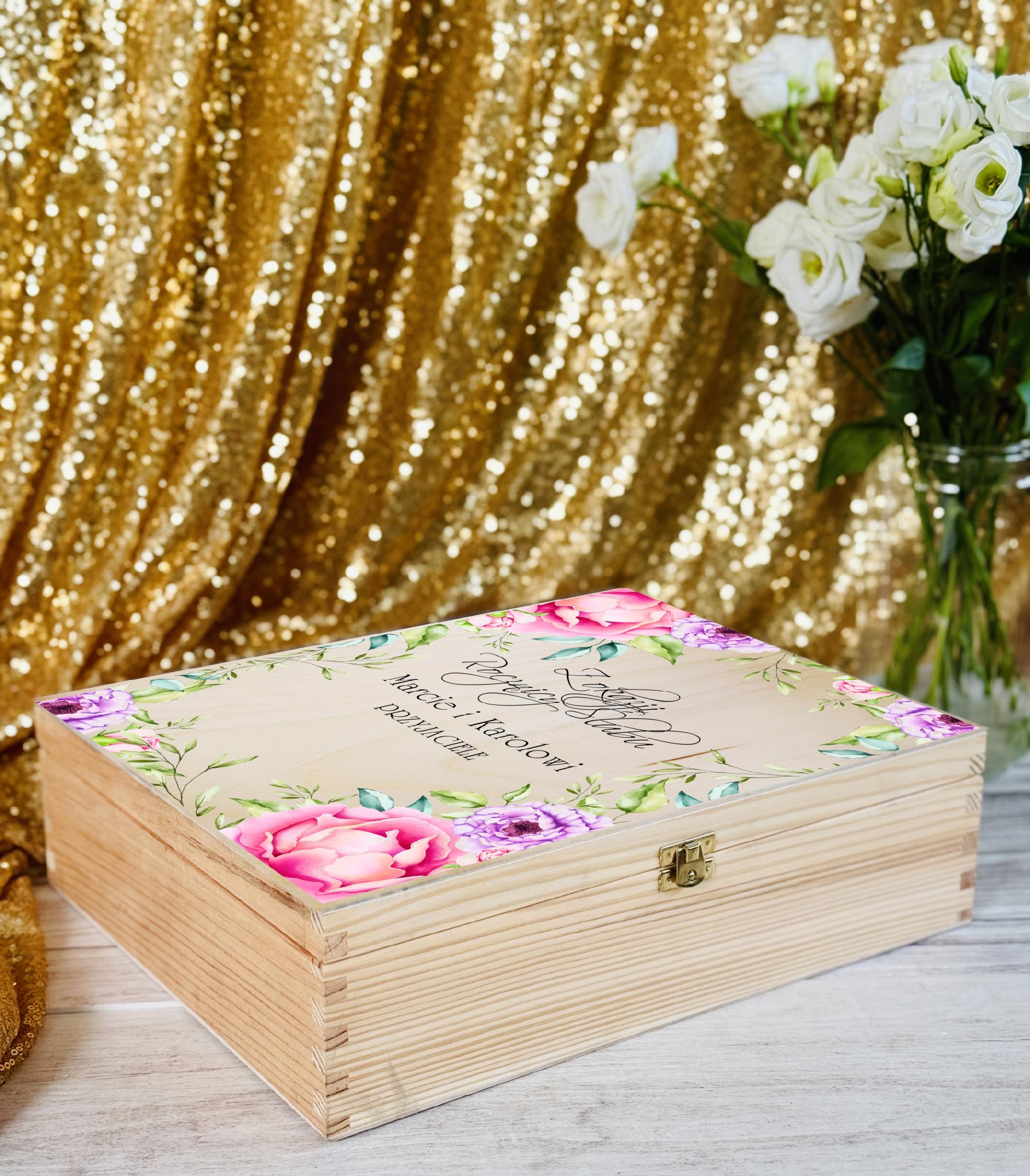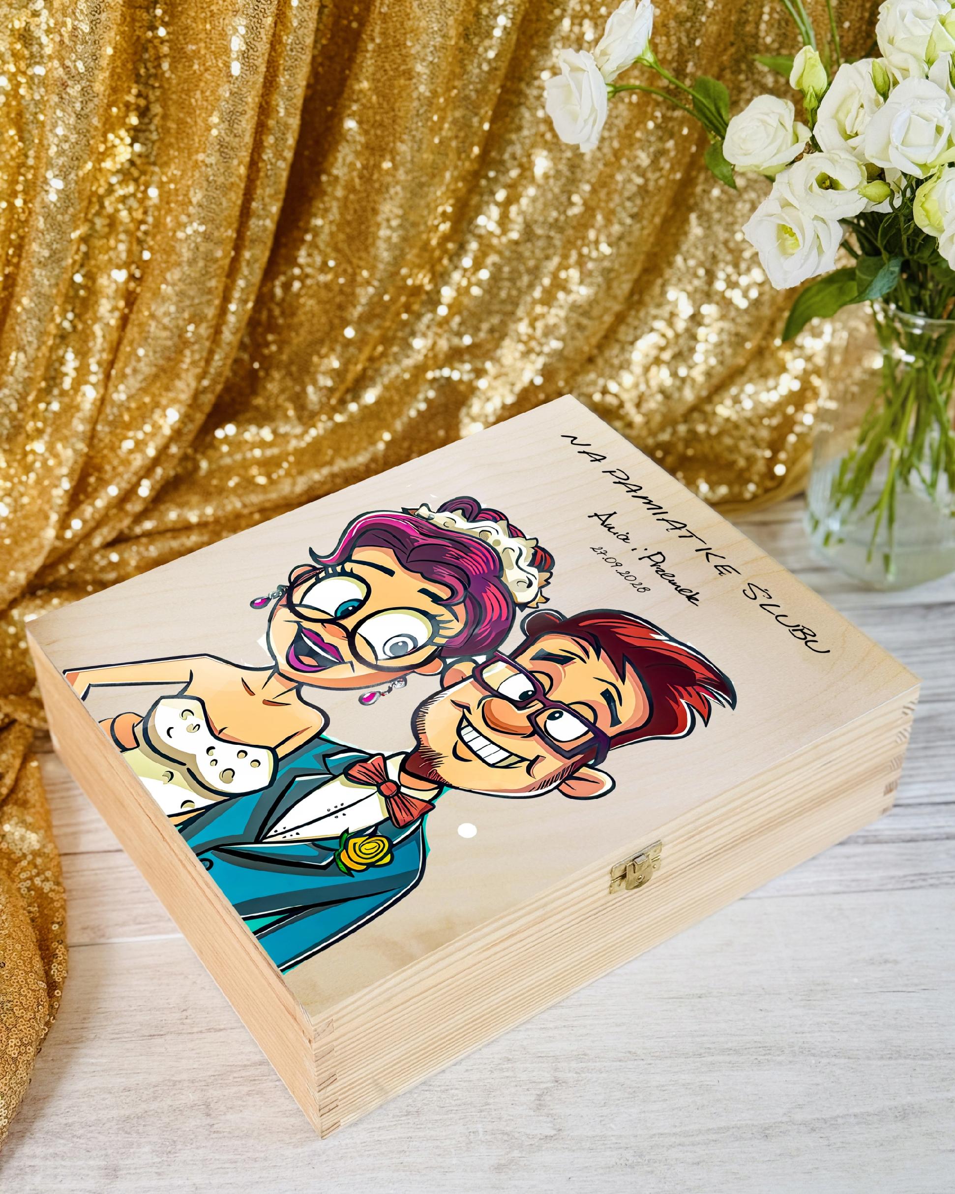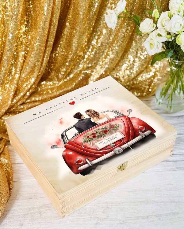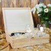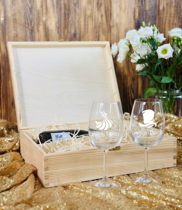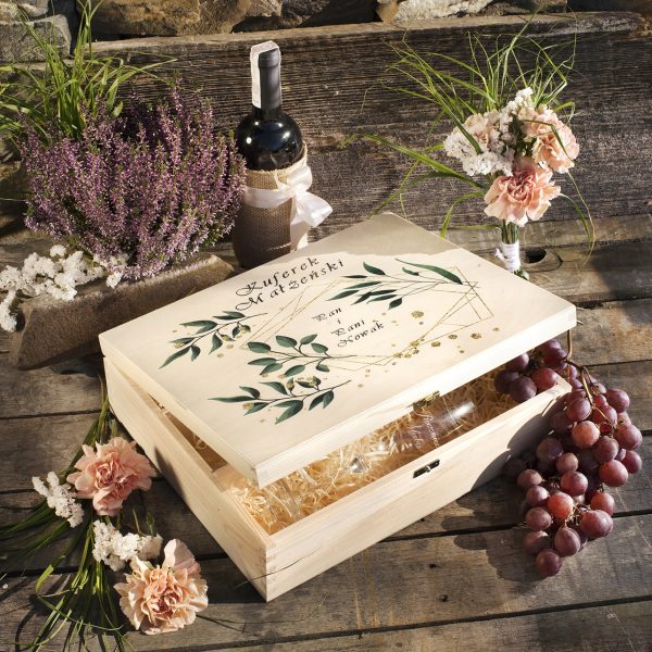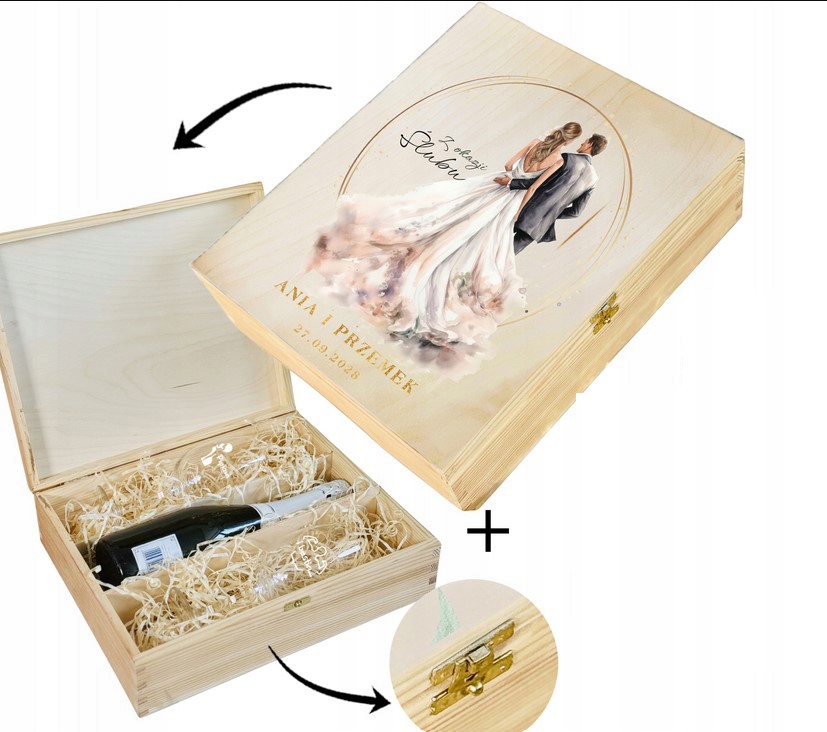 Szukasz niebanalnego sposobu, by podarować upominek w dniu ślubu? Ta drewniana skrzynia to wyjątkowy sposób, by przekazać najlepsze życzenia Nowożeńcom. Wykonana z naturalnego drewna, zachwyca swoją prostotą i elegancją. Wypełniona wełną drzewną z grawerowanymi kieliszkami do wina to oryginalny pomysł na praktyczny upominek.