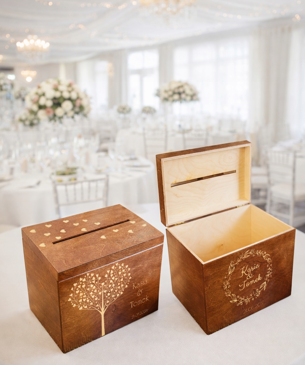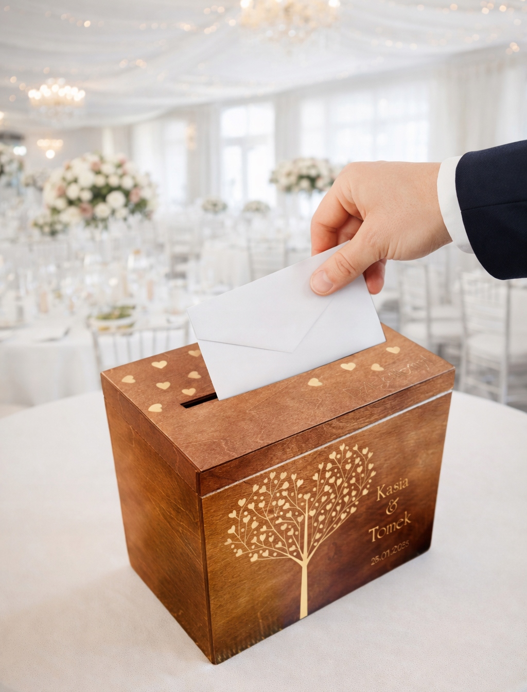 Skrzynka na koperty to nie tylko praktyczny element przyjęcia weselnego, ale również stylowa dekoracja, która idealnie wkomponuje się w aranżację sali. Umożliwia gościom wygodne pozostawienie kopert z życzeniami i prezentami, a Młodej Parze – bezpieczne ich przechowywanie.