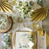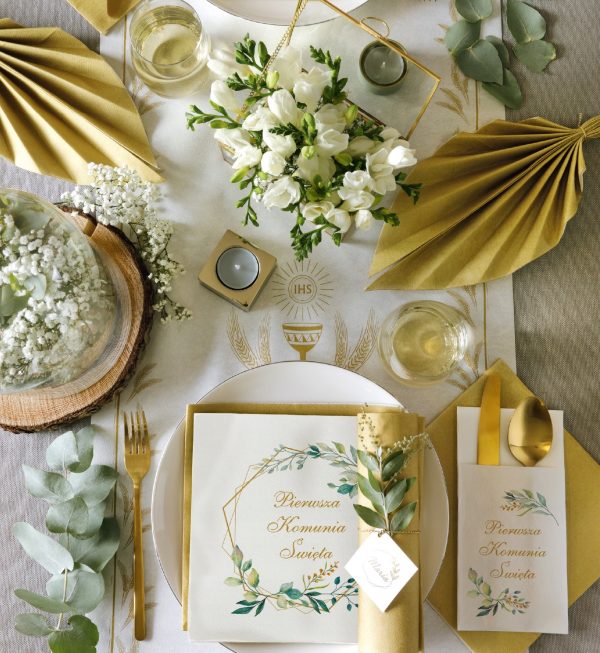 Wzór: złoty napis Pierwsza Komunia Święta, zielono złoty wianuszek z listków eukaliptusa (nadruk jednostronny)
