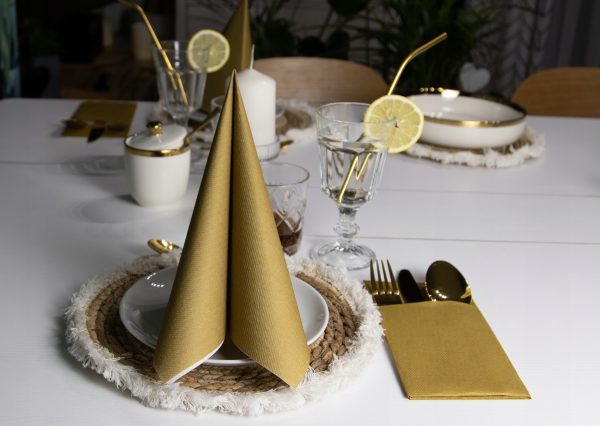 - złote serwetki to obowiązkowy element na stole. Nie tylko nadają elegancji, ale również podkreślają charakter uroczystości.