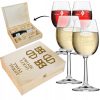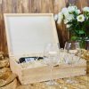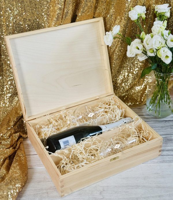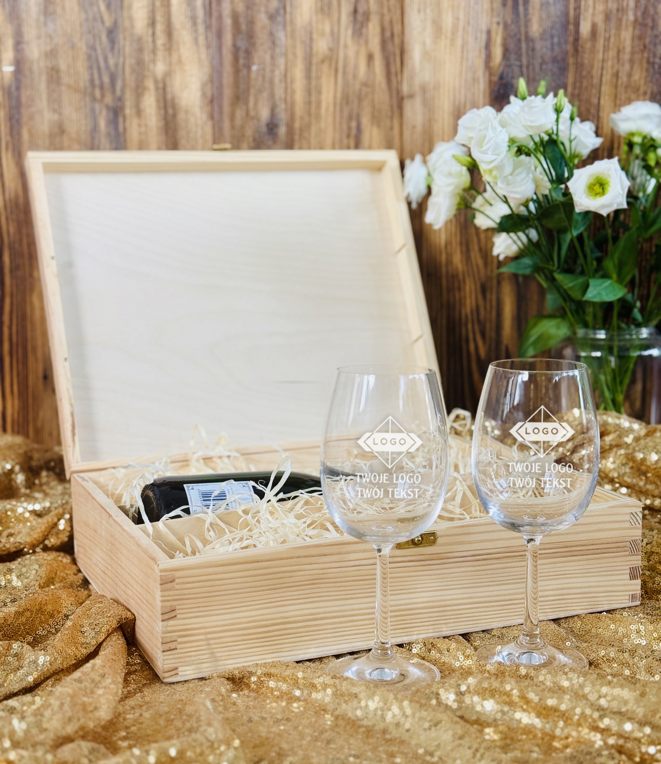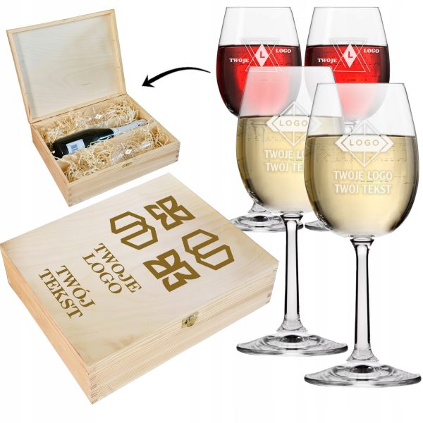 Podaruj wyjątkowy upominek, który łączy w sobie elegancję i praktyczność. Kieliszki do wina umieszczone zostały w solidnej, naturalnej drewnianej skrzynce z zamknięciem na złoty zatrzask. Na wieczku istnieje możliwość umieszczenia logo Twojej firmy, graweru lub dedykowanego napisu, dzięki czemu prezent nabiera indywidualnego charakteru.
