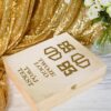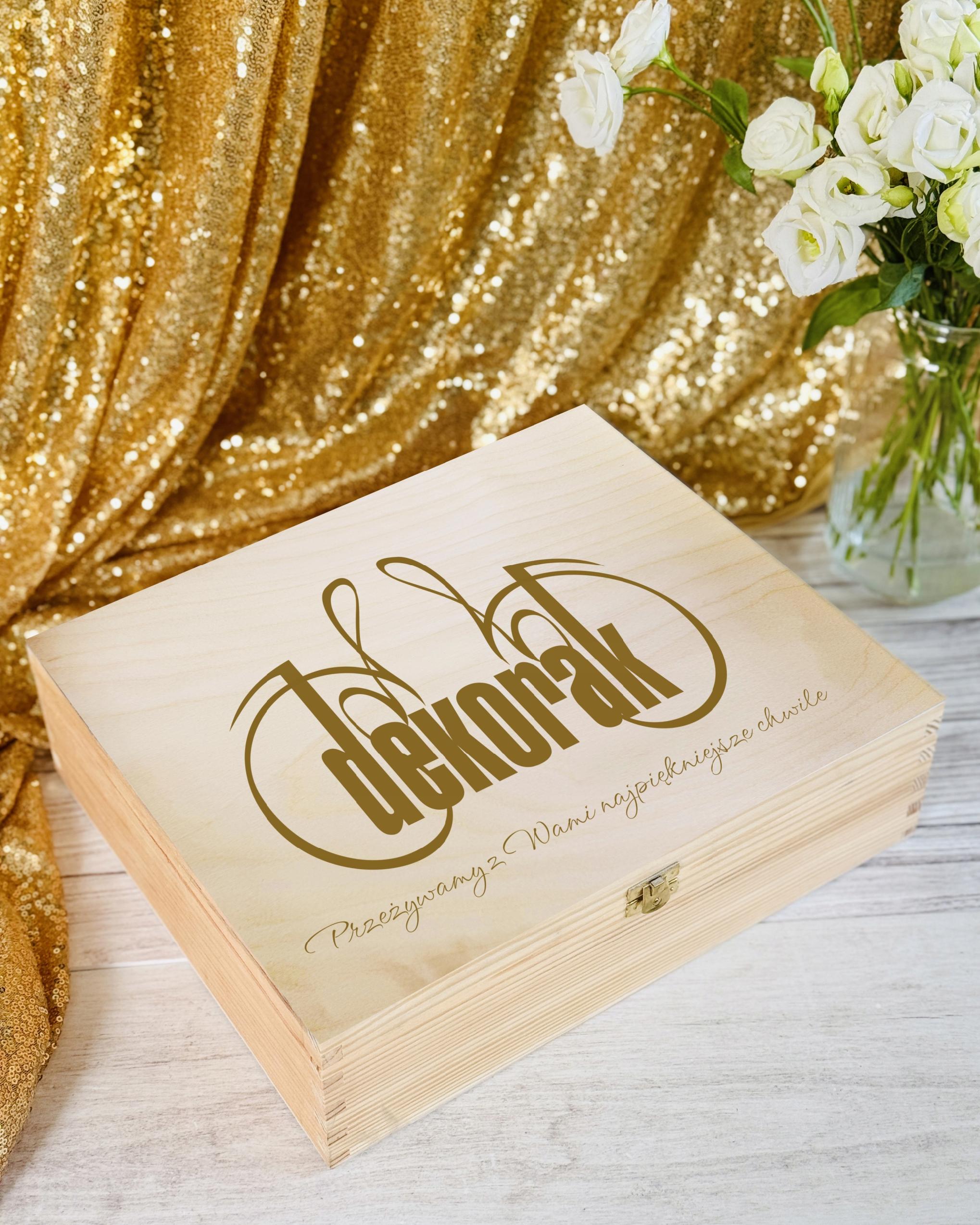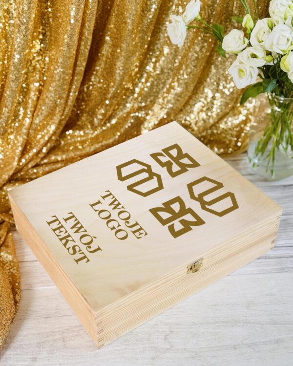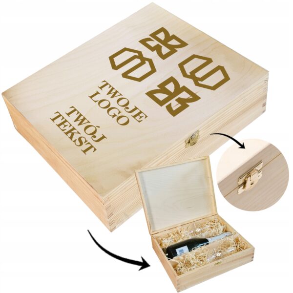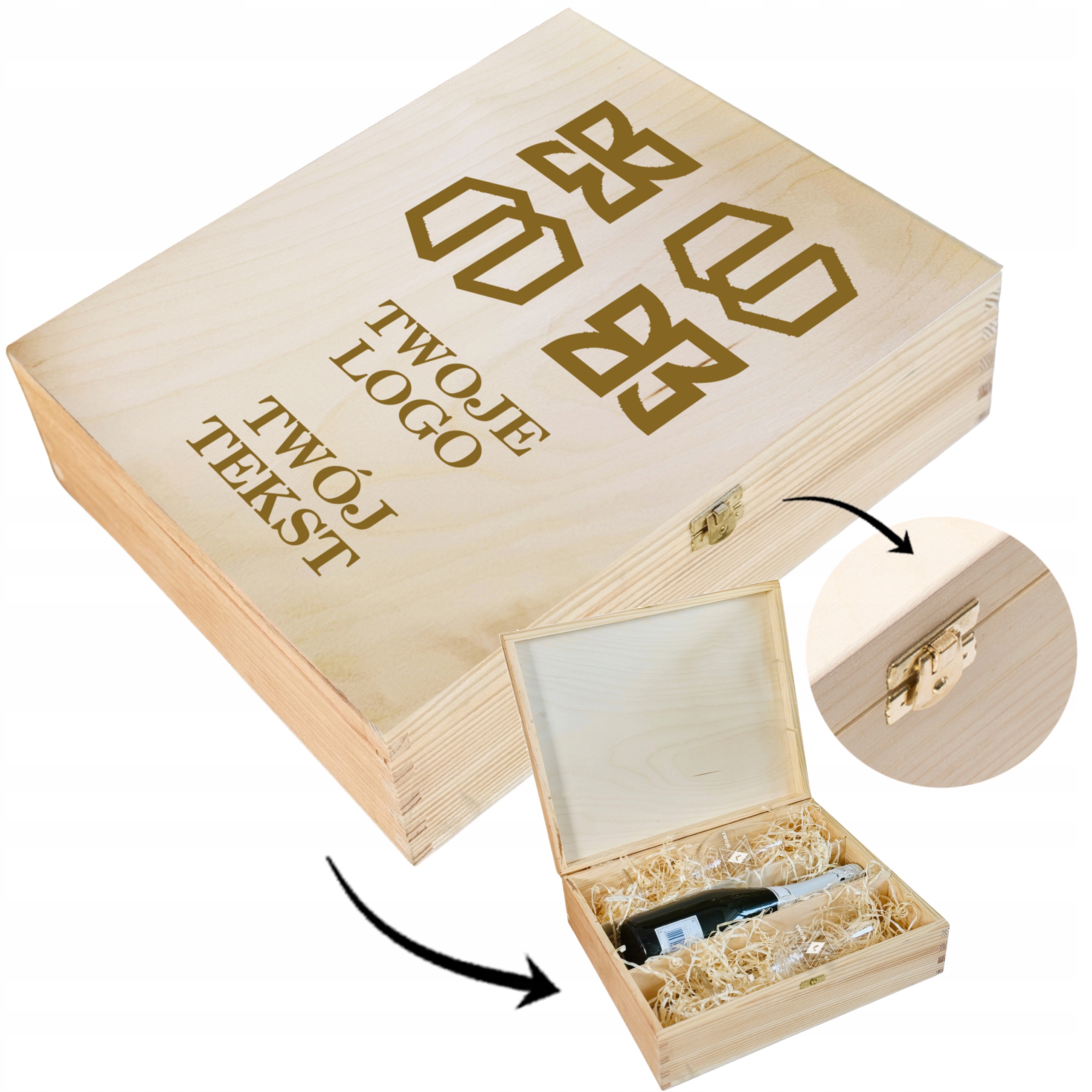 Podaruj wyjątkowy upominek, który łączy w sobie elegancję i praktyczność – solidną, naturalną drewnianą skrzynkę z zamknięciem na złoty zatrzask. Na wieczku istnieje możliwość umieszczenia GRAWERU z logo Twojej firmy lub dedykowanego napisu, dzięki czemu prezent nabiera indywidualnego charakteru.