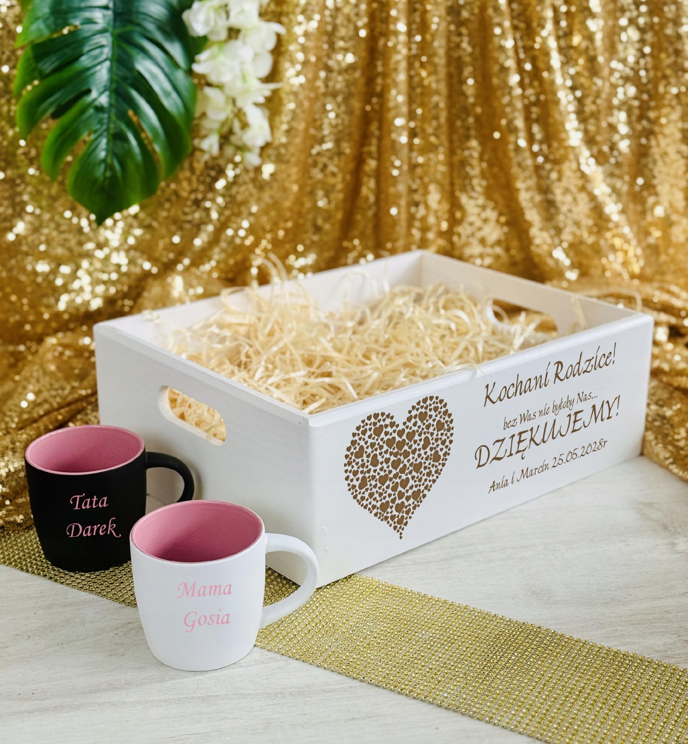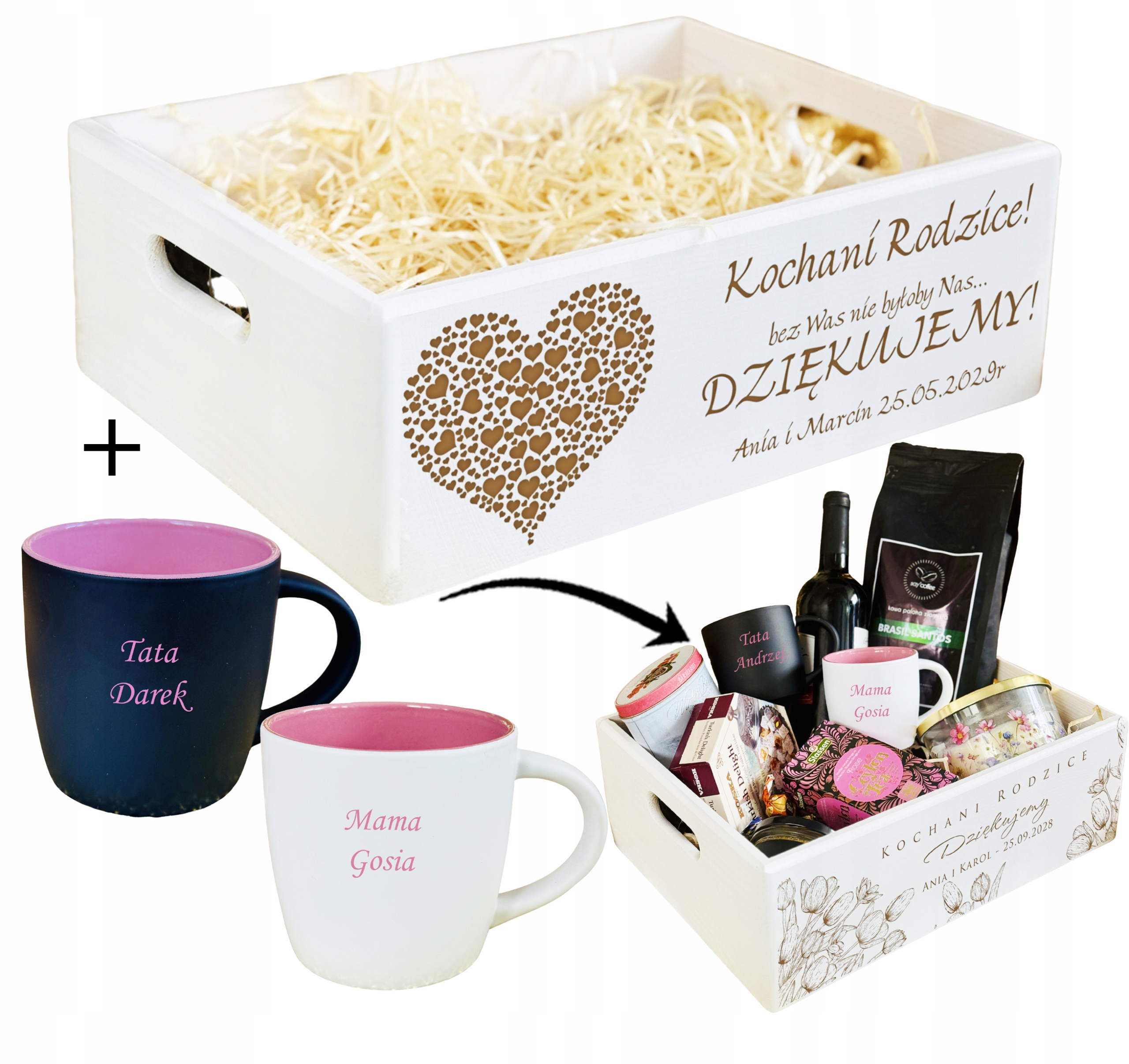 - jeżeli chcecie własny tekst prosimy poinformujcie nas o tym np. skrzynia: wzór 9, Kochana Mamo Dziękujemy, Ania i Łukasz, 26.08.2026r. kubki: Mama Kasia, Tata Andrzej
