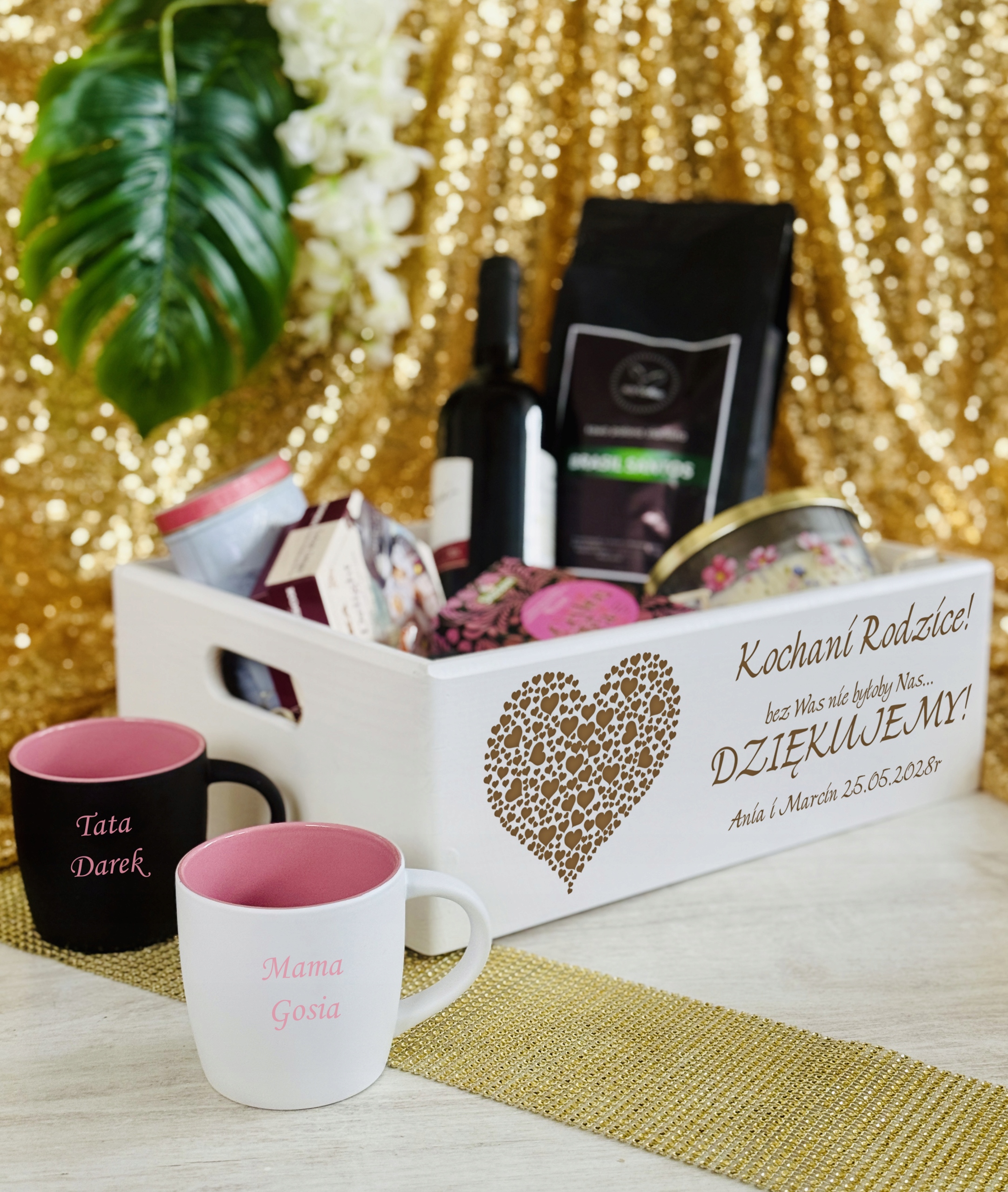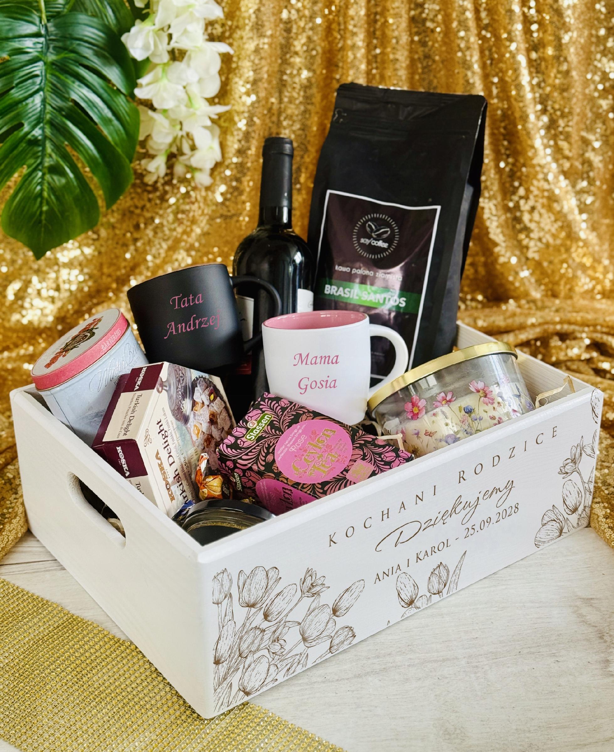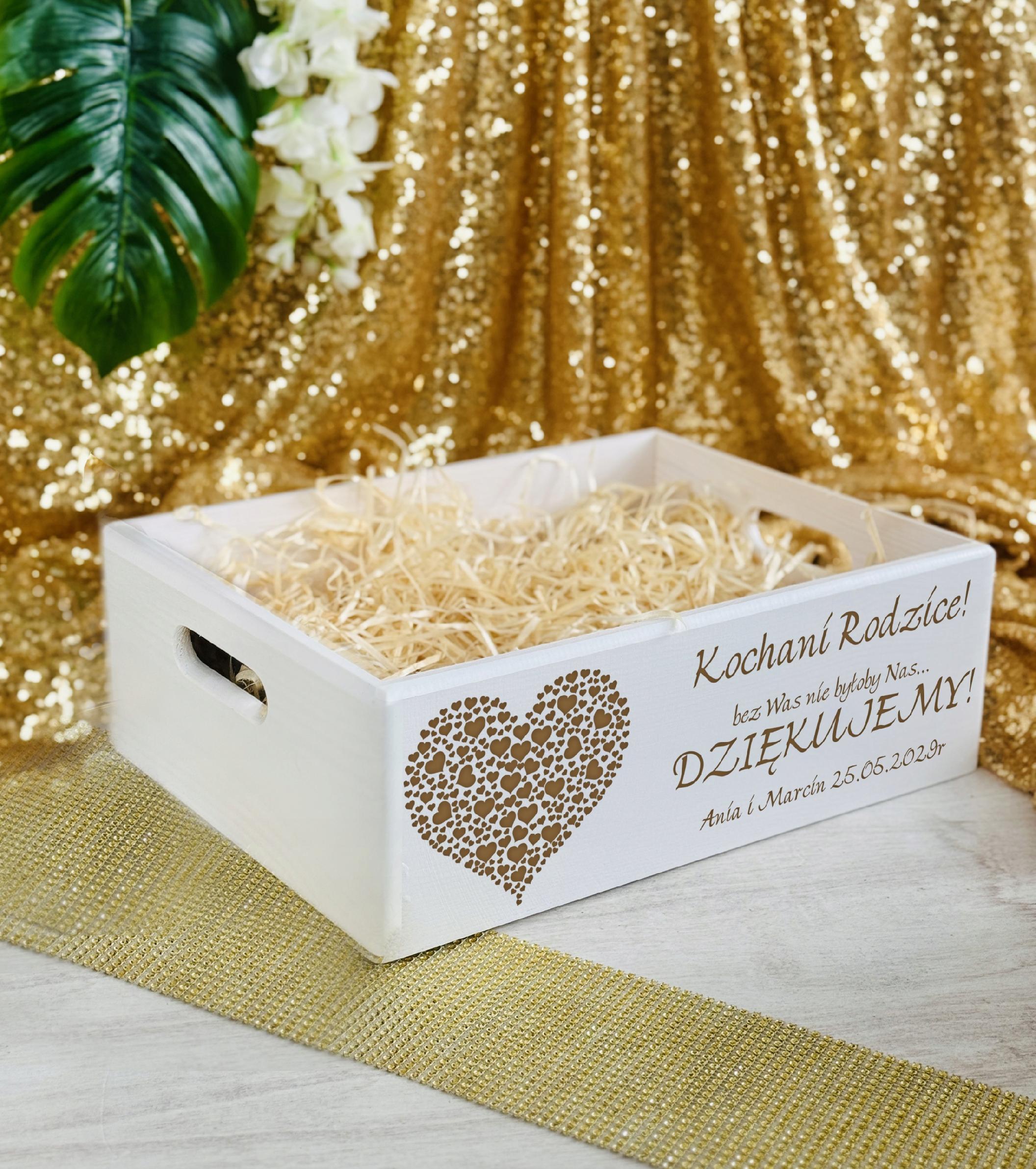 Szukasz niebanalnego sposobu, by podziękować rodzicom w dniu ślubu? Ta drewniana skrzynia prezentowa to wyjątkowy sposób, by wyrazić wdzięczność i miłość. Wykonana z naturalnego drewna, pomalowana na biało zachwyca swoją prostotą i elegancją. Można ją wypełnić słodkościami, zdjęciami, listem od serca lub innymi drobiazgami, które będą miały dla Was szczególne znaczenie.