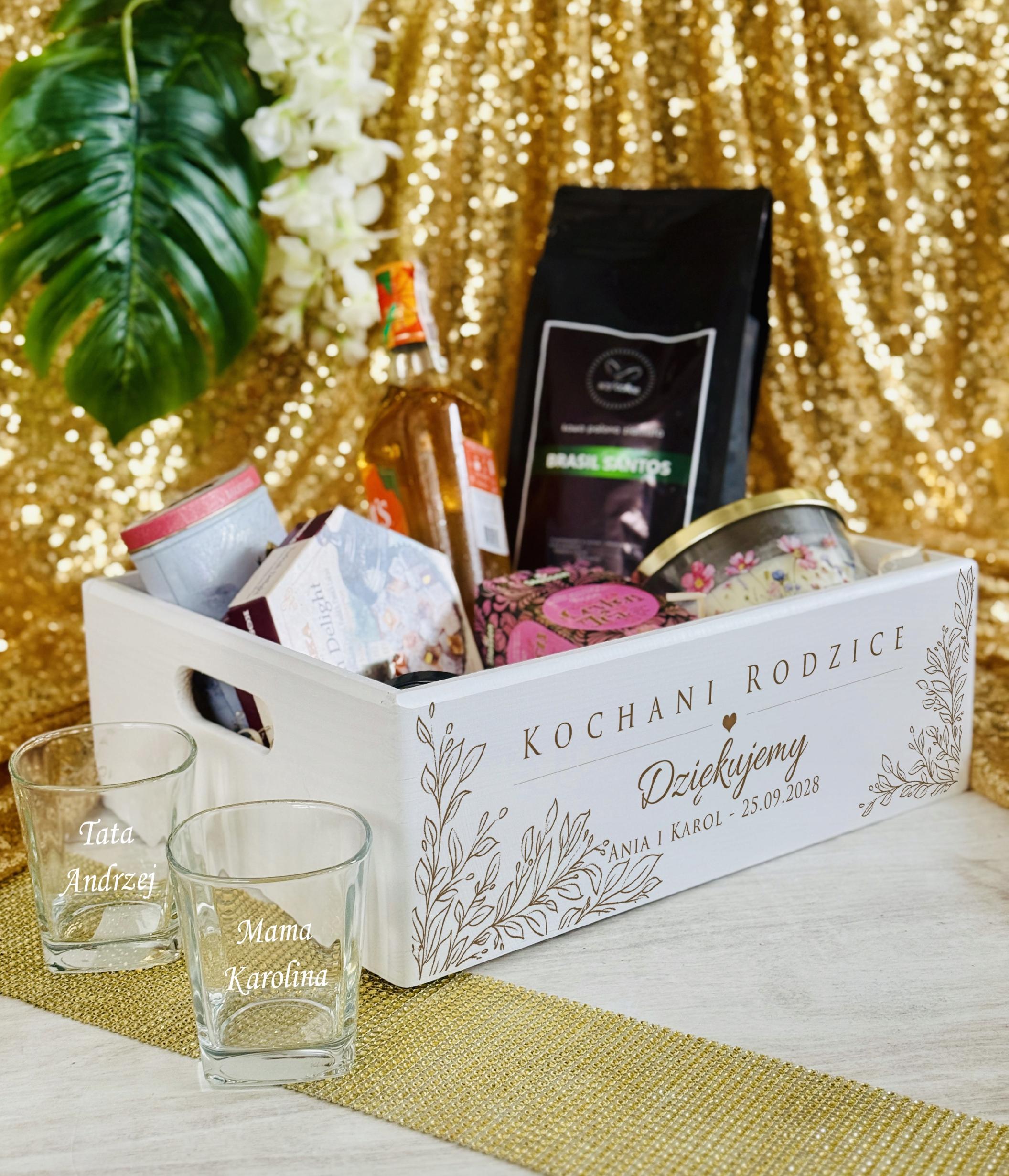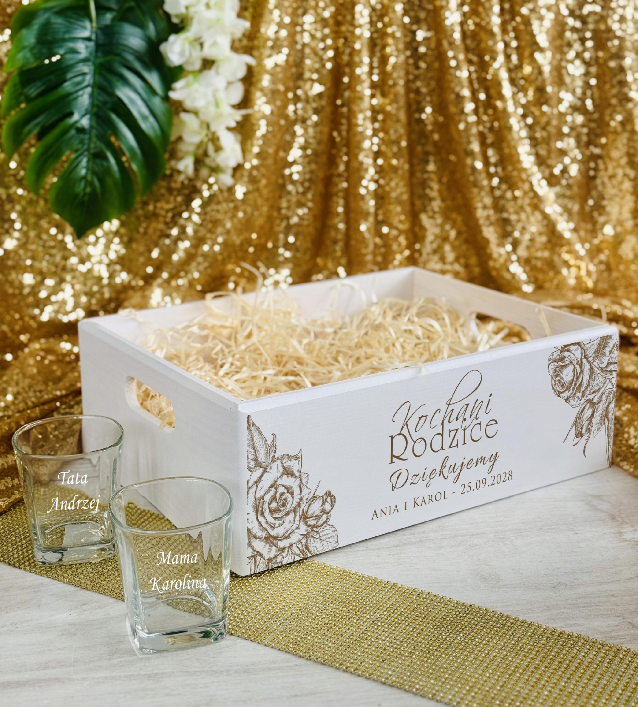 - jeżeli chcecie własny tekst prosimy poinformujcie nas o tym np. skrzynia: wzór 9, Kochana Mamo Dziękujemy, Ania i Łukasz, 26.08.2026r. szklanki: Mama Kasia, Tata Andrzej