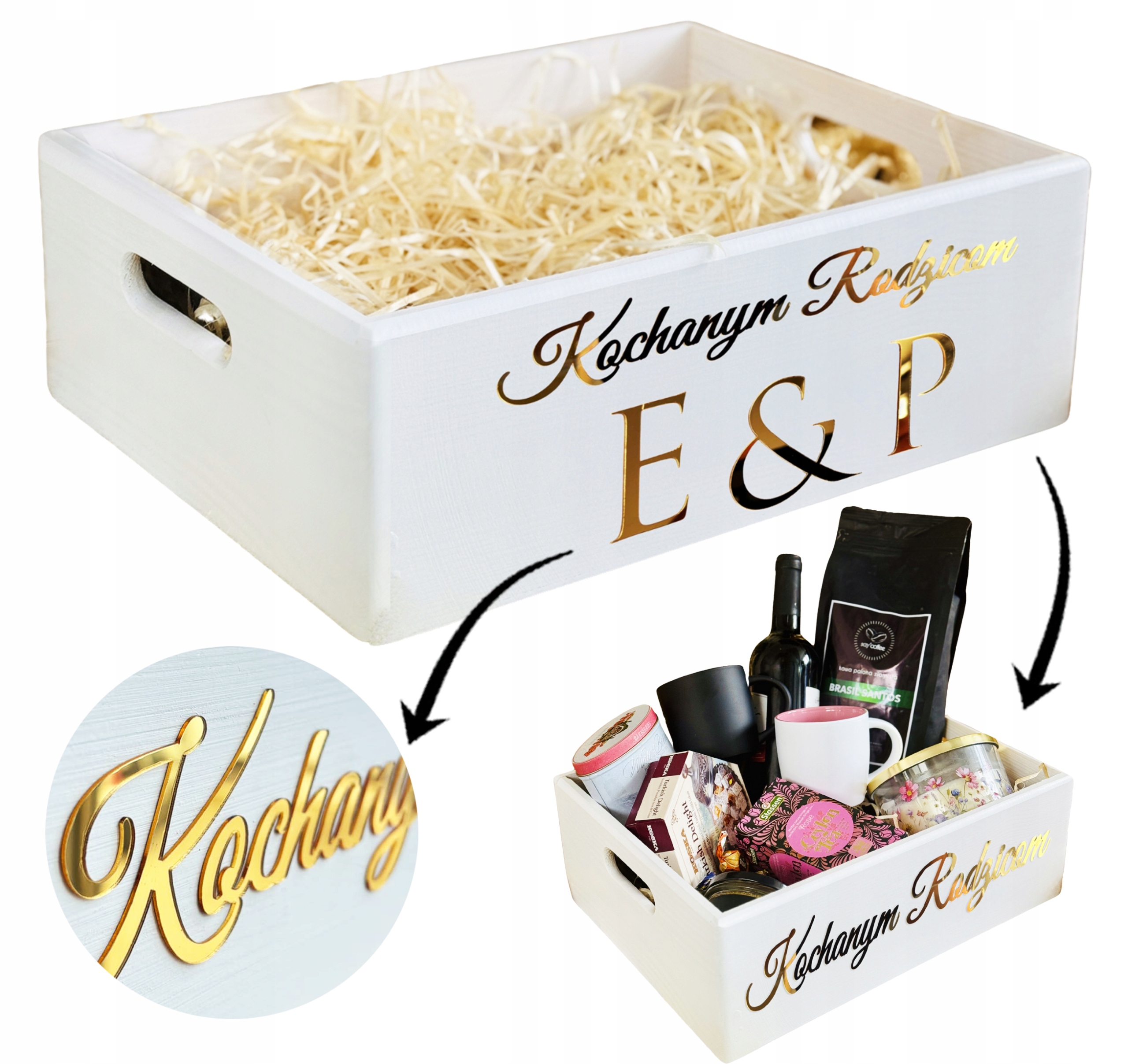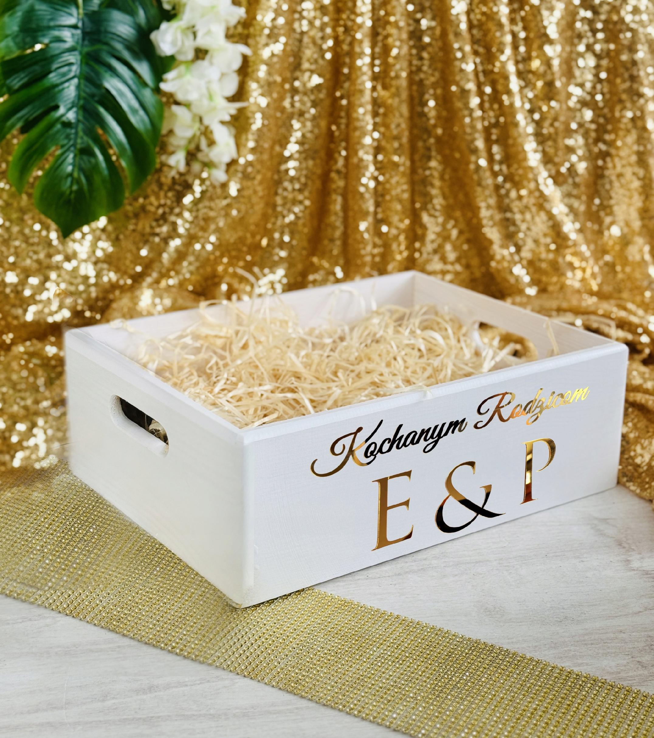 Szukasz niebanalnego sposobu, by podziękować rodzicom w dniu ślubu? Ta duża drewniana skrzynia prezentowa w białym kolorze to wyjątkowy sposób, by wyrazić wdzięczność i miłość. Wykonana z naturalnego drewna, zachwyca swoją prostotą i elegancją. Złoty napis dodaje jej blasku i elegancji. Można ją wypełnić słodkościami, zdjęciami, listem od serca lub innymi drobiazgami, które będą miały dla Was szczególne znaczenie.