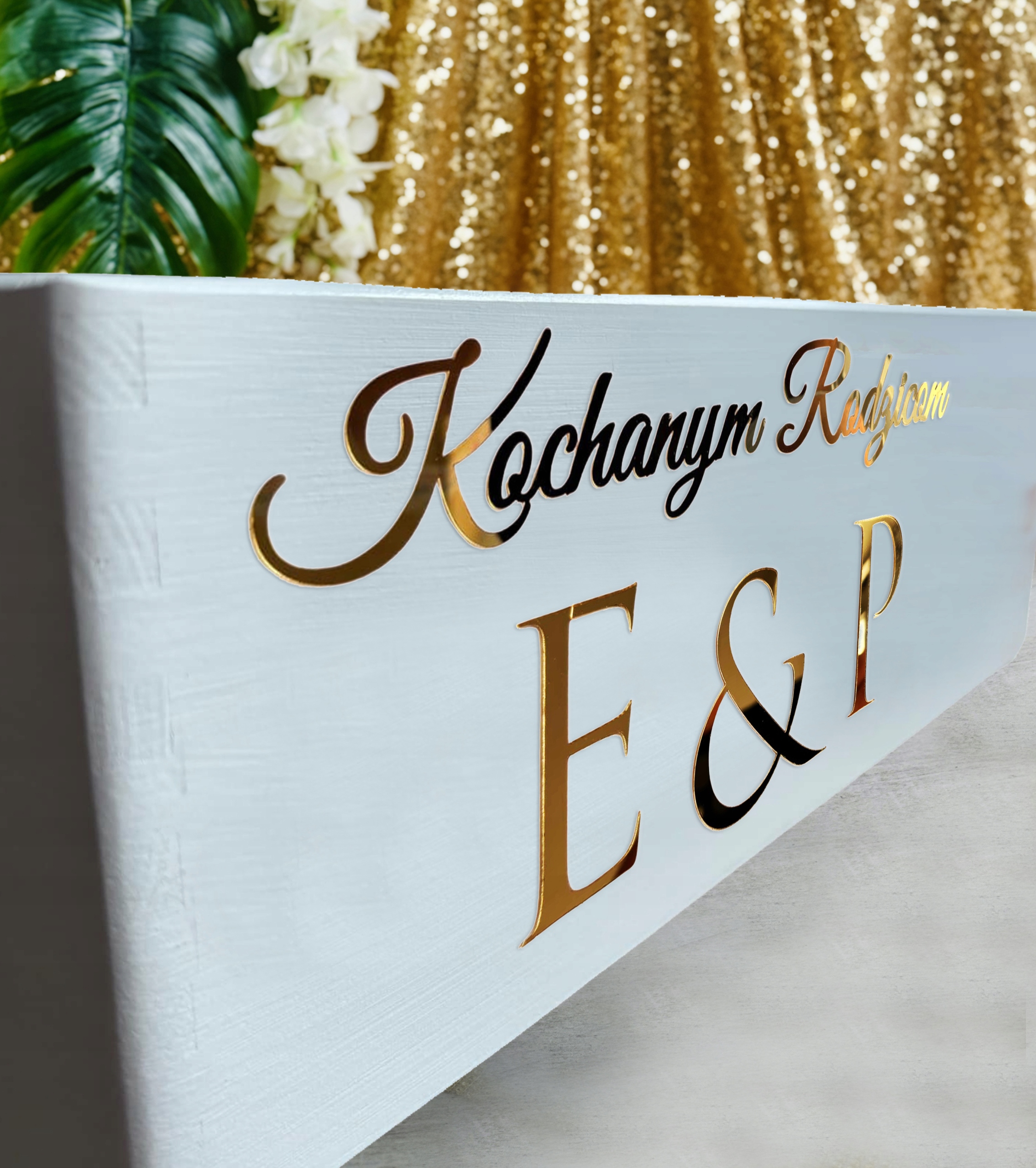 ✅ Złoty napis “Kochanym Rodzicom” + imiona lub inicjały – pięknie mieniący się, naklejony na skrzynię