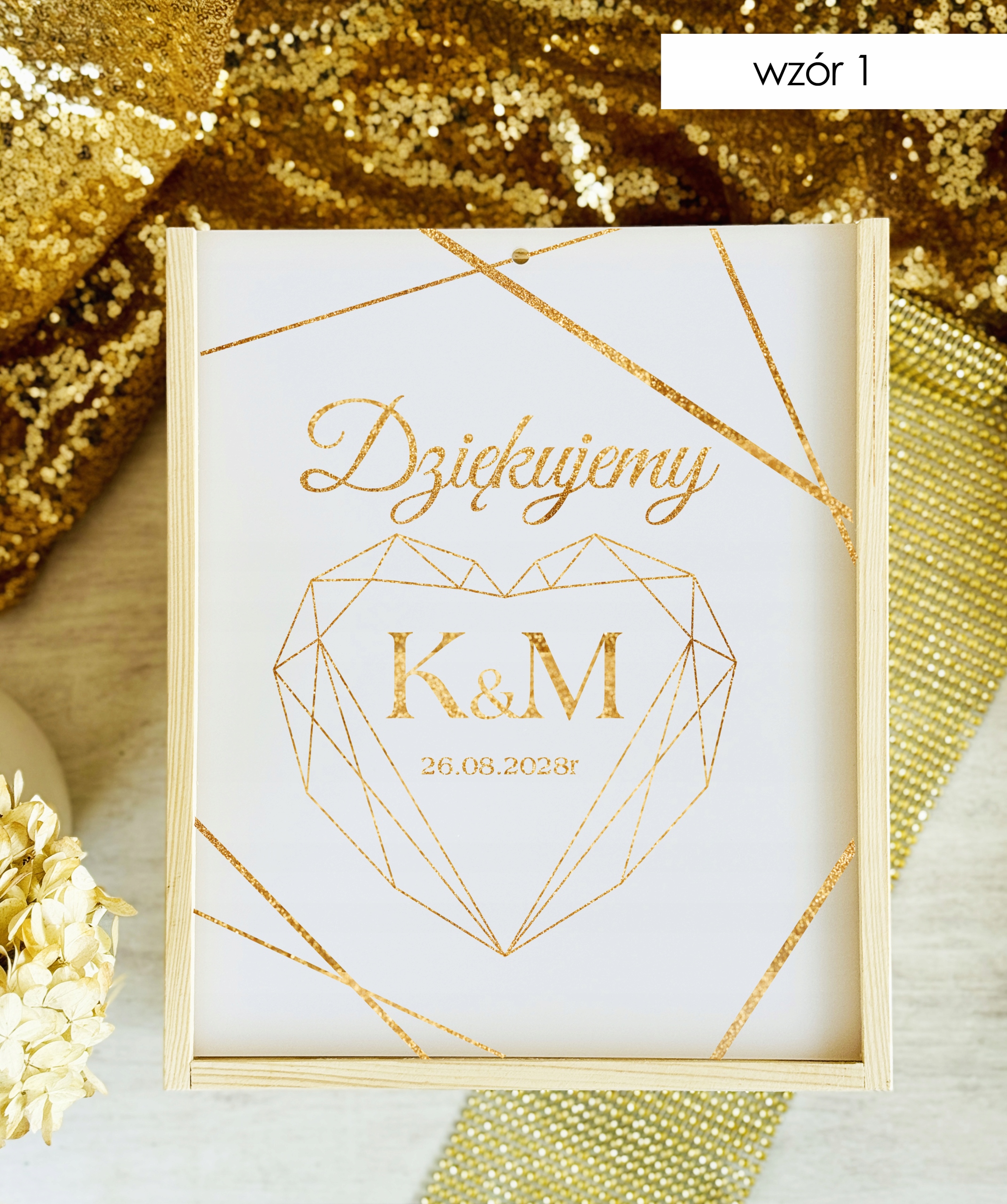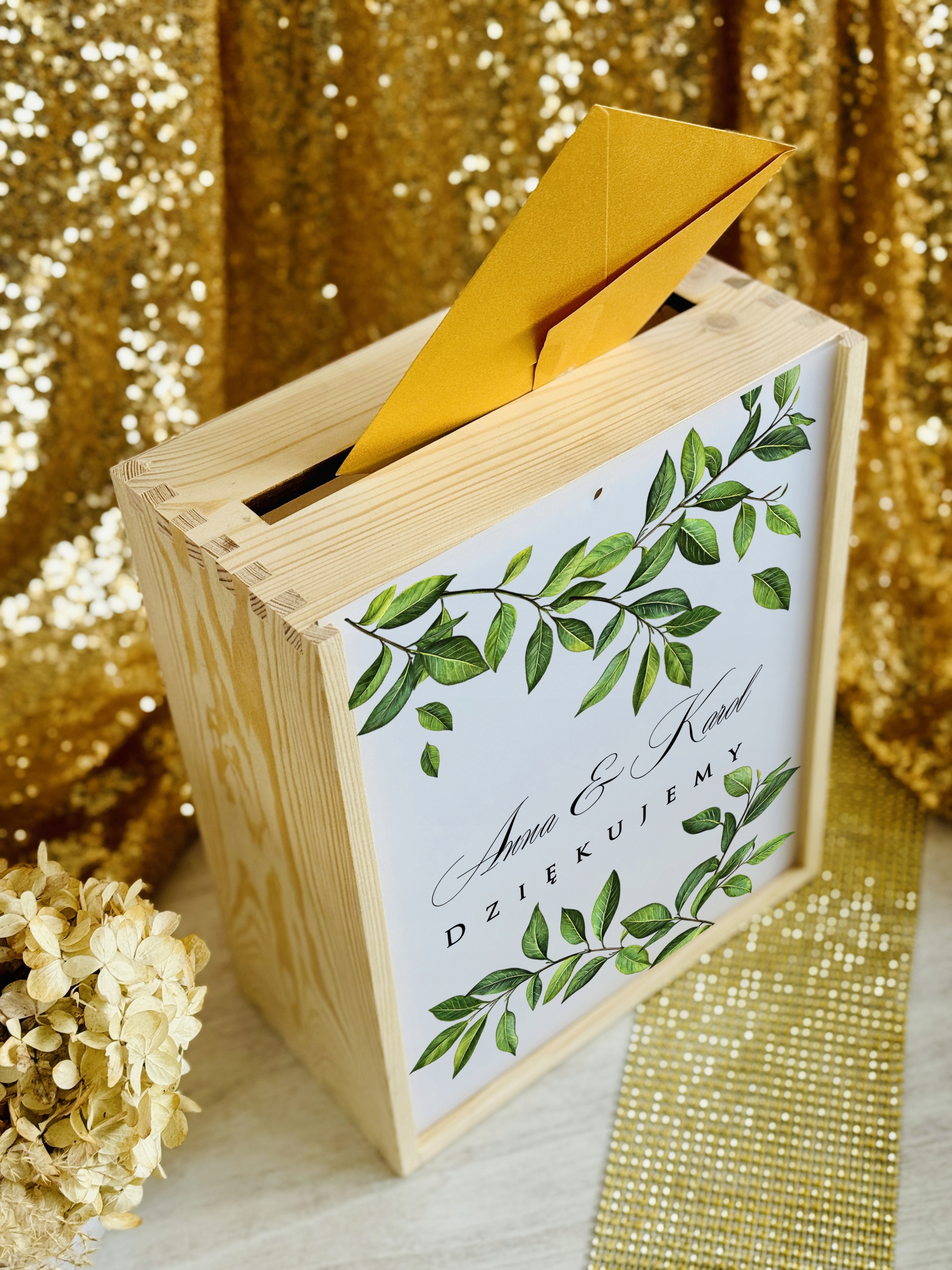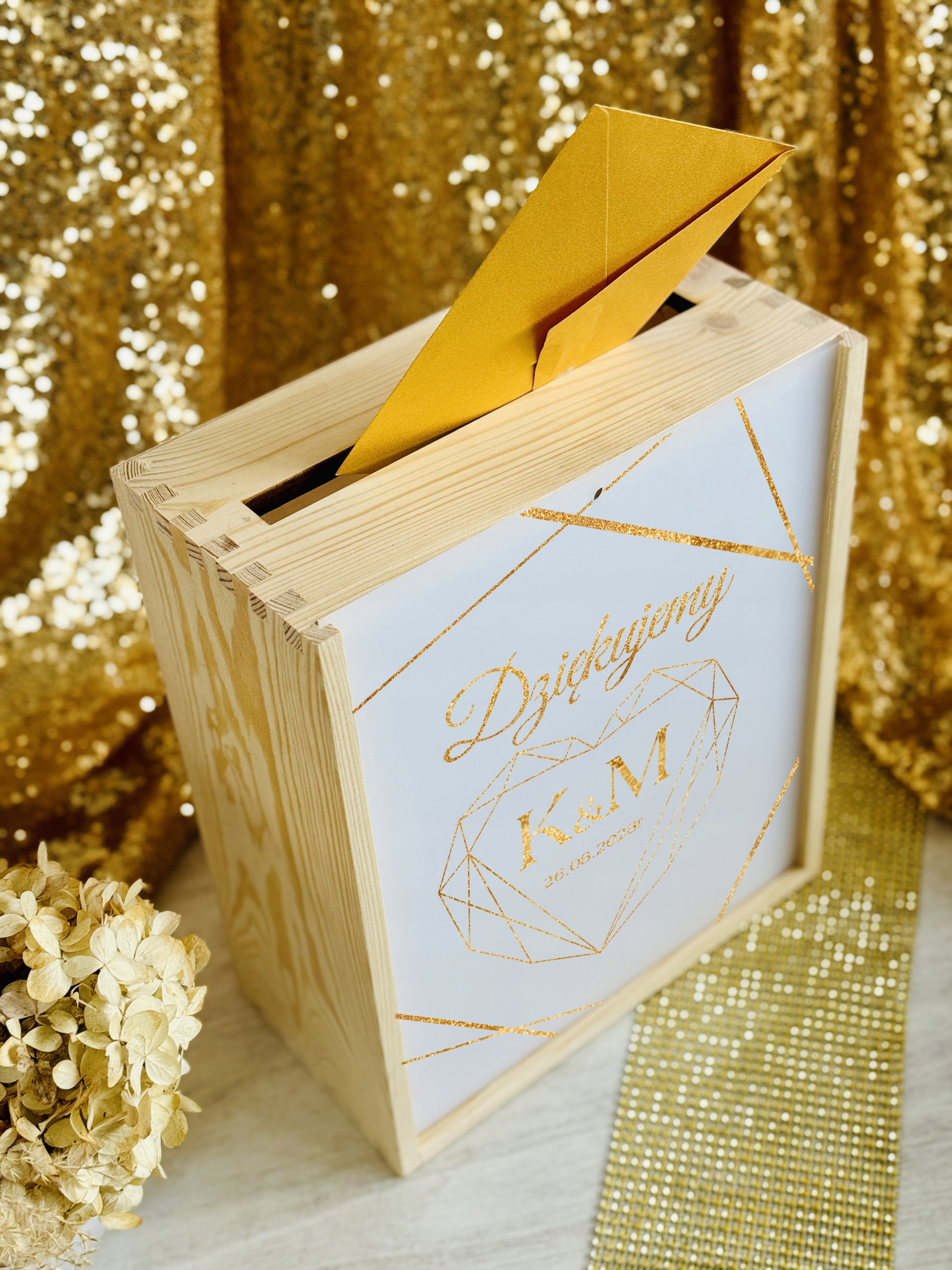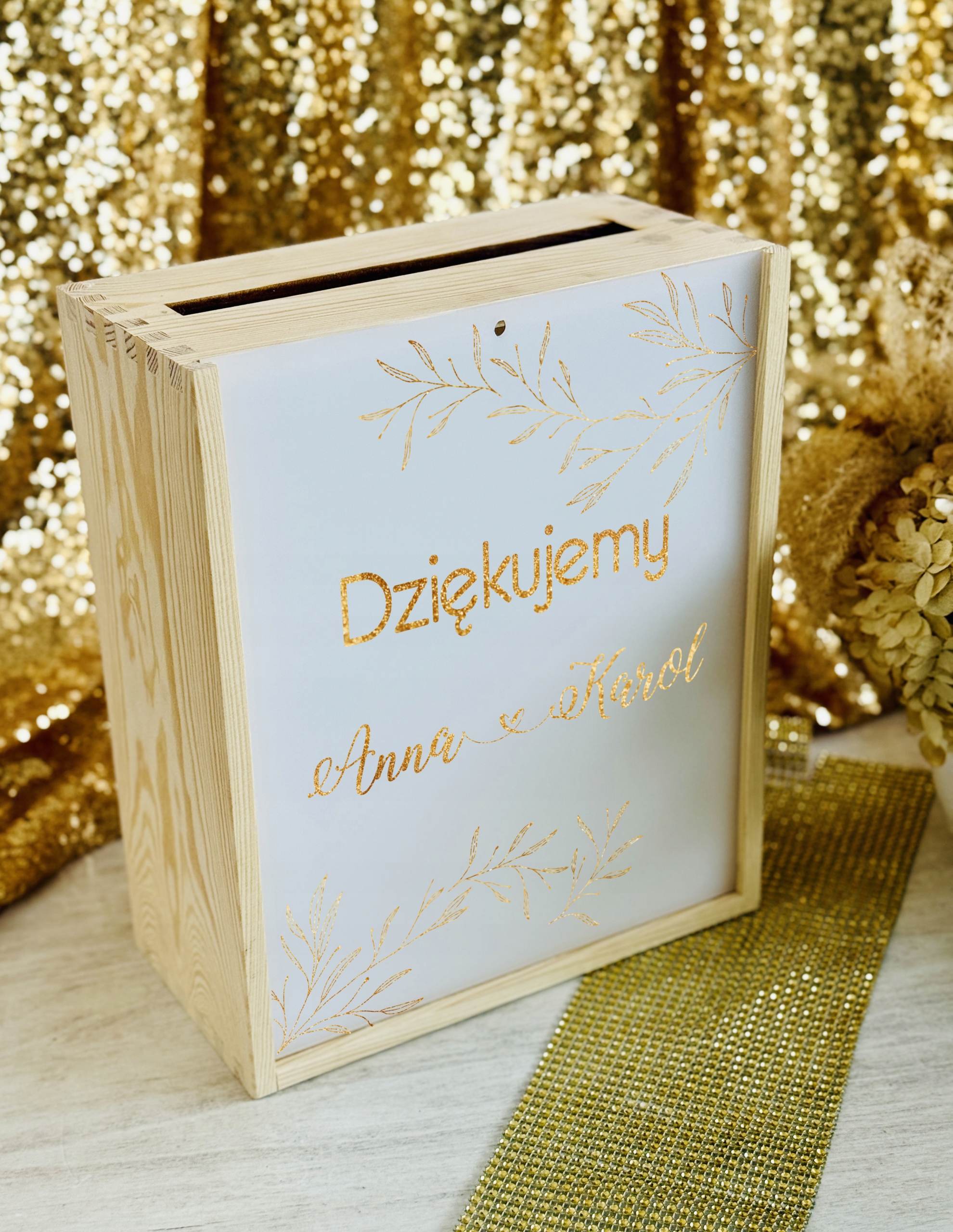 Pudełko posiada wygodny otwór w górnej części, dzięki któremu goście mogą w dyskretny i estetyczny sposób przekazać swoje życzenia. Subtelne zdobienia oraz możliwość personalizacji (np. imionami Pary Młodej, datą ślubu lub krótkim napisem) sprawiają, że stanowi piękną pamiątkę na długie lata.