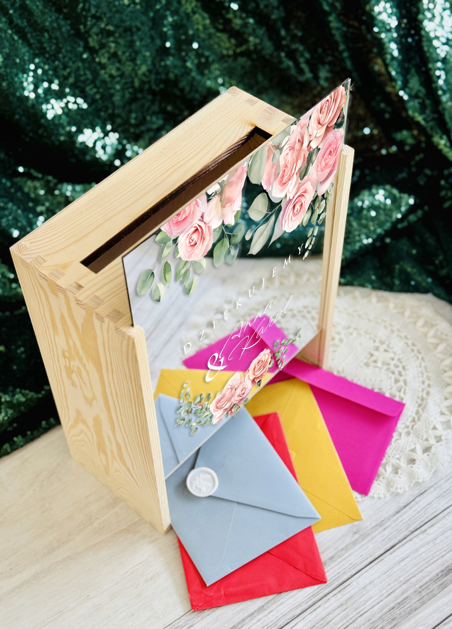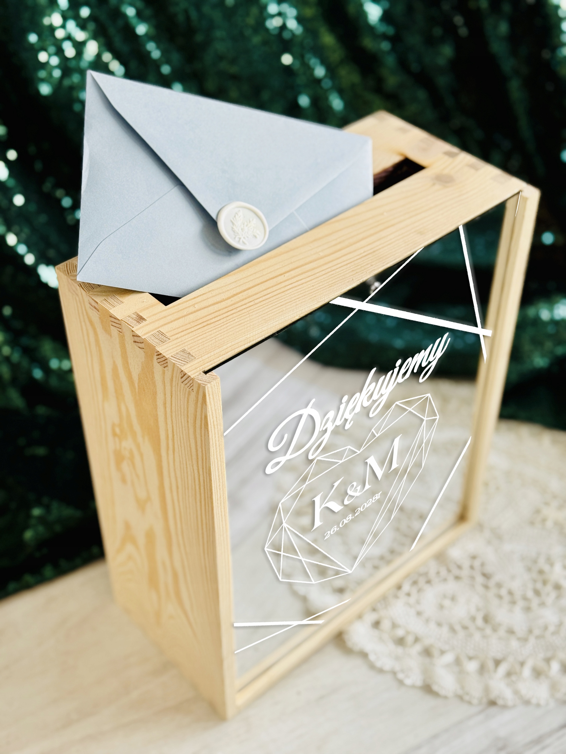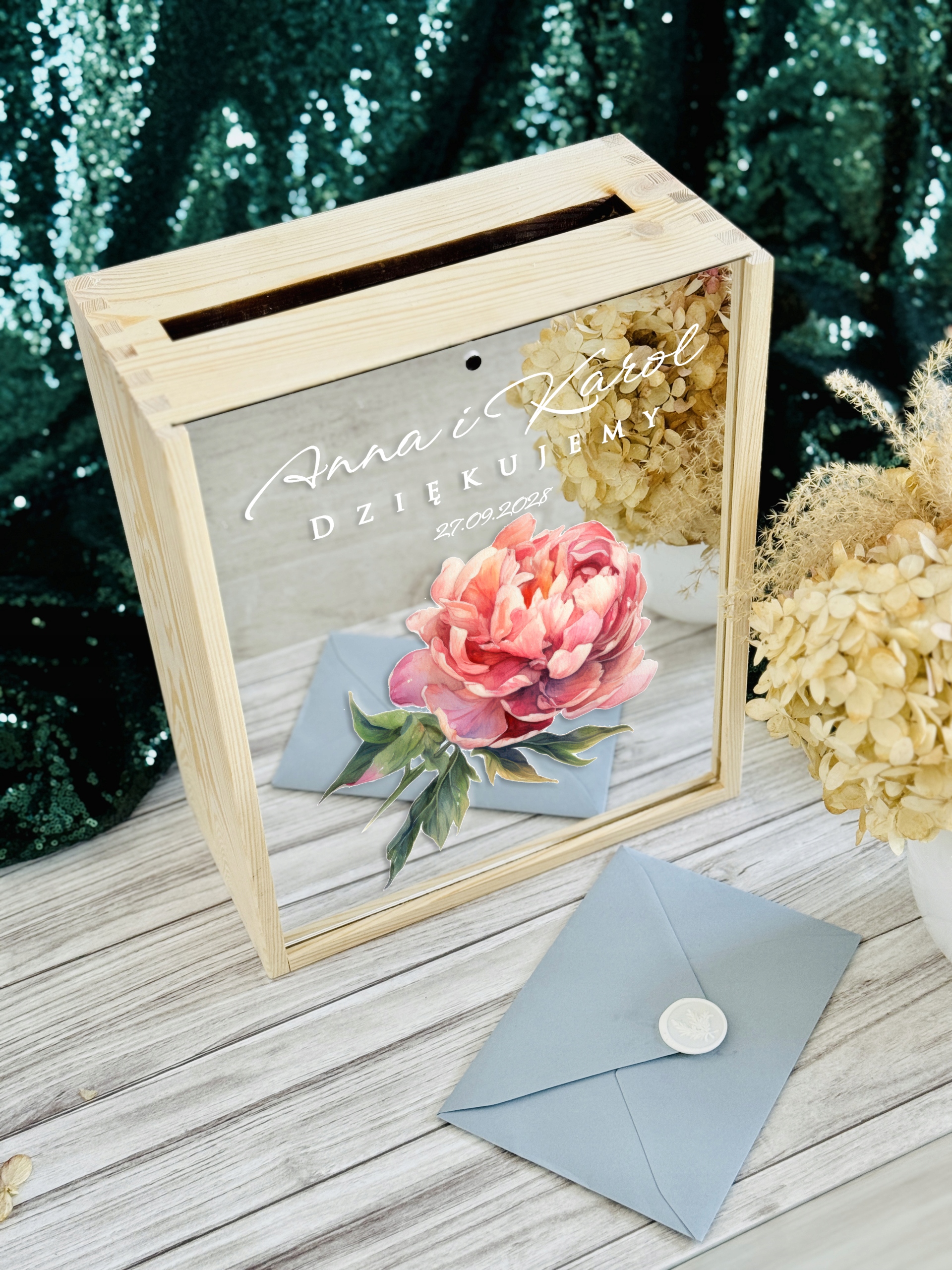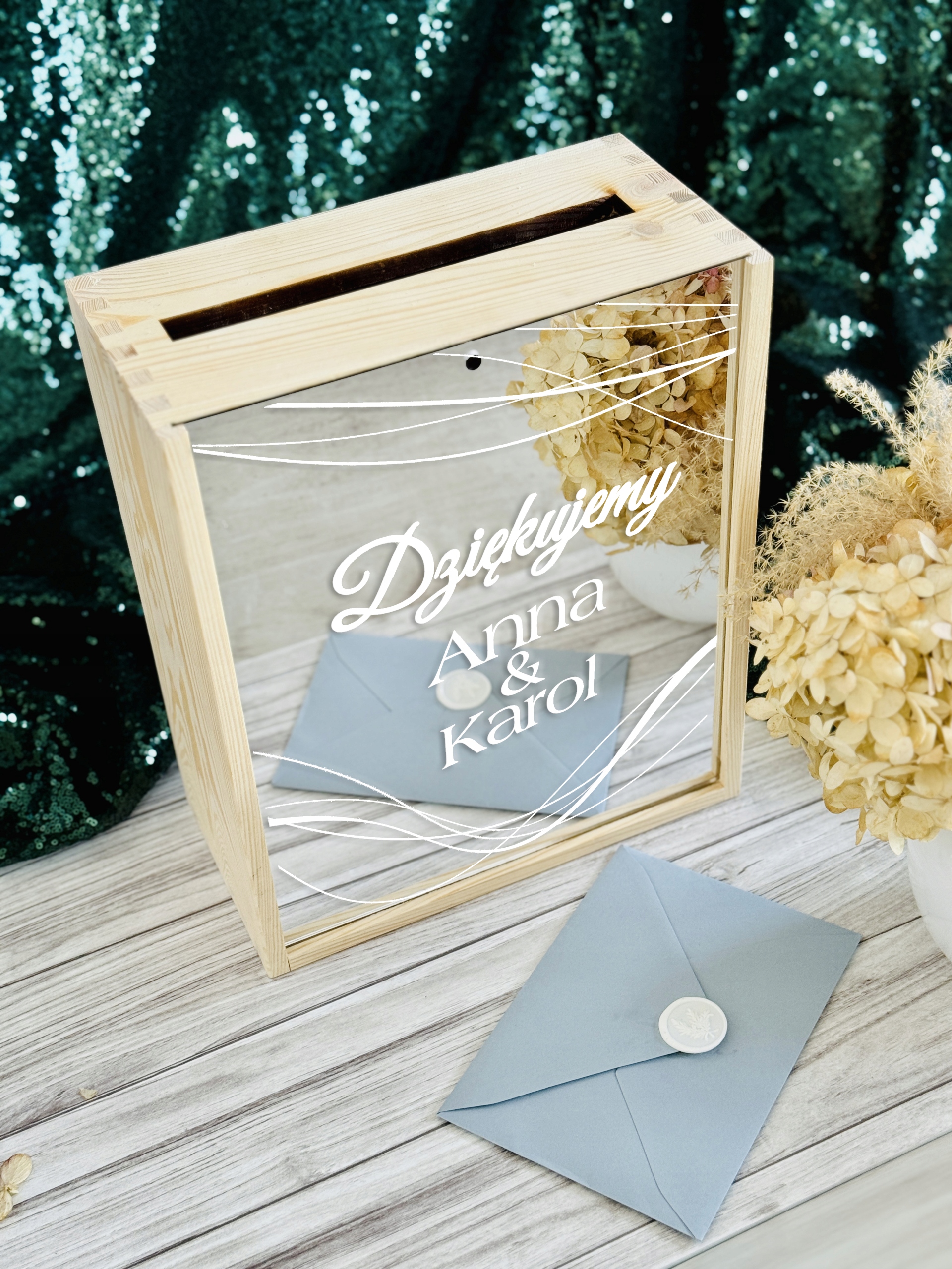 Eleganckie pudełko na koperty weselne to nie tylko praktyczny dodatek, ale również wyjątkowa dekoracja, która idealnie wpisuje się w oprawę uroczystości ślubnej. Wykonane z wysokiej jakości materiałów, zapewnia bezpieczne miejsce na kartki z życzeniami oraz koperty z prezentami od gości.