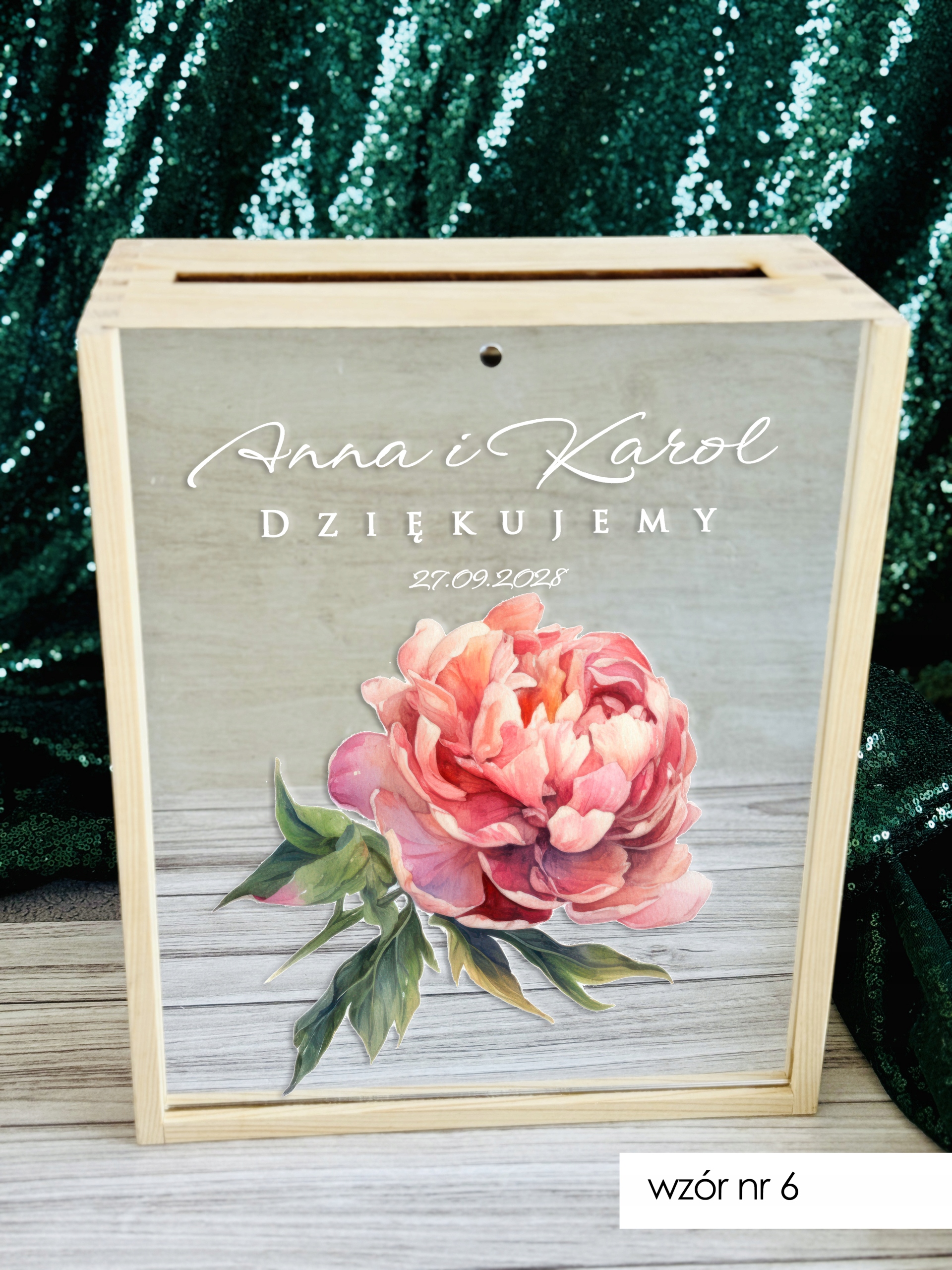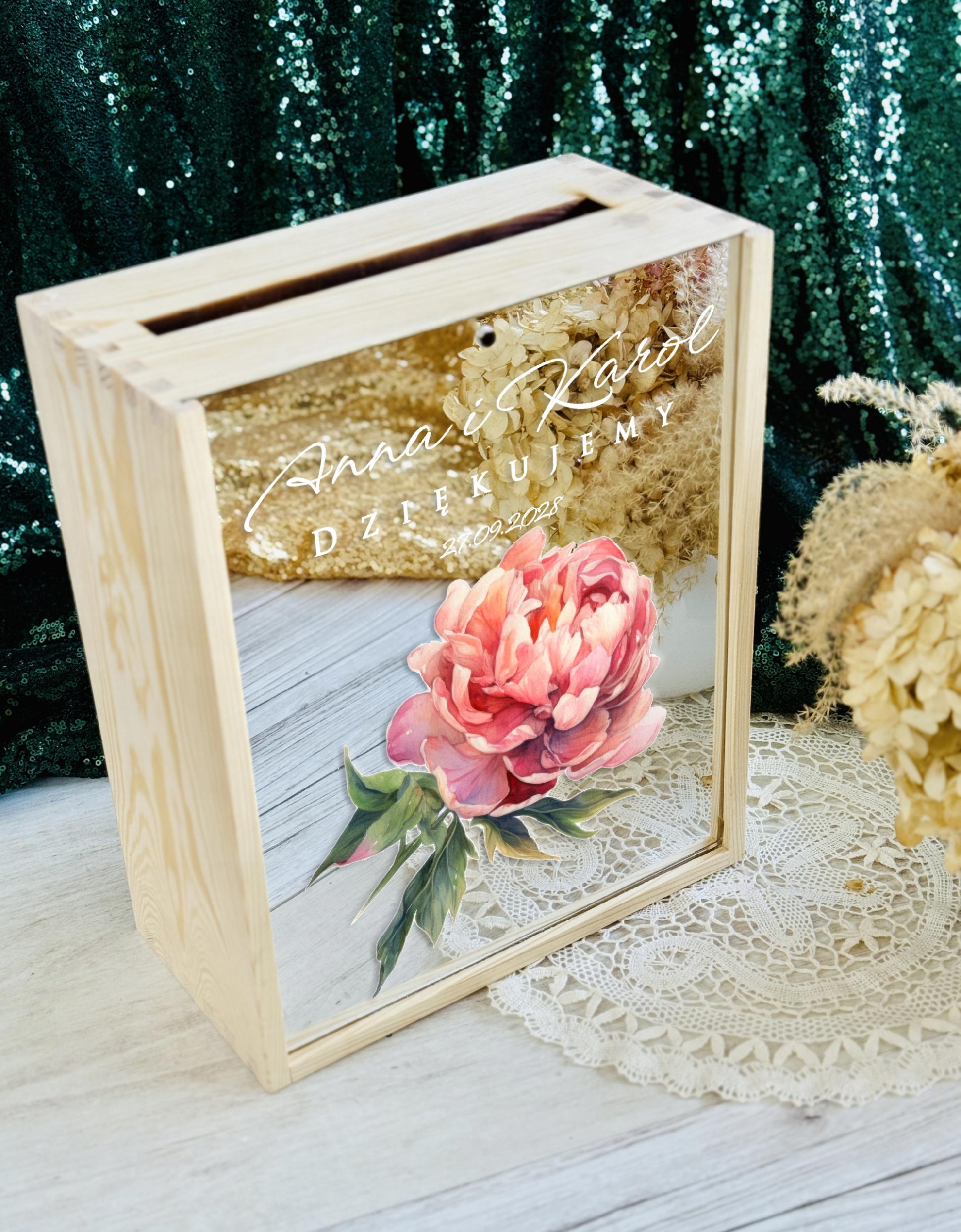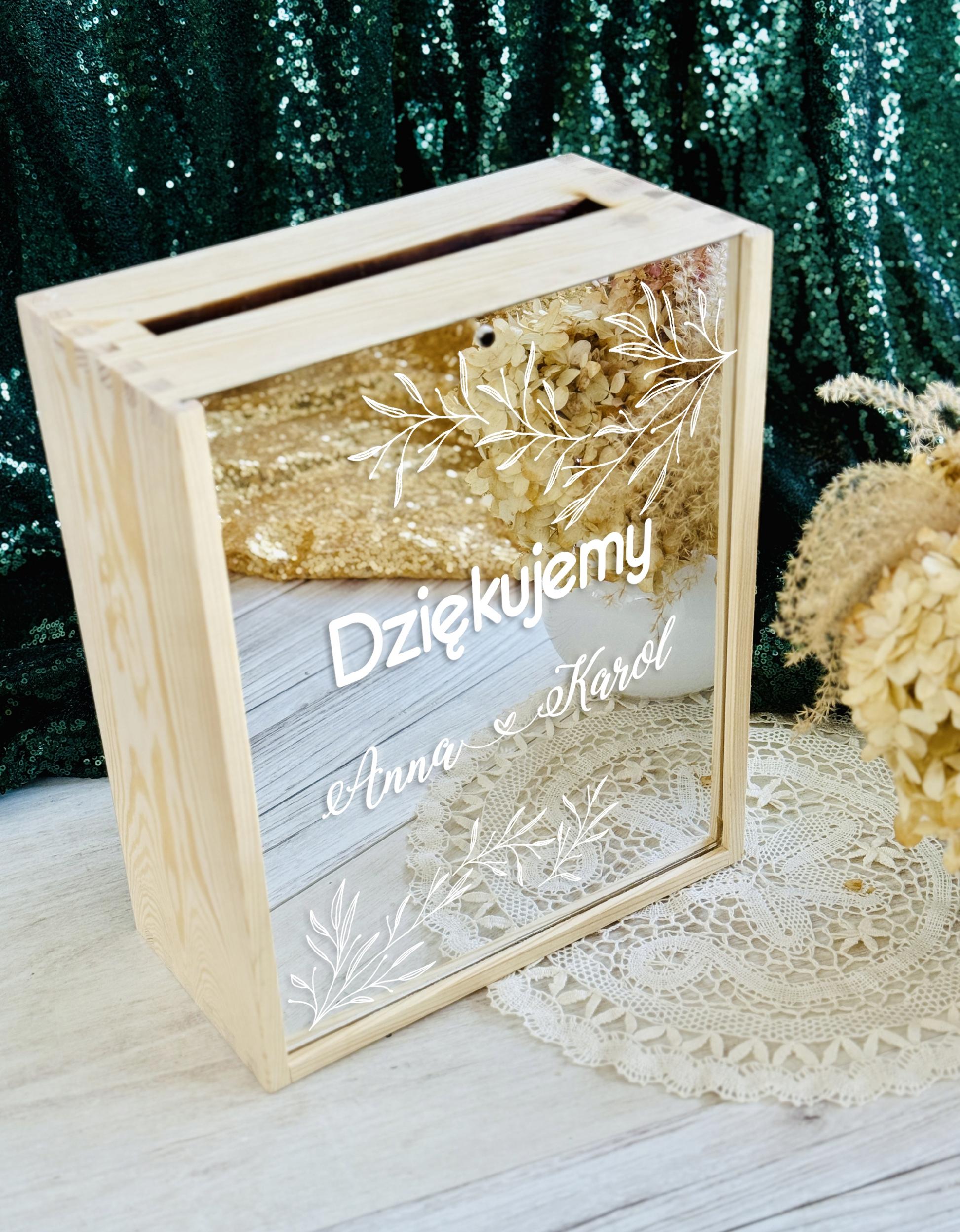 Pudełko posiada wygodny otwór w górnej części, dzięki któremu goście mogą w dyskretny i estetyczny sposób przekazać swoje życzenia. Subtelne zdobienia oraz możliwość personalizacji (np. imionami Pary Młodej, datą ślubu lub krótkim napisem) sprawiają, że stanowi piękną pamiątkę na długie lata.
