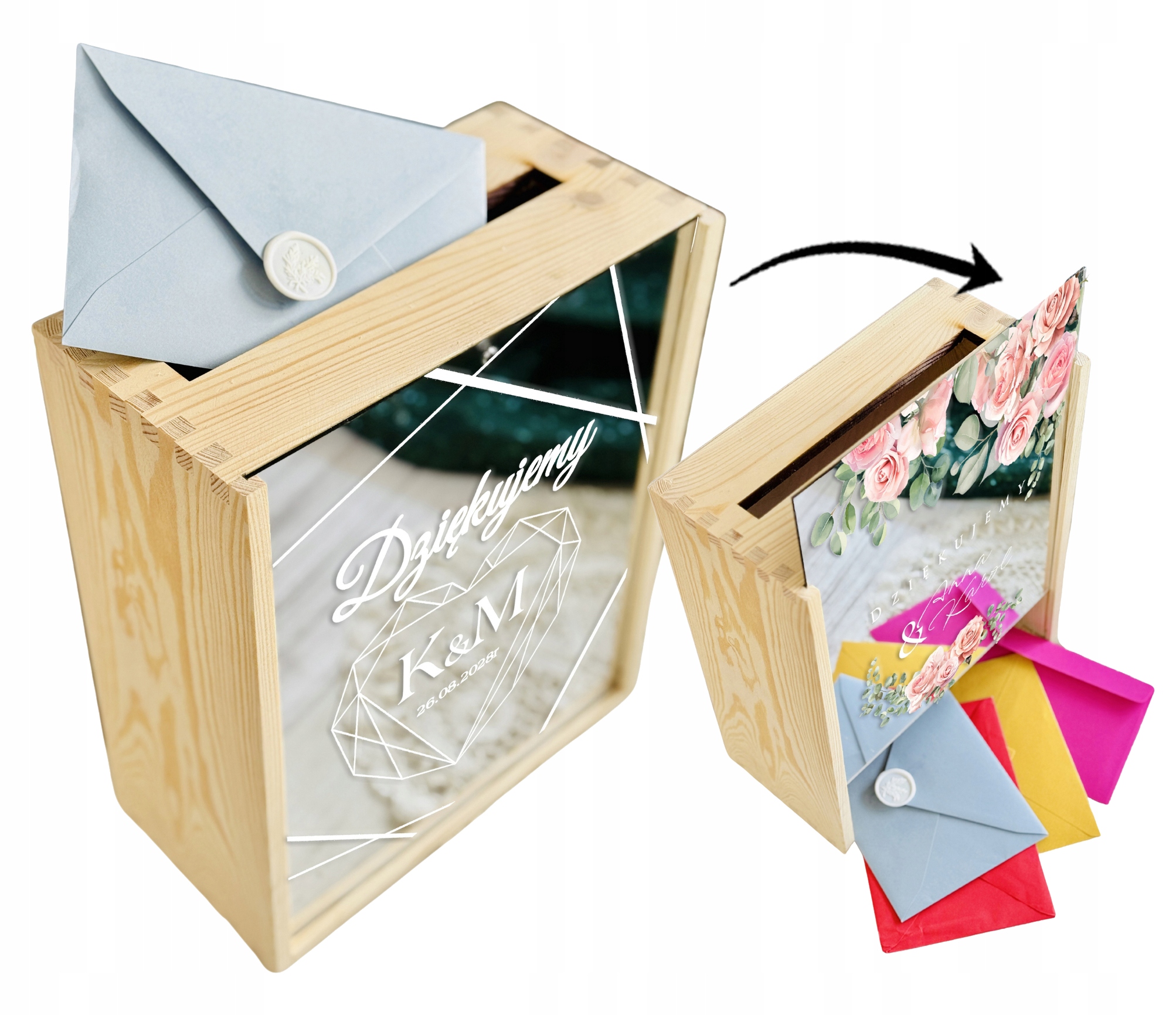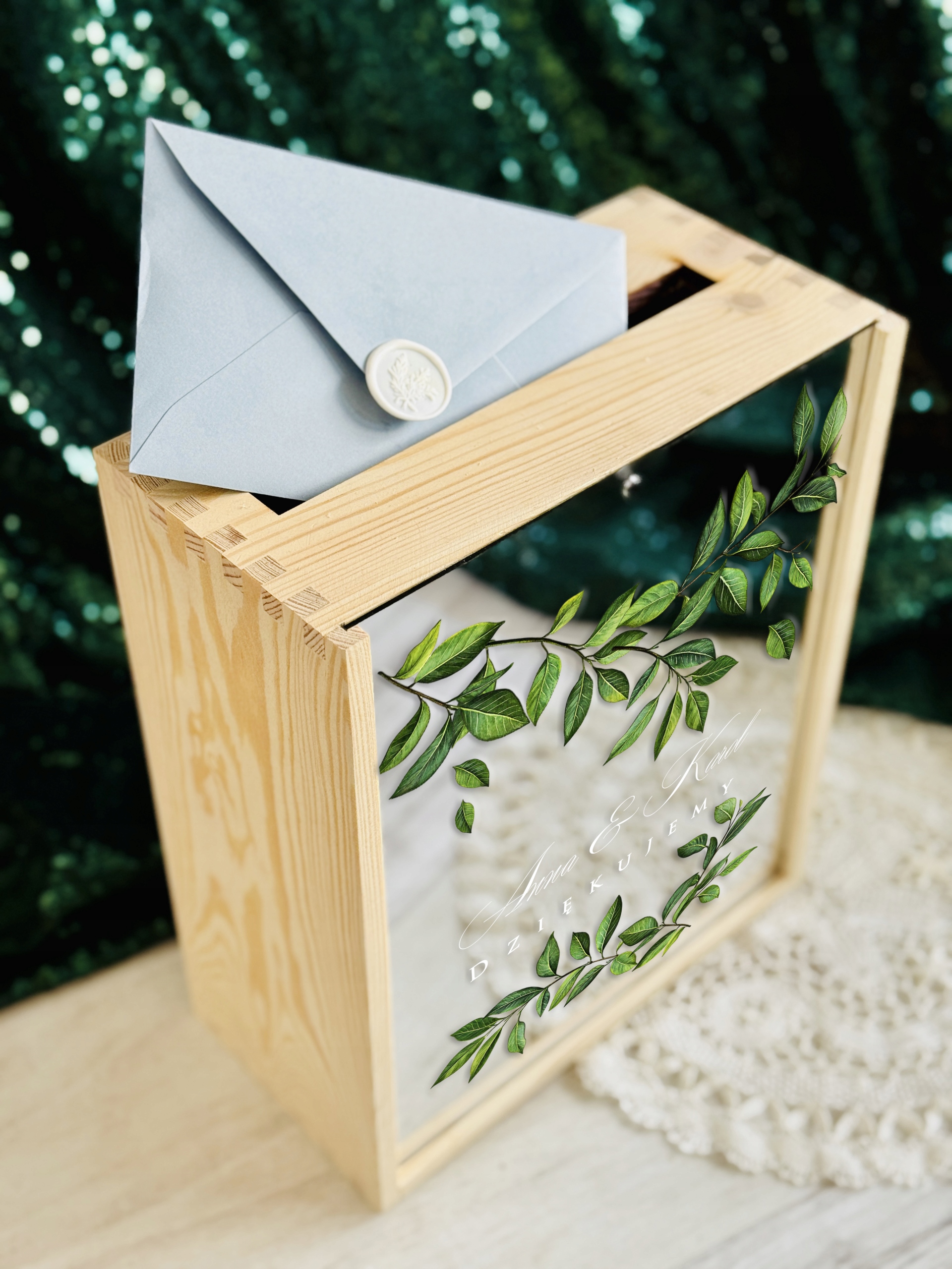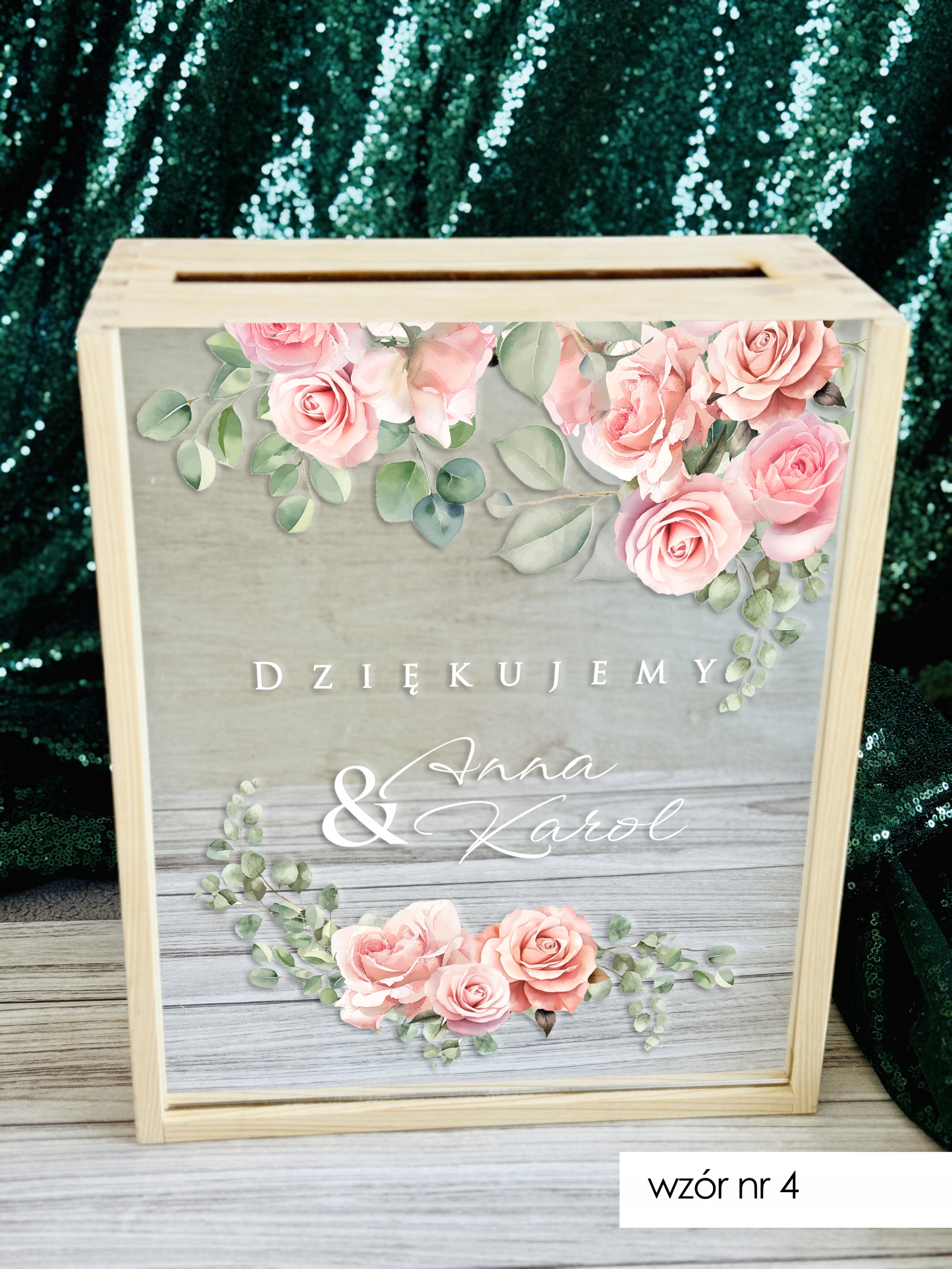 Pudełko posiada wygodny otwór w górnej części, dzięki któremu goście mogą w dyskretny i estetyczny sposób przekazać swoje życzenia. Subtelne zdobienia oraz możliwość personalizacji (np. imionami Pary Młodej, datą ślubu lub krótkim napisem) sprawiają, że stanowi piękną pamiątkę na długie lata.