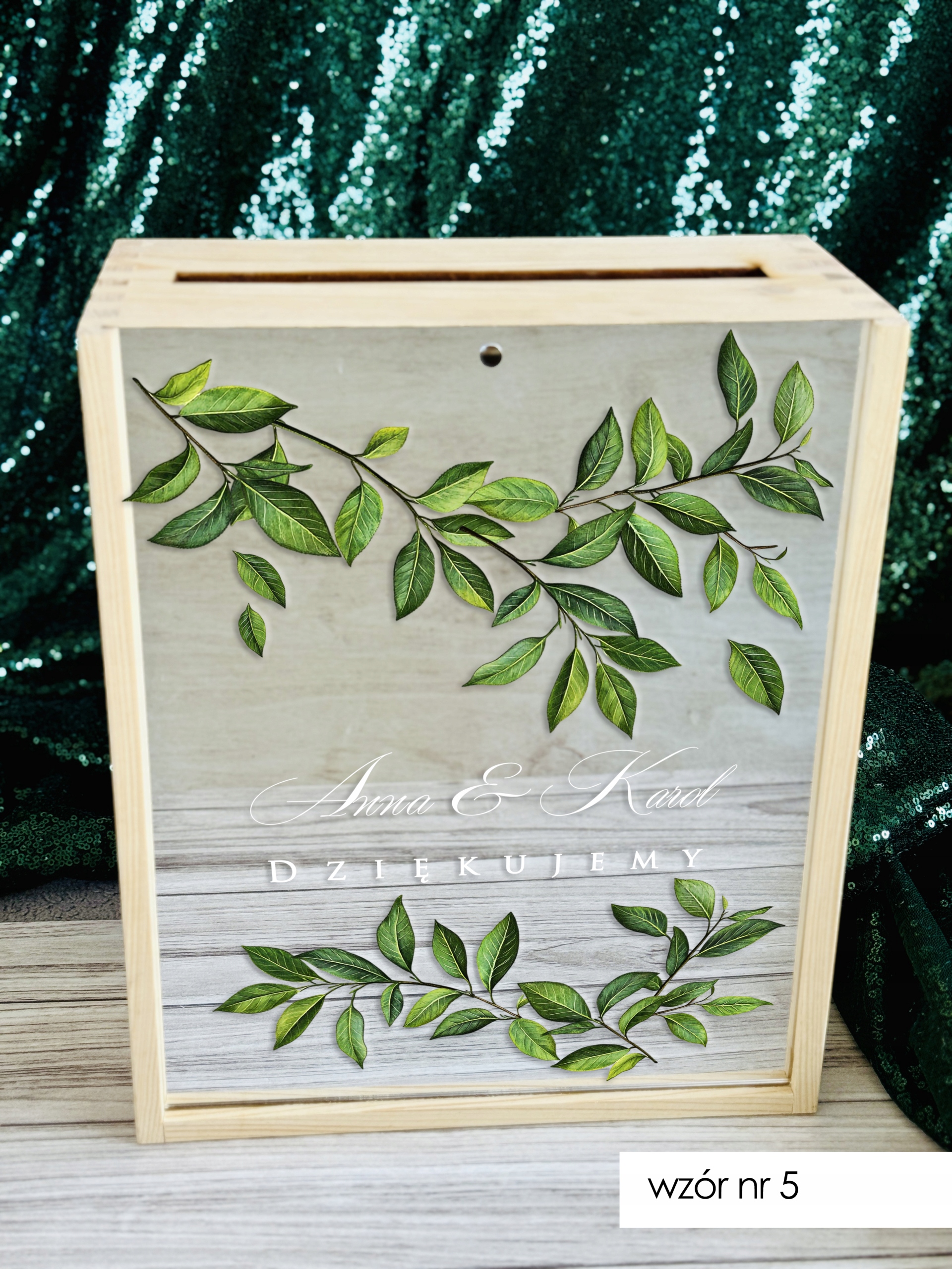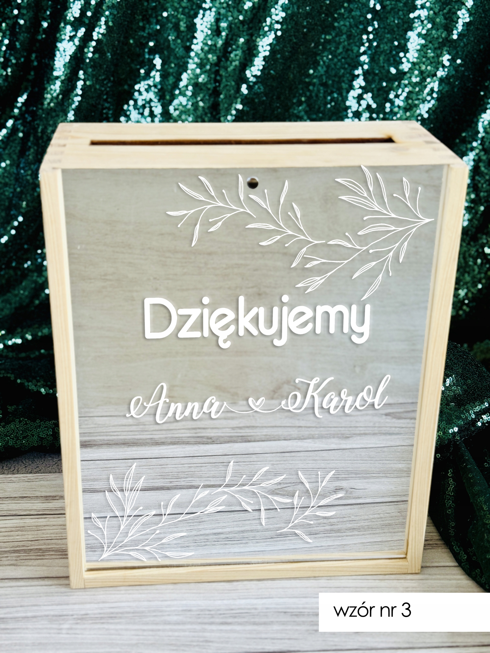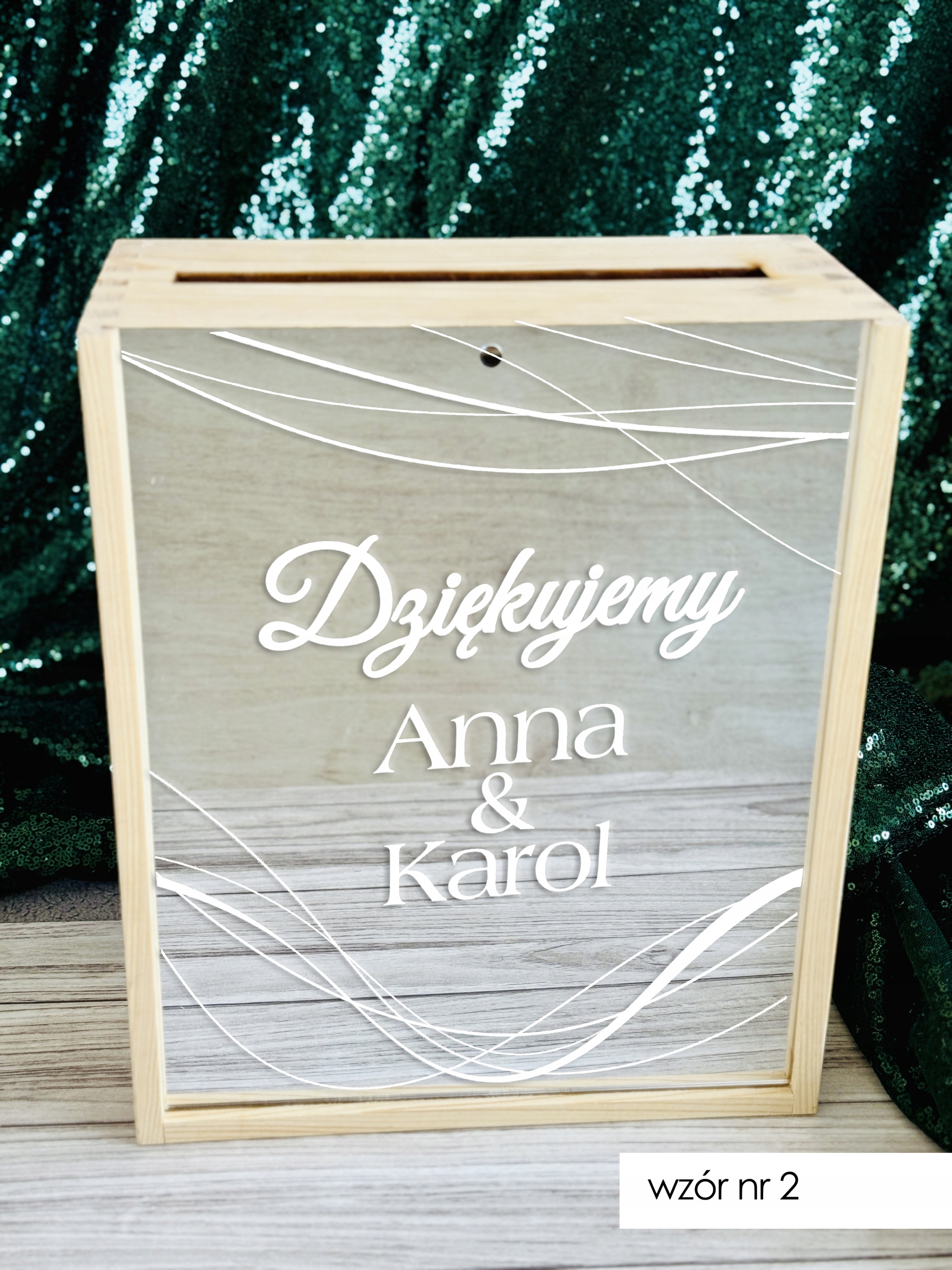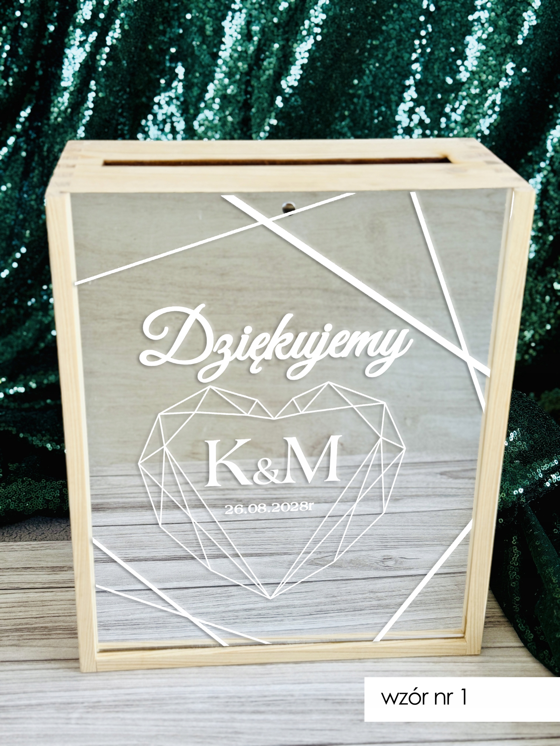 - W wiadomości do sprzedającego podaj numer wzoru jaki wybierasz oraz imiona/ inicjały oraz datę jaka ma znaleźć się na froncie skrzynki