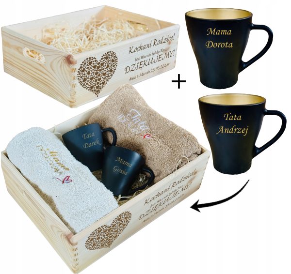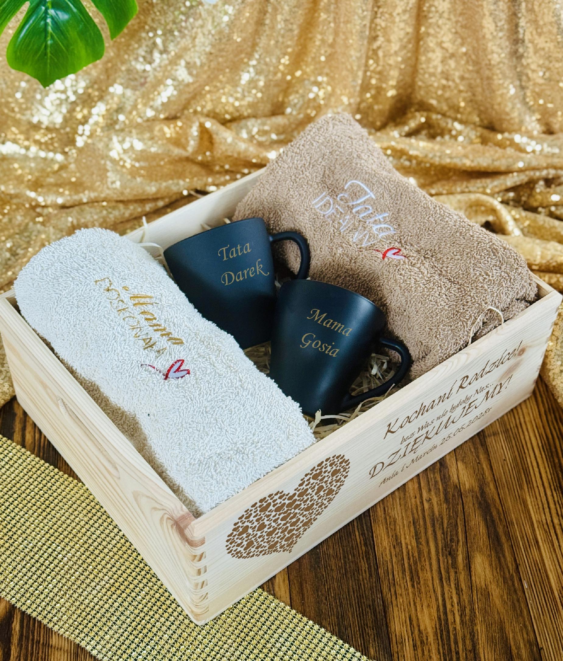 SKRZYNKA XXL Kosz PODZIĘKOWANIA DLA RODZICÓW ręczniki kubki czarne + GRAWER