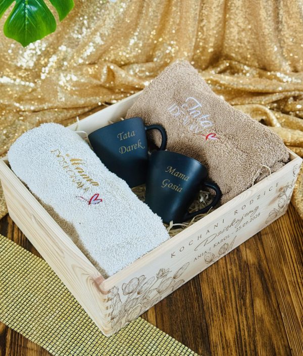 Szukasz niebanalnego sposobu, by podziękować rodzicom w dniu ślubu? Ta drewniana skrzynia prezentowa to wyjątkowy sposób, by wyrazić wdzięczność i miłość. Wykonana z naturalnego drewna, zachwyca swoją prostotą i elegancją. Wypełniona mięciutkimi ręcznikami ze specjalną haftowaną dedykacją “Mama doskonała” i “Tata idealny” oraz grawerowanymi kubkami to oryginalny pomysł  na praktyczny upominek.