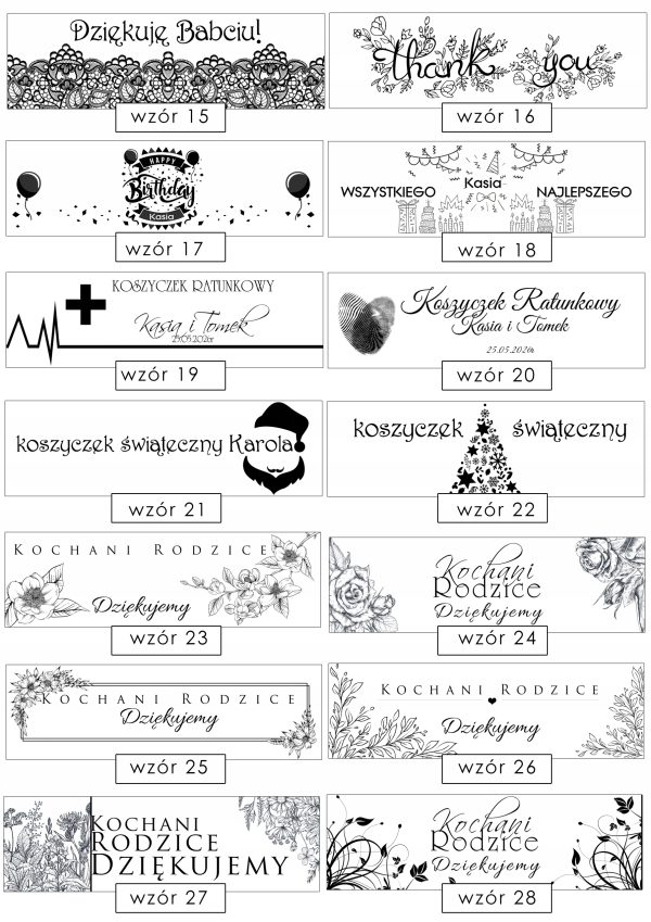 • jeżeli chcecie własny tekst prosimy poinformujcie nas o tym np. skrzynia: wzór 9, Kochana Mamo Dziękujemy, Ania i Łukasz, 26.08.2026r. kubki: Mama Kasia, Tata Andrzej