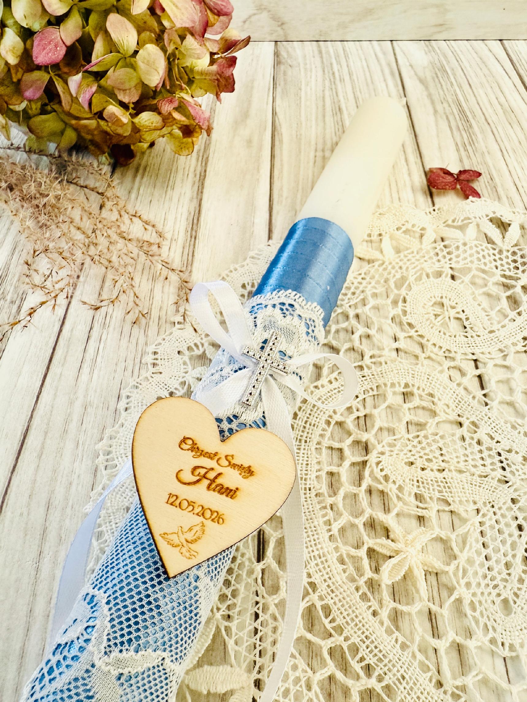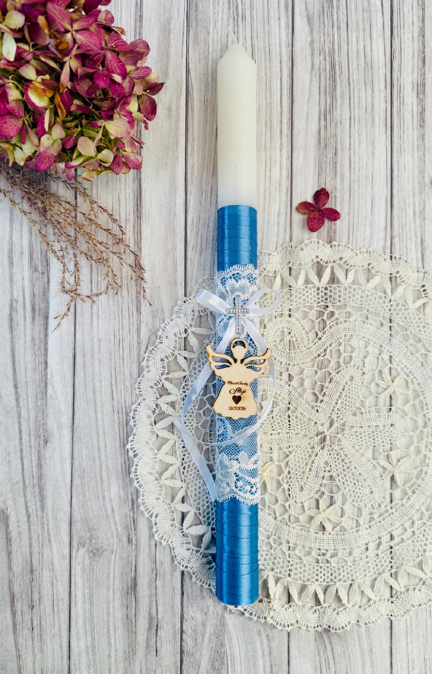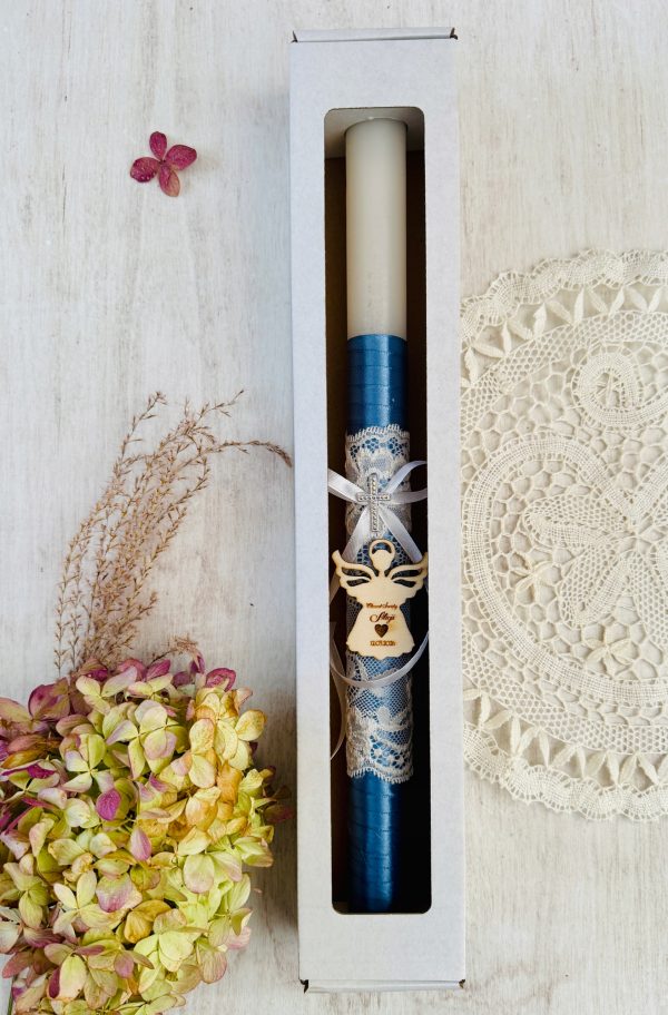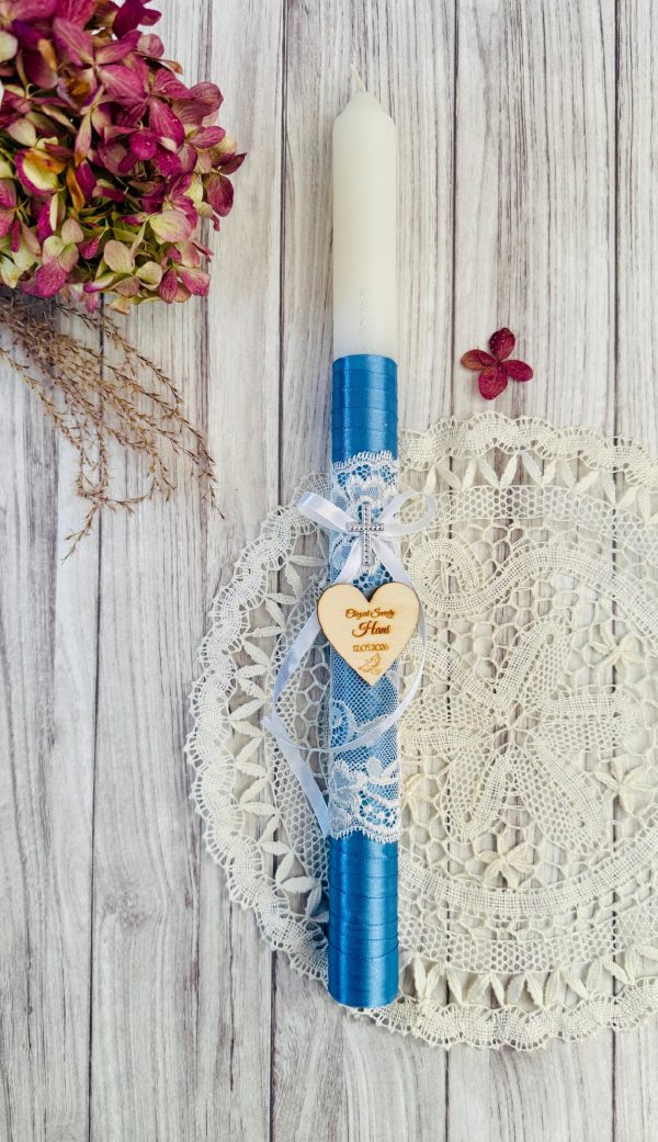 Świeca do CHRZTU GROMNICA na komunię ręcznie zdobiona satyna niebieska IMIĘ
